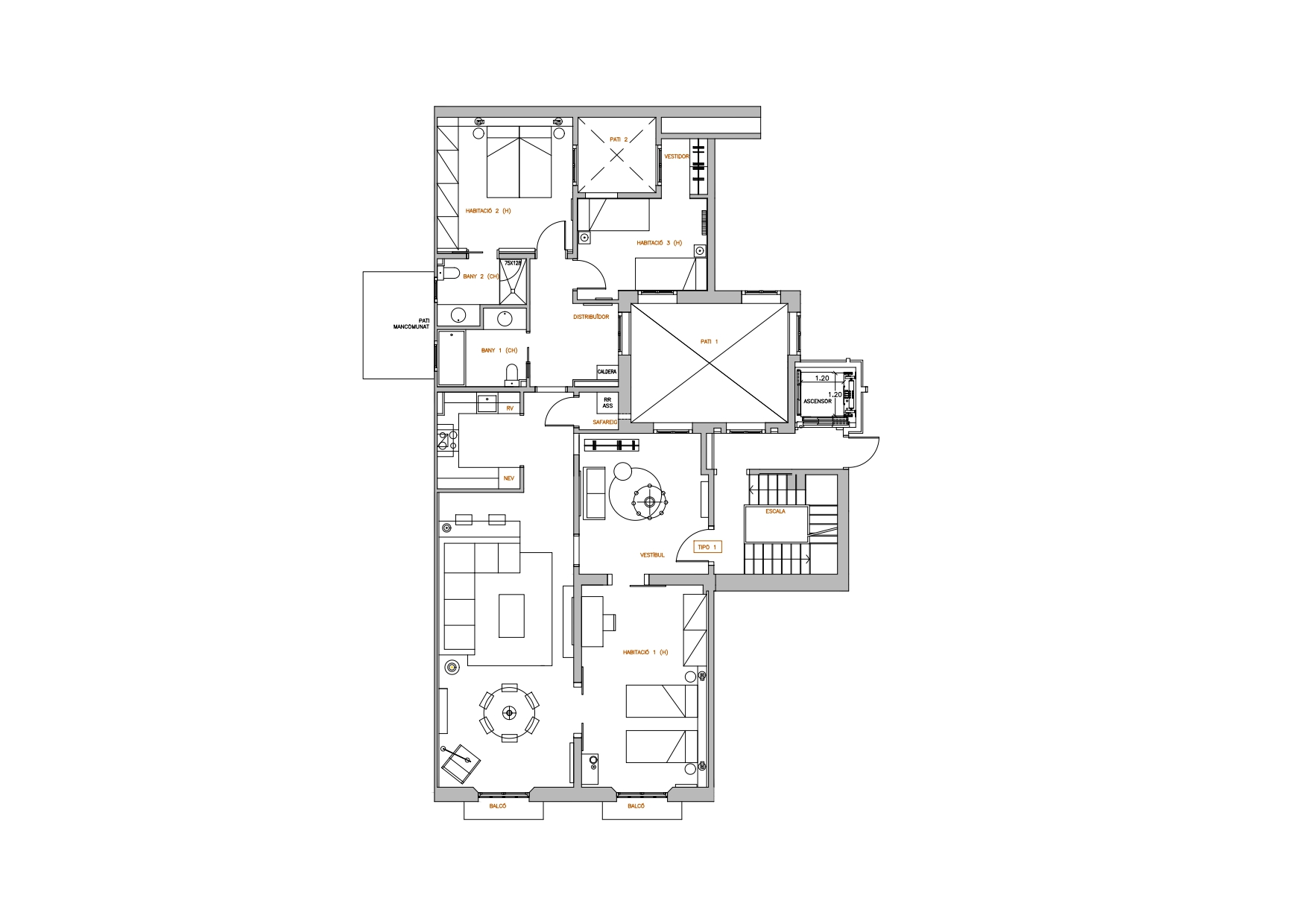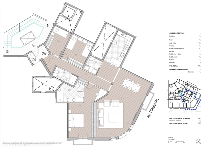 This marvellous property has an excellent location in Barcelona and is part of a comprehensive refurbishment project in a 1910 building with luxury properties. The building is on the corner of Carrer Girona, which is being transformed into a pedestrian street and the works are almost finished, and Avinguda Diagonal, which is being transformed into a boulevard with a large pedestrian area, green areas and bicycle lanes, greatly reducing vehicle traffic. You will enjoy the best of Barcelona in an incomparable setting: in the heart of Eixample, very close to Paseo de Gracia, the city centre and all the shops and services. This first-floor property has 137.2 built interior sqm and 2 balconies totalling 3 sqm. A private entrance hall leads to the entrance hall and the hallway, which leads to the large 45 sqm living-dining room with balcony. It's corner, has great natural light, which is atypical in the area, and unique views with a lot of depth. Thus, it creates an exceptional atmosphere that allows to clearly differentiate several areas. The kitchen is semi-open but occupies a very independent space, and next to it there is a laundry room. The night area comprises 3 bedrooms. The excellent master suite has an office area at the entrance, which distributes the private bathroom and the bedroom. It has a balcony overlooking the street. In addition, there is an interior double bedroom and a medium-sized bedroom and a separate bathroom. This property is scheduled to be completed in the fourth quarter of 2024 and the keys will be handed over in the first quarter of 2025. It will have materials and finishings of the highest quality, as well as an interior design that will combine the classic elements of the regal estate buildings with the most modern. Large spaces and brightness will be important, achieving a balance between traditional elements such as the restored Catalan vaulted ceilings and the comfort and amenities of a new building: underfloor heating, hot and cold air conditioning powered by aerothermics (the latest technology in air conditioning systems that produces energy savings of between 60% and 70% compared to conventional systems), top-of-the-range electrical appliances, natural wood floors, entrance door with security lock, built-in wardrobes, porcelain tiling on the bathroom walls, LED lighting, fibre optic connection, Internet and television signal sockets, etc. The building, which will be fully refurbished, will have 2 lifts (the original one restored respecting its wooden cabin with a new mechanism and a completely new one), a concierge, an area for charging electric bicycles and a private modernist-vintage style gym with 2 toilets. The large main façade of the building, as well as the numerous inner courtyards and the rear façade, provide the building with excellent lighting and ventilation. The unusual distance to the buildings parallel to the façade further enhances the feeling and perception of spaciousness. As this is a modernist building with important historical value, the interior design team has prioritised the recovery of some of the original elements. For example, a complete restoration and rehabilitation of the modernist stuccoes of the staircase core has been carried out; and in the independent vestibules, recovered hydraulic mosaic tiles will be installed to maintain the historical value of the property. In addition, the exterior joinery has been replaced with wooden windows and balconies with thermal break and laminated insulating glass. This new development has 1, 2 and 3 bedroom apartments with prices starting at 522.000 €, 626.000 € and 958.000 €, respectively. Do not hesitate to contact Bcn Advisors for more information. * The renderings and square metres in this listing may be subject to change. These images are merely informative and may change depending on the needs of the clients or changes that may be made during the execution process of the refurbishment project and/or project works. * The floorplan and the content of this listing are not a contractual document, it's part of the executive project and may be subject to modifications due to technical requirements, administration or public organisations. The surfaces will be provisional. The furniture (including the kitchen), gardening and accessory elements are only illustrative.