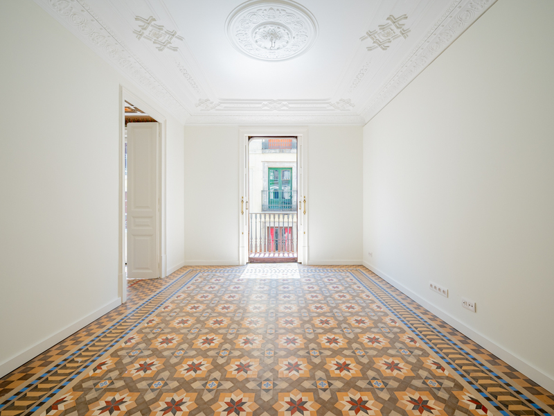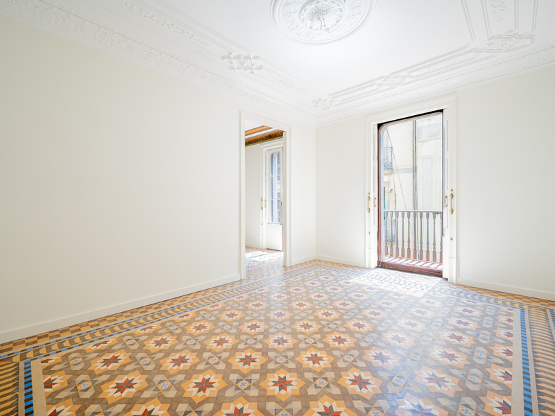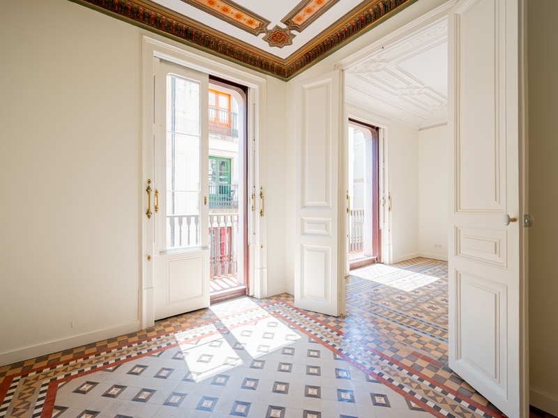 This wonderful refurbished flat with original modernist features is located in the heart of Barcelona, in one of the best streets of the Gothic Quarter, just a few steps from the Liceu Theatre, the Basilica of Santa Maria del Pi and the Plaza de Sant Jaume. It's located on the 3rd floor of a listed building of great architectural value, with a lift. The property stands out for its beautiful hydraulic floors of Nolla mosaic and the high ceilings of 3,5 metres that give a unique sensation of spaciousness. The building only has 4 floors, so this flat only has one property above it. This fact, together with the large interior courtyards of the property, gives it a great brightness. This flat has 153 built interior sqm. A large entrance hall welcomes us and leads us to the spacious day area, divided into two different but interconnected spaces: living room and dining room with open-plan kitchen. Each area has a balcony overlooking the street, guaranteeing the entry of natural light. Here there is also a small room that can be used as a storage room. The night area has 3 bedrooms and 3 bathrooms. The wonderful master bedroom is en suite with private bathroom and dressing room. Next to it there's a spacious double bedroom and a separate bathroom. In the central part of the flat there is a medium sized bedroom and another bathroom. The refurbishment has been carried out with top quality materials and design by a renowned team of interior designers. The flat is equipped with ducted hot/cold air conditioning and restored double glazed windows and doors. The building is beautiful, with a large noble entrance door, the staircase intact with original finishes and a communal roof terrace with excellent views over the historic centre of Barcelona. The lift has been perfectly integrated respecting the history of the building. In this apartment you will be able to enjoy all the history of Barcelona in the surrounding area, with its traditional streets and squares. It also has numerous shops and services, bars and restaurants, theatres and an excellent public transport connection. Do not hesitate to contact Bcn Advisors to visit this property.