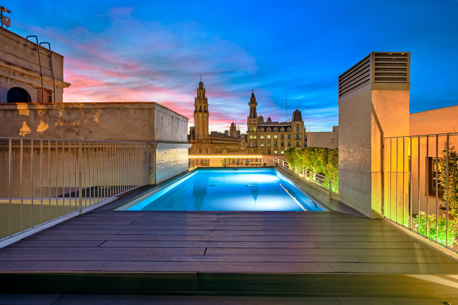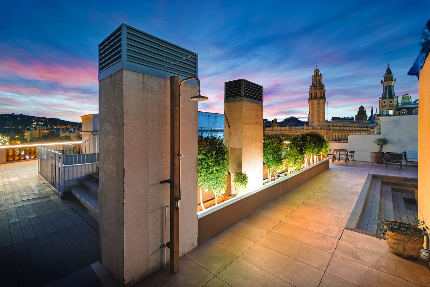 The sleeping area consists of 3 double bedrooms and 2 full bathrooms. The hallway or living room leads to an exterior bedroom with a balcony. At the other end of the flat are 2 interior bedrooms: one en suite and the other with a dressing area, as well as a separate bathroom. For relaxation without leaving home, the communal rooftop is a true urban oasis, ideal for gatherings, meals, enjoying the pool or simply unwinding.