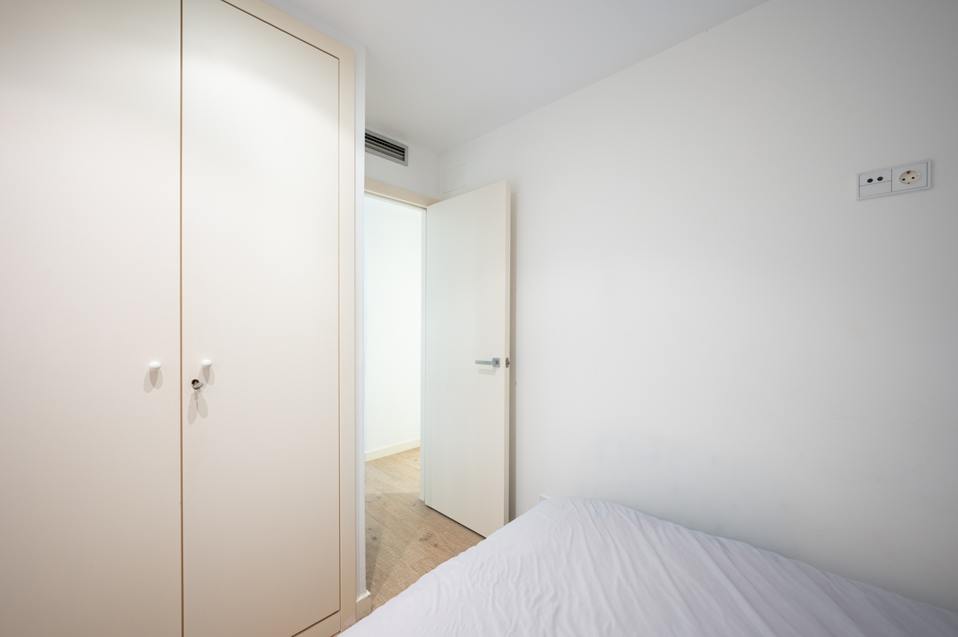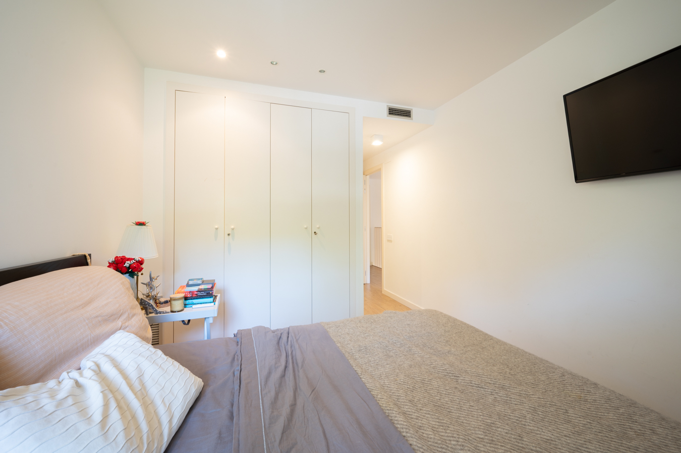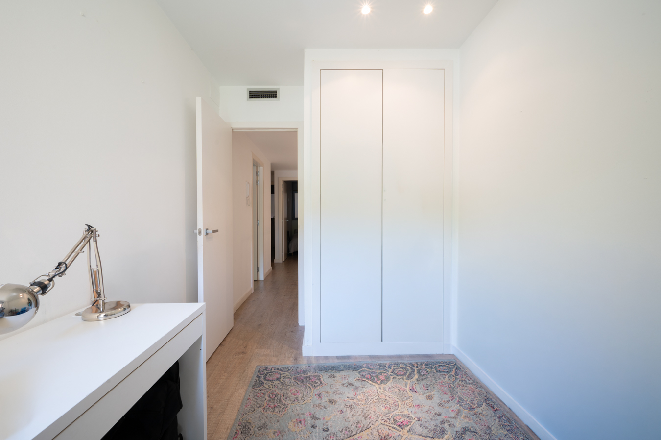 This penthouse with 110 built interior sqm and a 28 sqm terrace is located very close to Plaza Glòries, La Sagrada Familia, Arc de Triomf and Gran Via. The area has all the necessary shops and services for day to day life, green areas in the surroundings and a wide range of public transport. The penthouse has a large entrance hall and, through a corridor, we reach the living-dining room. It's a spacious, bright and quiet room with access to a lovely terrace, an excellent place to enjoy outdoor gatherings with views of the Sagrada Familia, the city and the mountains. Its south orientation is perfect to enjoy natural light almost all day long. The kitchen is open to the hallway. As for the bedrooms, there is an en-suite bedroom next to the living room, with its own bathroom and access to the terrace; a large double bedroom with built-in wardrobe next to the hallway and a complete bathroom that serves it. There's also a laundry room and a storeroom. It's worth noting that it would be possible to convert the second bedroom into 2 single bedrooms. The penthouse, on the 9th floor, is in perfect condition thanks to its modern renovation and is equipped with ducted hot/cold air-conditioning. It's possible to buy the furniture separately as an option. Do not hesitate to contact Bcn Advisors to visit this penthouse.