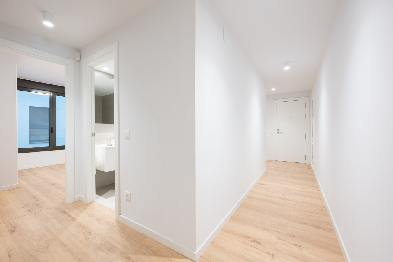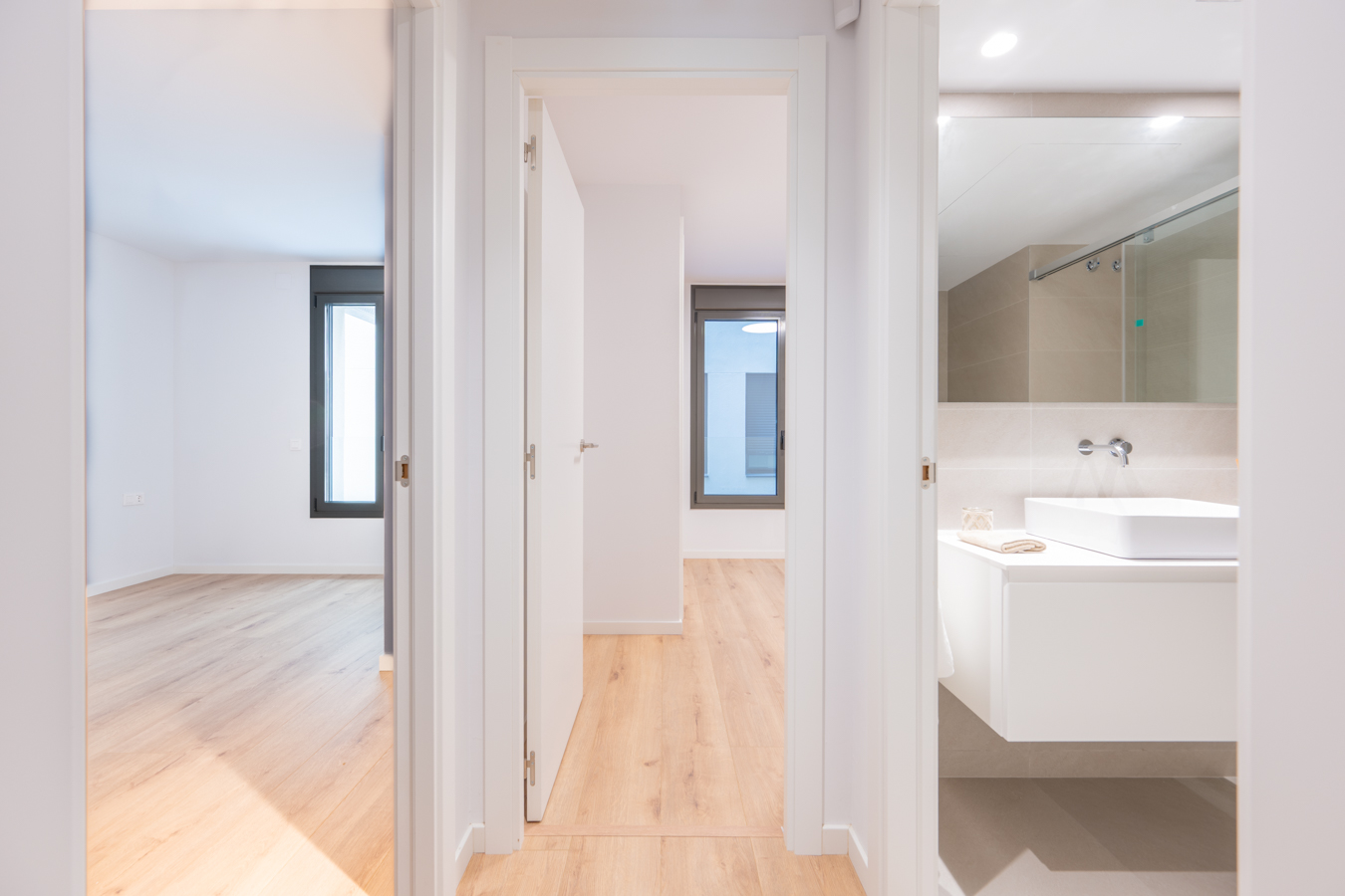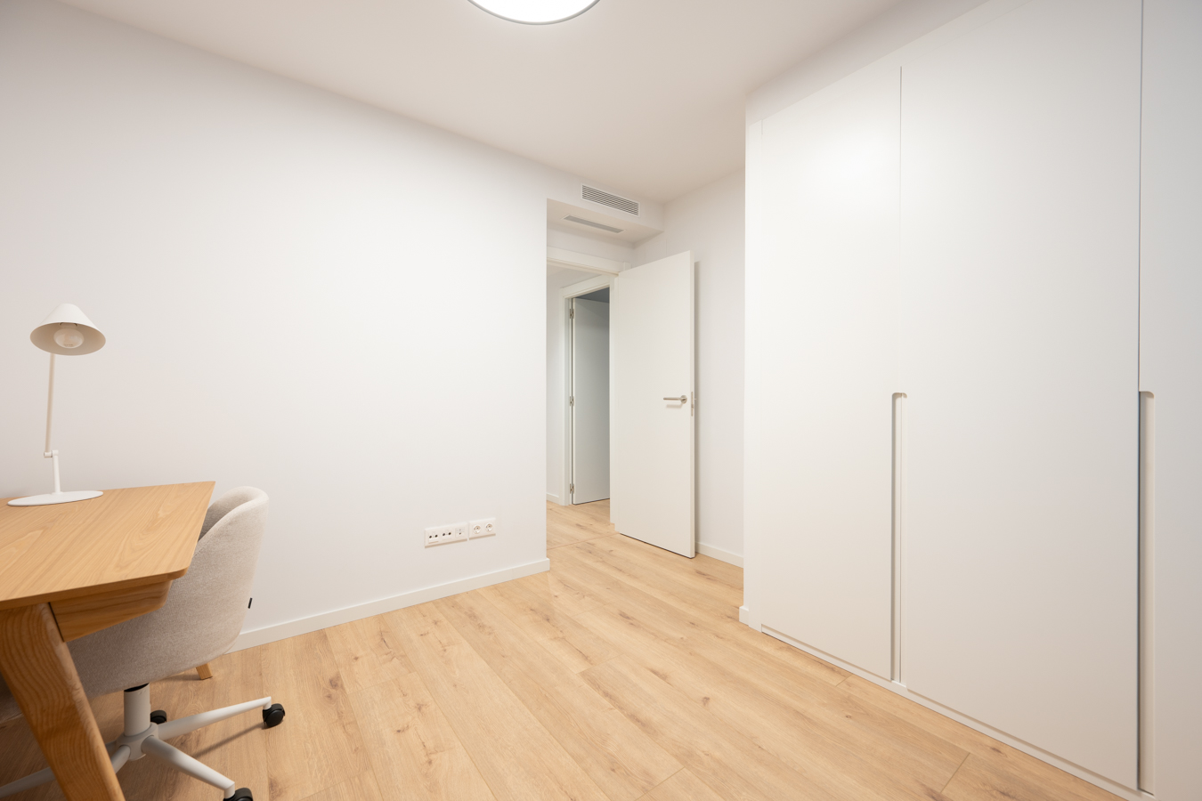 Every detail has been designed to offer comfort, efficiency and quality. The Panasonic aerothermal air conditioning system reduces energy consumption by up to 70% compared to traditional systems. Movable metal shutters protect the openings, double-glazed Climalit windows ensure perfect thermal and acoustic insulation, and lacquered aluminium joinery with thermal break reinforces energy efficiency. The floors combine AC5 laminate parquet in the main rooms and porcelain tiles in the bathrooms. The kitchen is equipped with Siemens appliances and Rovira taps, and the front door has a three-point security lock and video intercom.