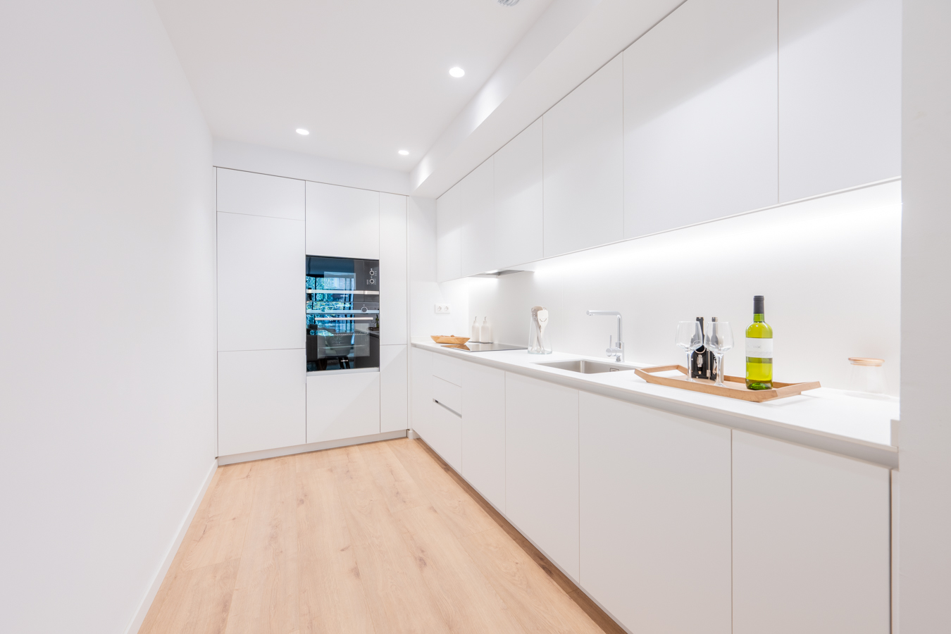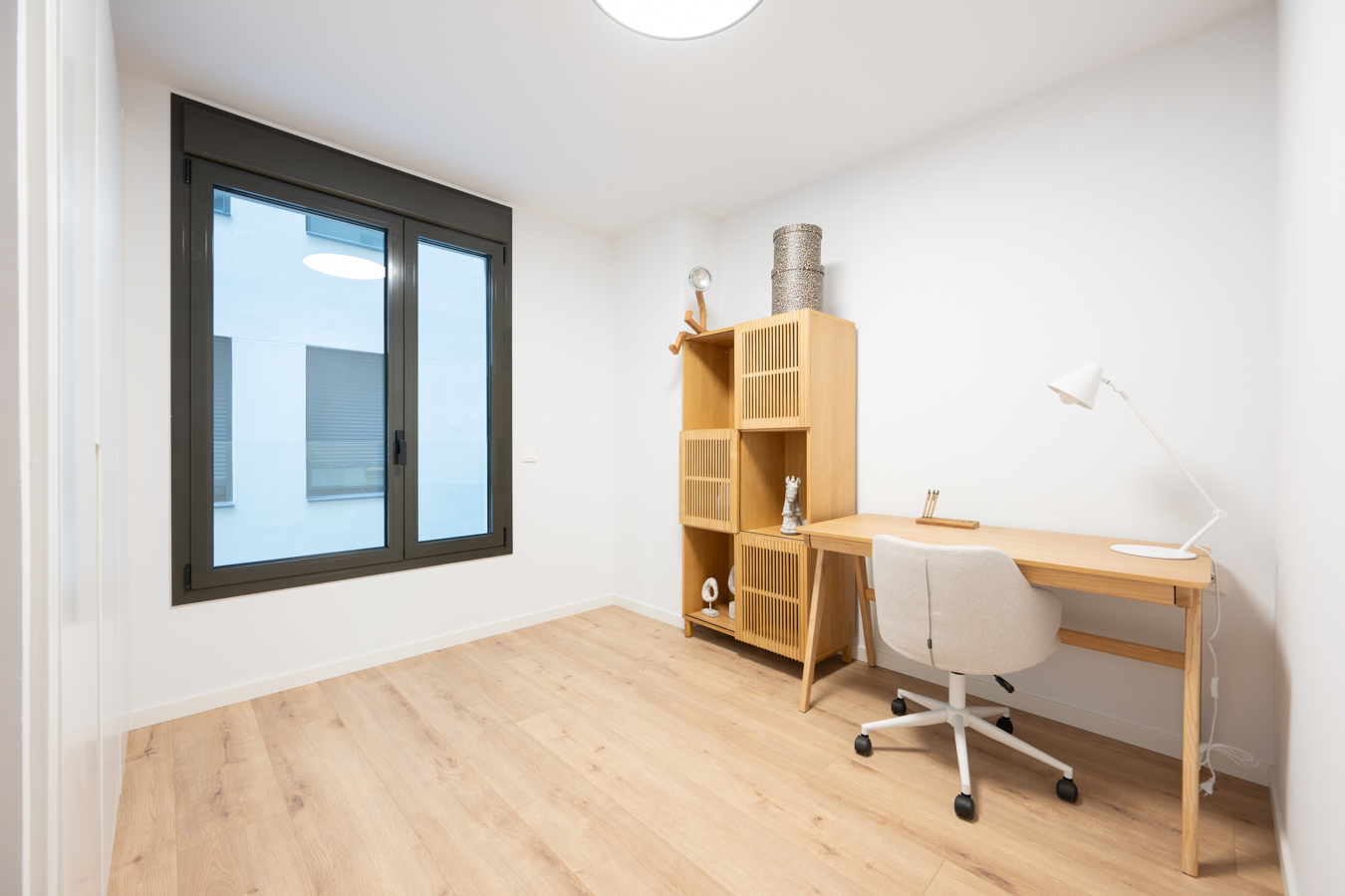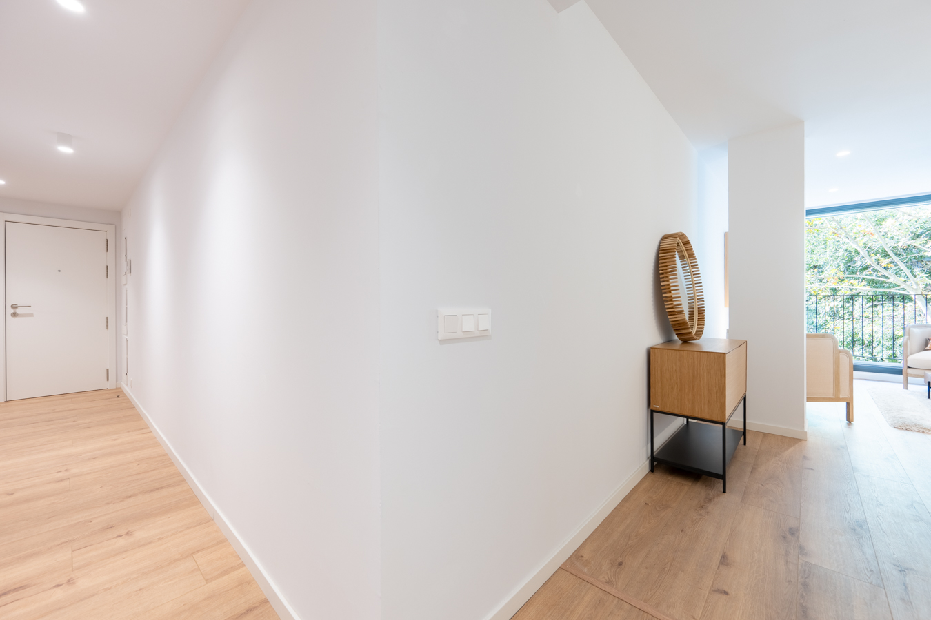 Every detail has been designed to offer comfort, efficiency and quality. The Panasonic aerothermal air conditioning system reduces energy consumption by up to 70% compared to traditional systems. Movable metal shutters protect the openings, double-glazed Climalit windows ensure perfect thermal and acoustic insulation, and lacquered aluminium joinery with thermal break reinforces energy efficiency. The floors combine AC5 laminate parquet in the main rooms and porcelain tiles in the bathrooms. The kitchen is equipped with Siemens appliances and Rovira taps, and the front door has a three-point security lock and video intercom.