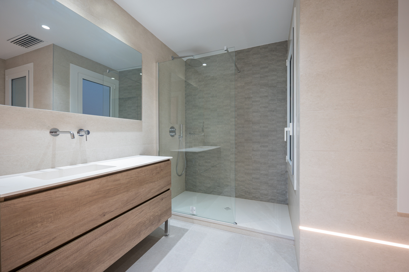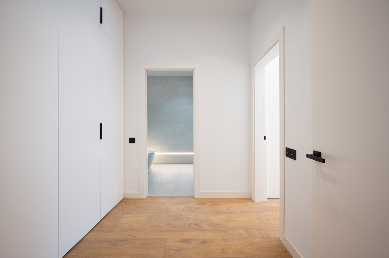 The night area has 4 bedrooms, 2 of which are en-suite with a dressing room and en-suite bathroom. The master suite occupies one end of the flat and faces the street. The second suite is next to the living room and has a gallery overlooking the block courtyard. The other 2 bedrooms (one double and one medium-sized) are interior but bright. Finally, there’s a separate bathroom.