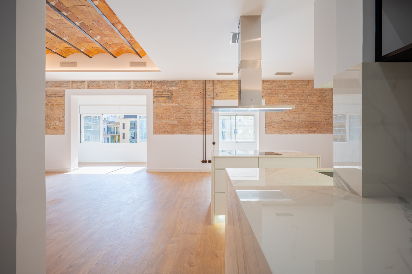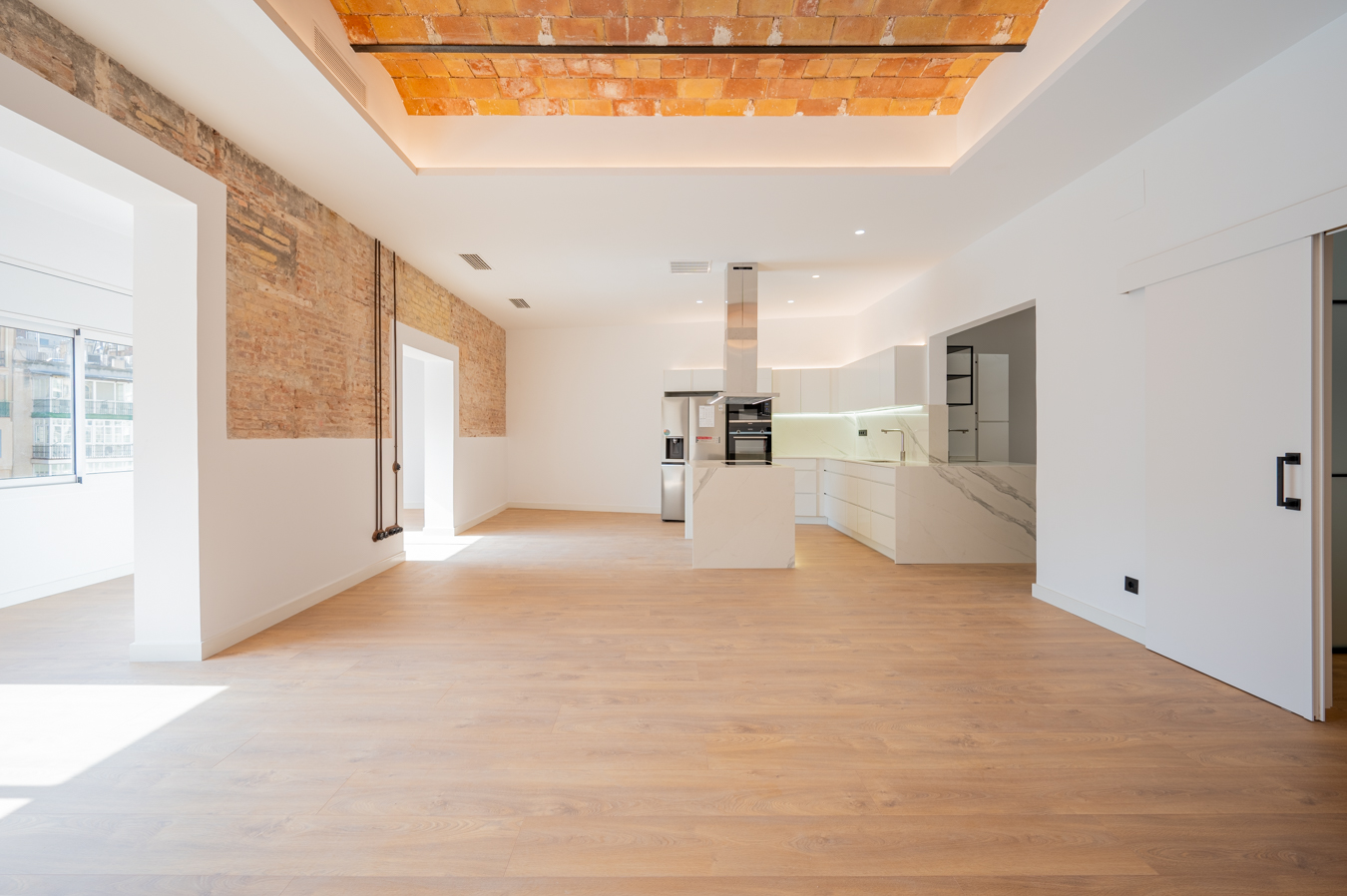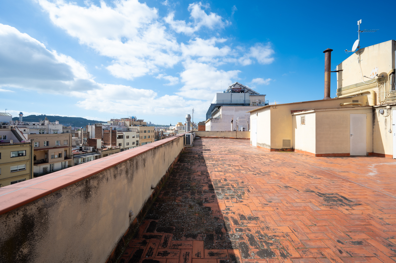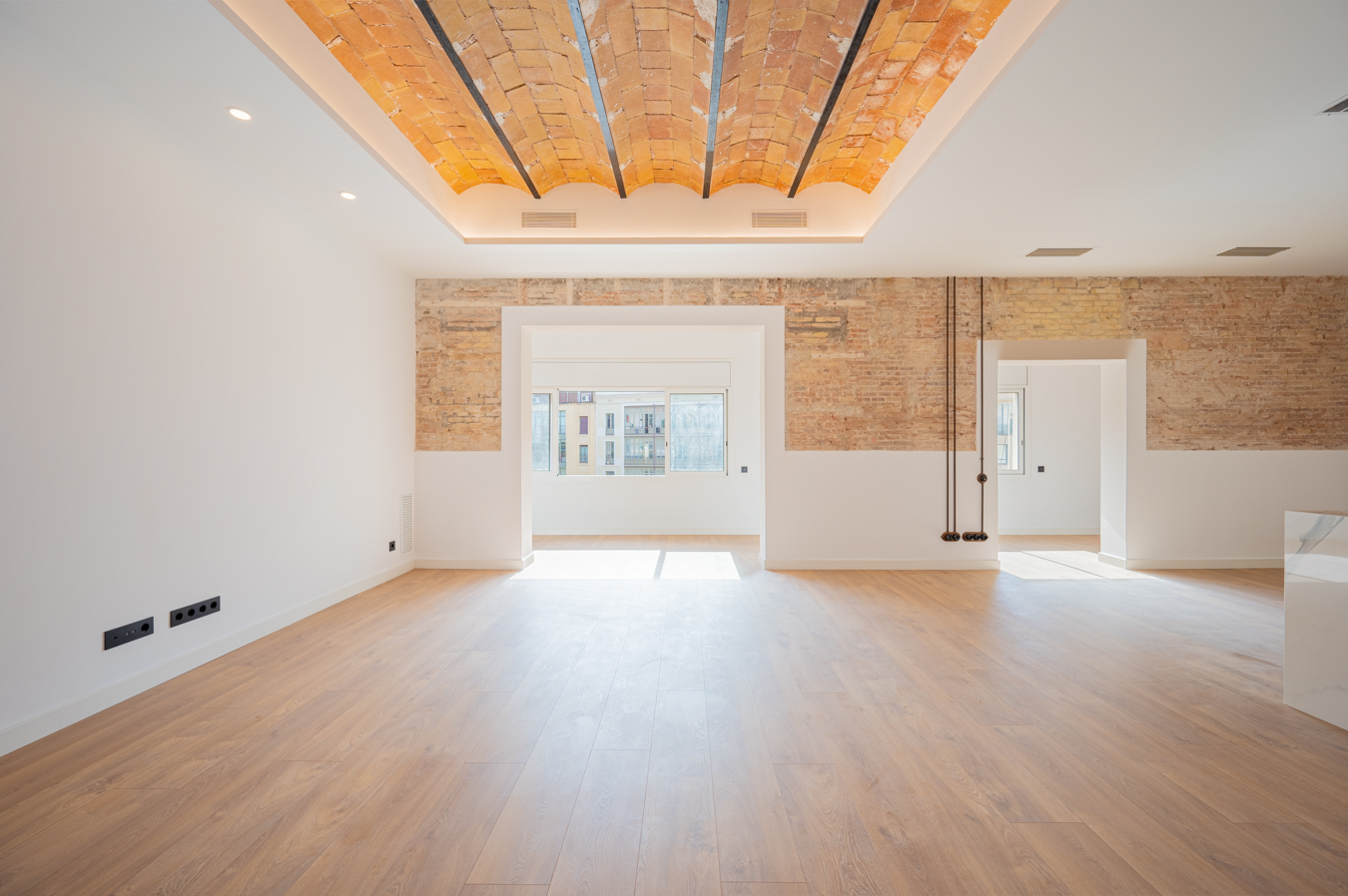 The flat has been refurbished brand new and maintains beautiful original elements such as the Catalan vault in the ceilings and exposed brick walls. It has 248 built sqm surface area and is on the real 3rd floor of a classic building with lift, concierge and commmunal terrace.