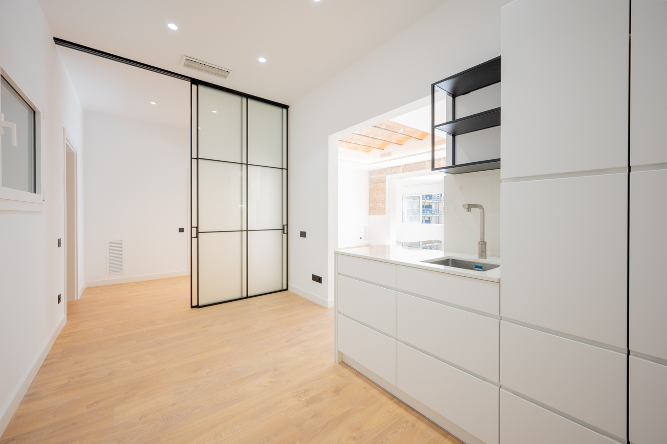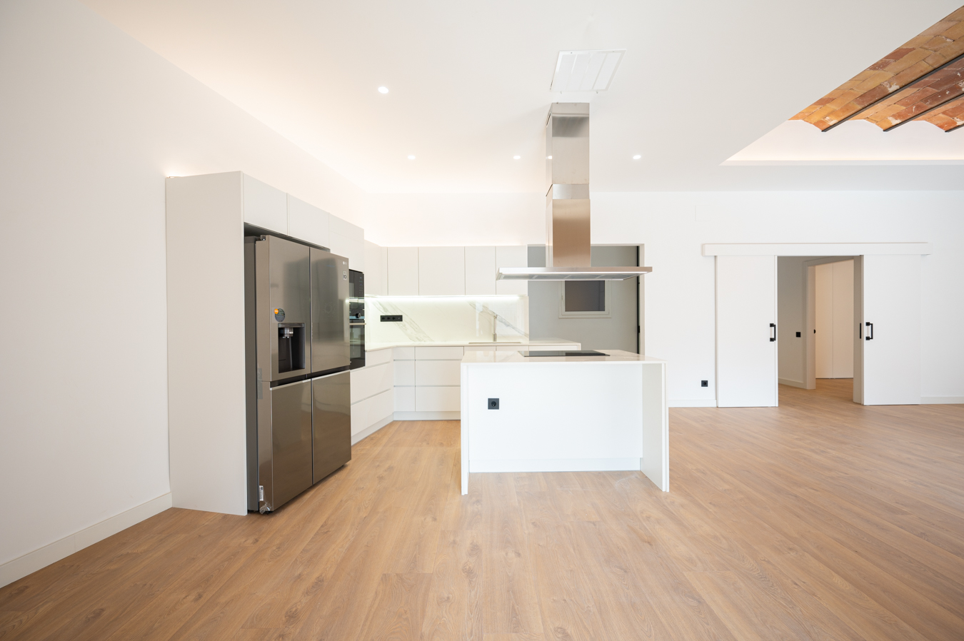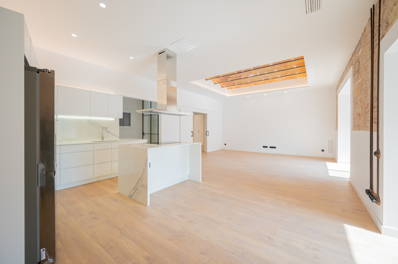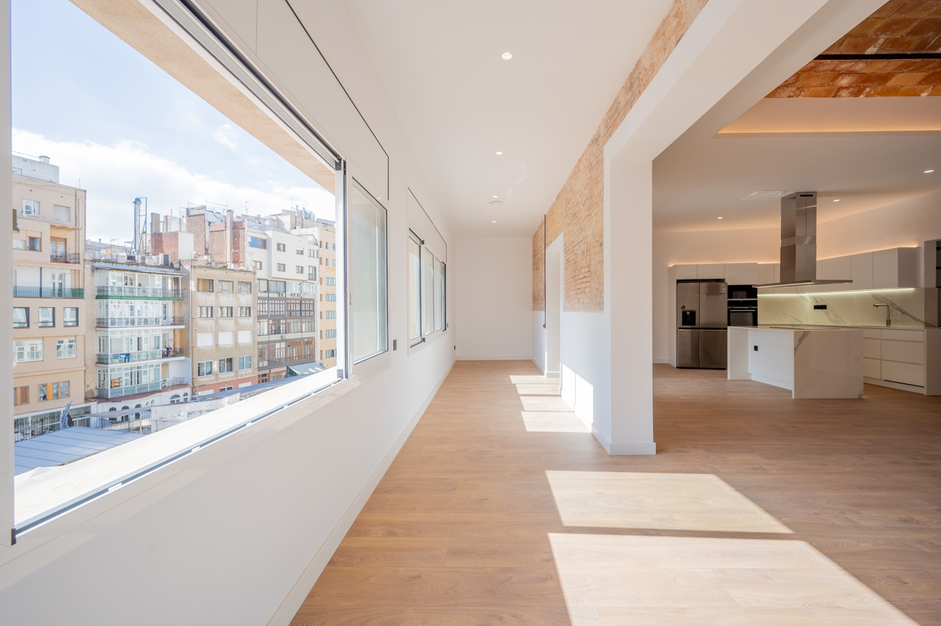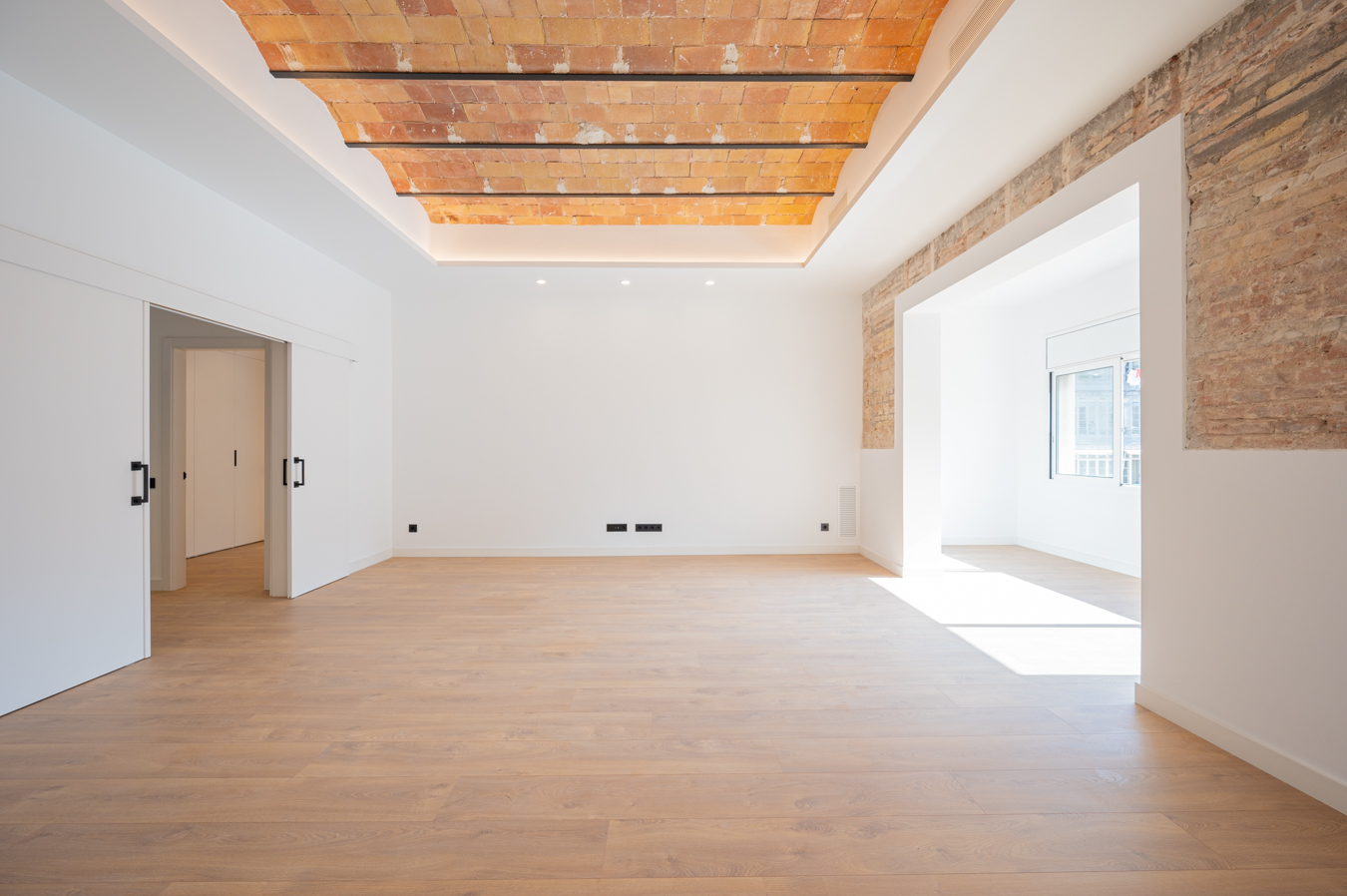 The flat has been refurbished brand new and maintains beautiful original elements such as the Catalan vault in the ceilings and exposed brick walls. It has 248 built sqm surface area and is on the real 3rd floor of a classic building with lift, concierge and commmunal terrace.