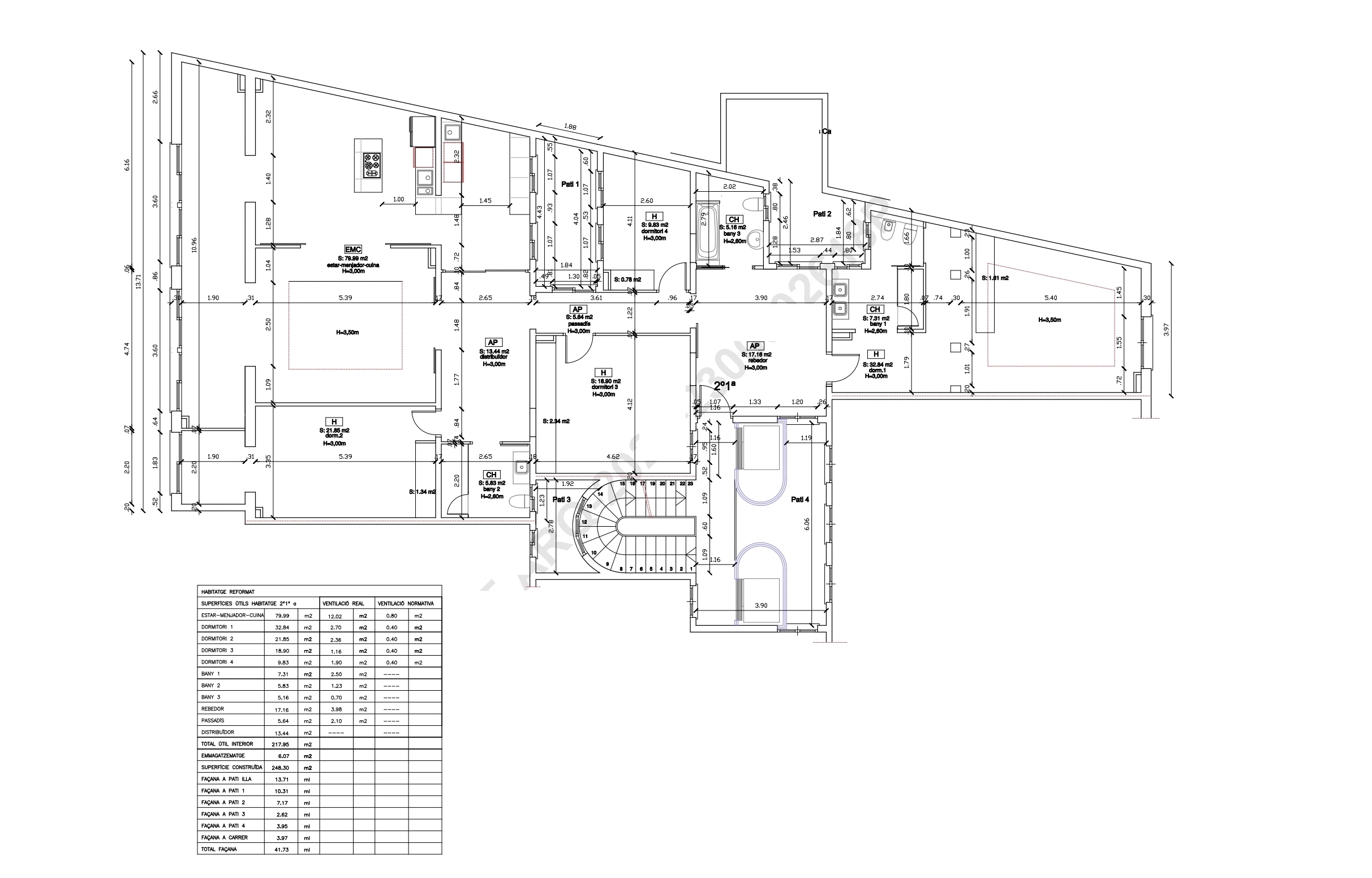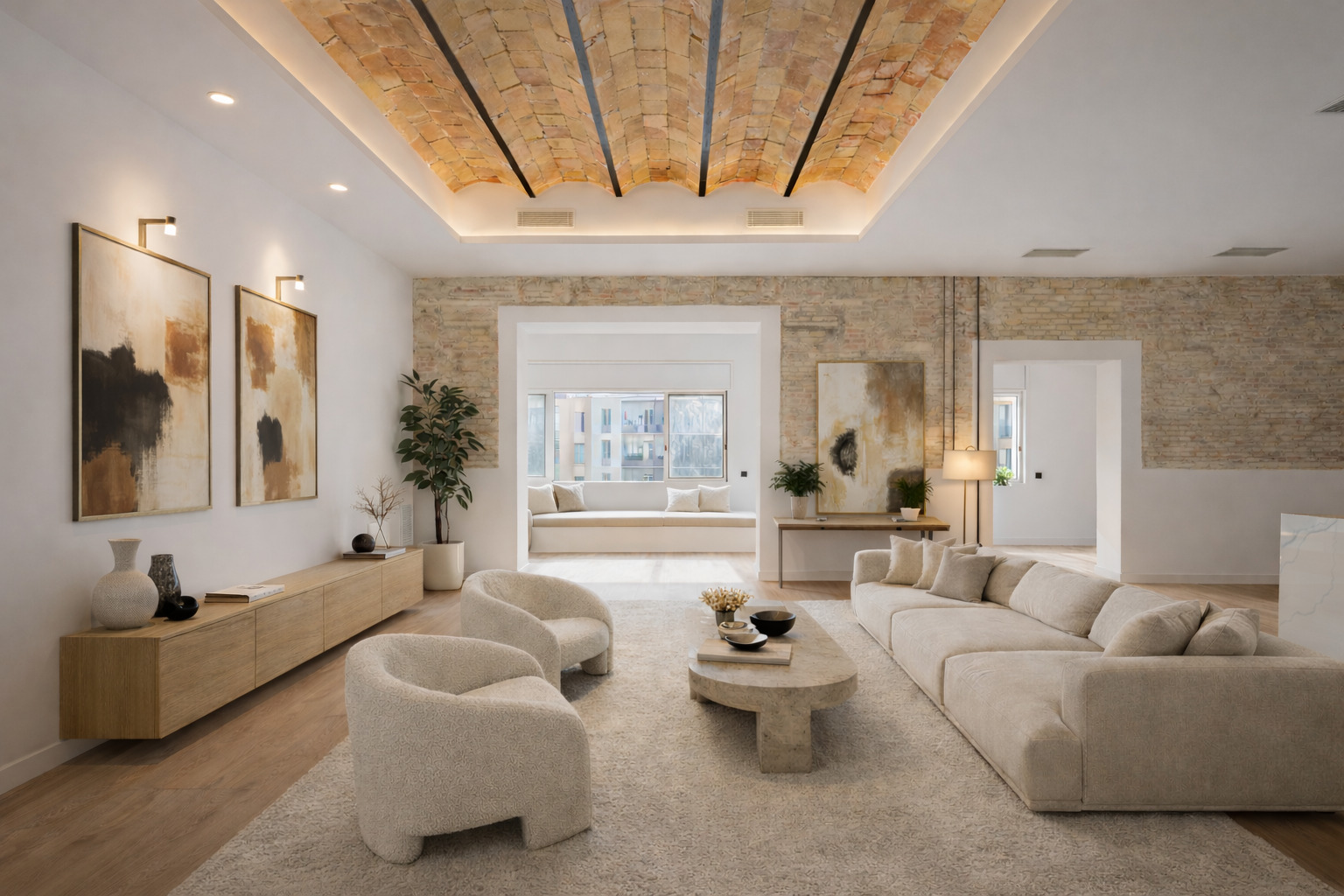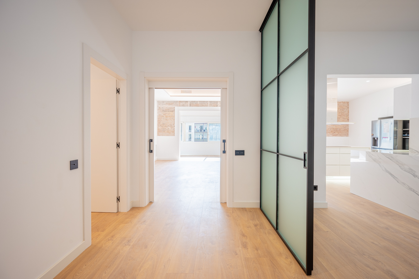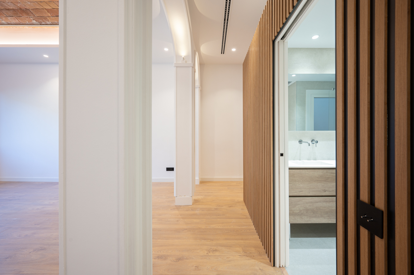 The flat has been refurbished brand new and maintains beautiful original elements such as the Catalan vault in the ceilings and exposed brick walls. It has 248 built sqm surface area and is on the real 3rd floor of a classic building with lift, concierge and commmunal terrace.