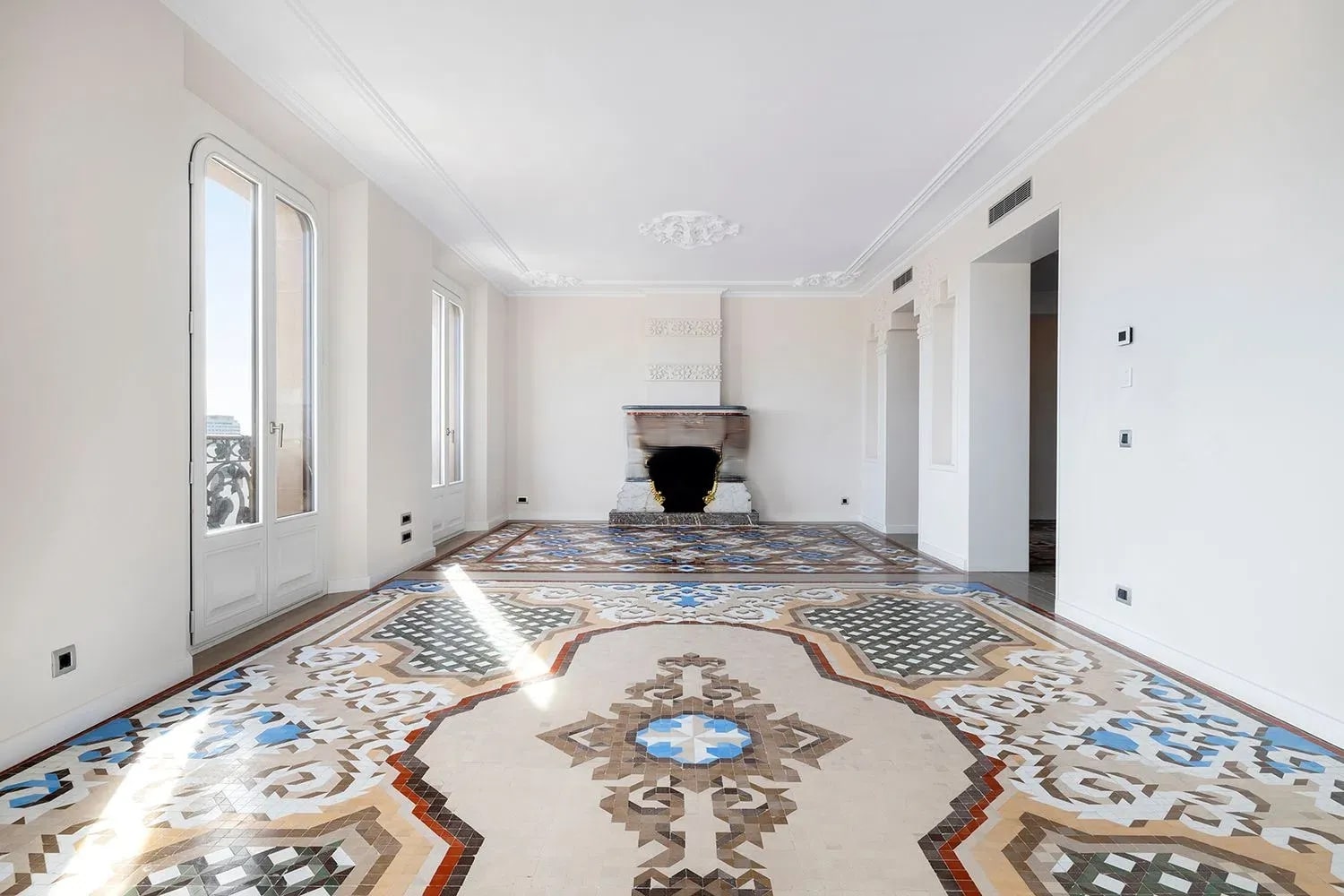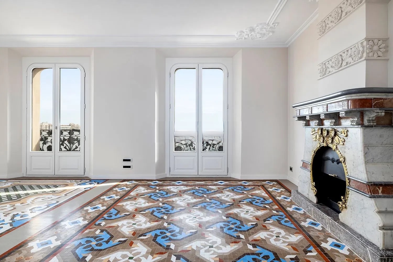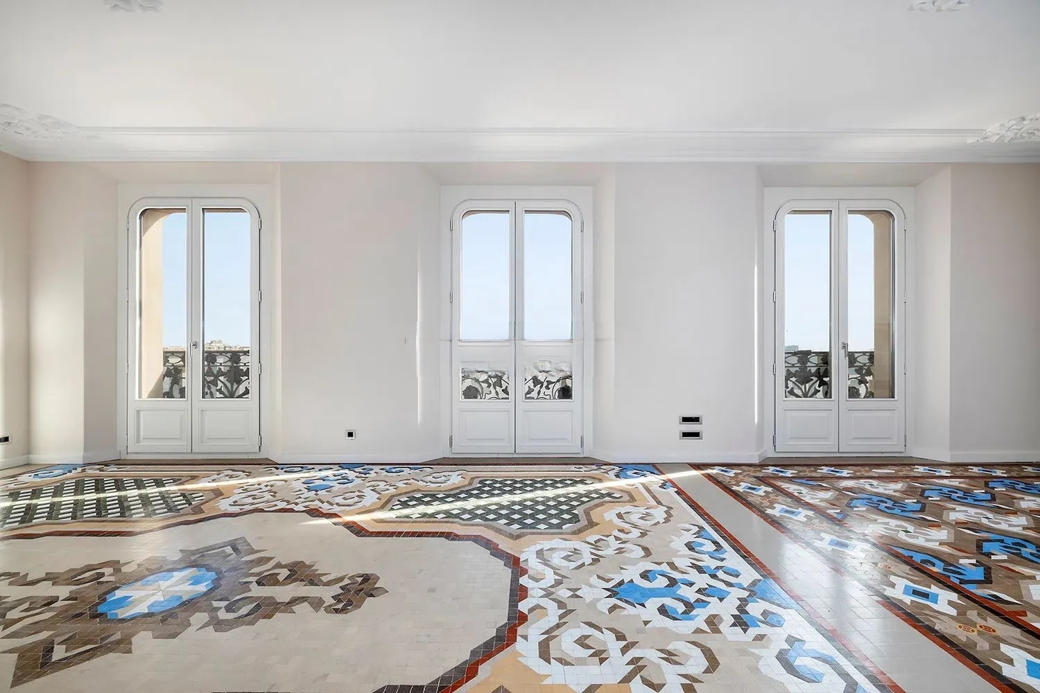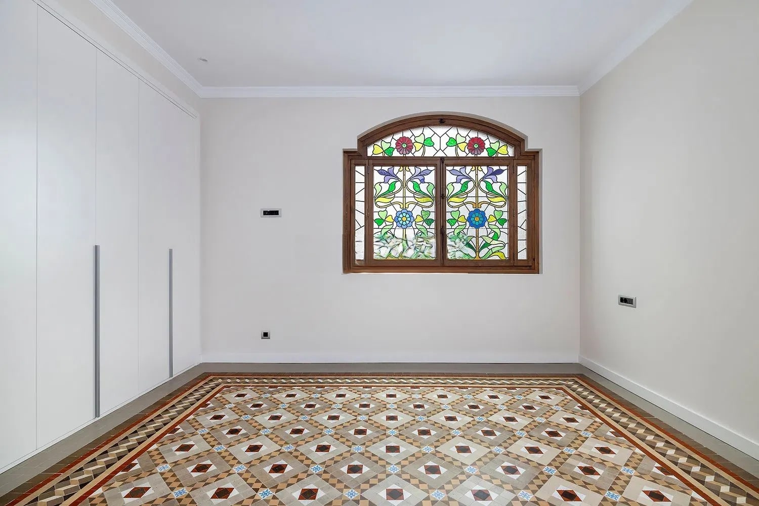 The property conserves the beautiful original hydraulic floors and has all the comforts of the 21st century in a magnificent modernist building. Beautiful ironwork, stained glass windows, unique hydraulic floors, carved woodwork, all original, combined with the most modern building technologies and the most up to date equipment.