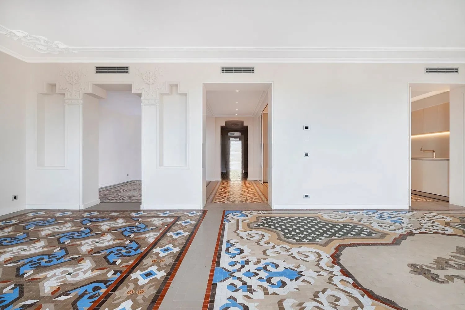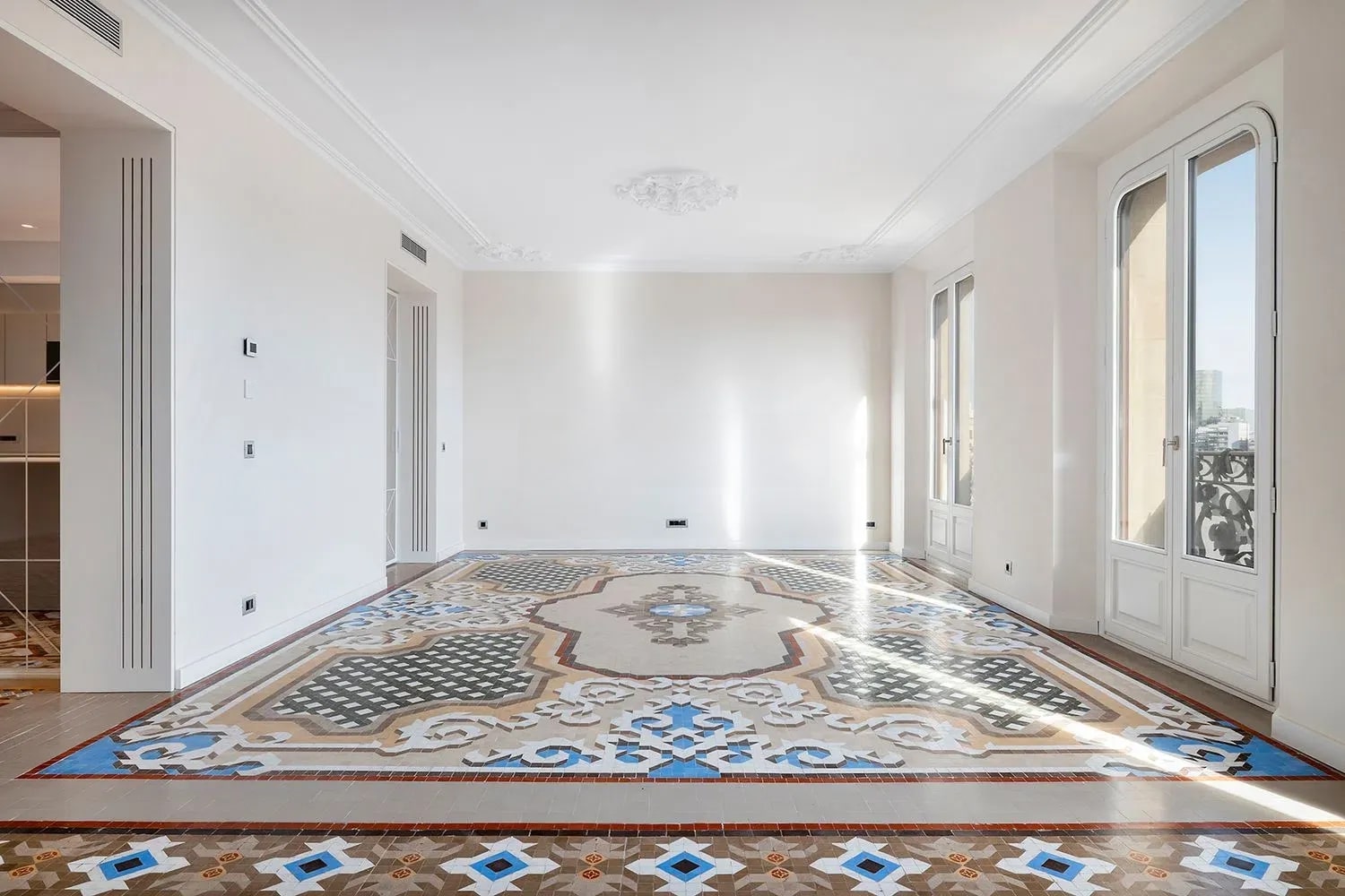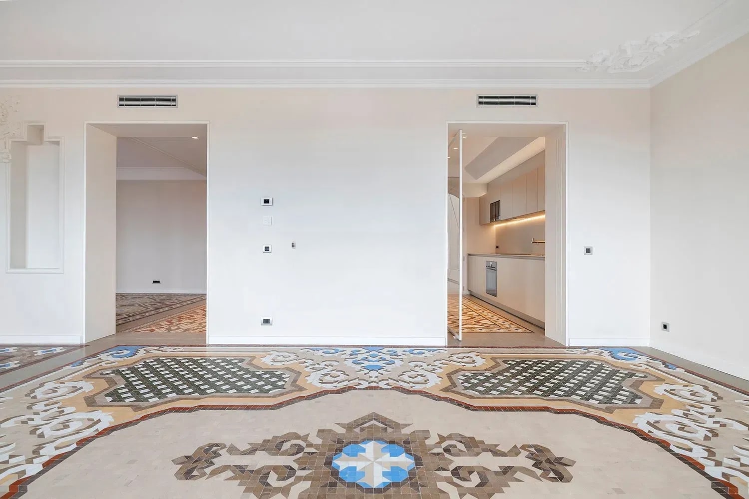 The property conserves the beautiful original hydraulic floors and has all the comforts of the 21st century in a magnificent modernist building. Beautiful ironwork, stained glass windows, unique hydraulic floors, carved woodwork, all original, combined with the most modern building technologies and the most up to date equipment.