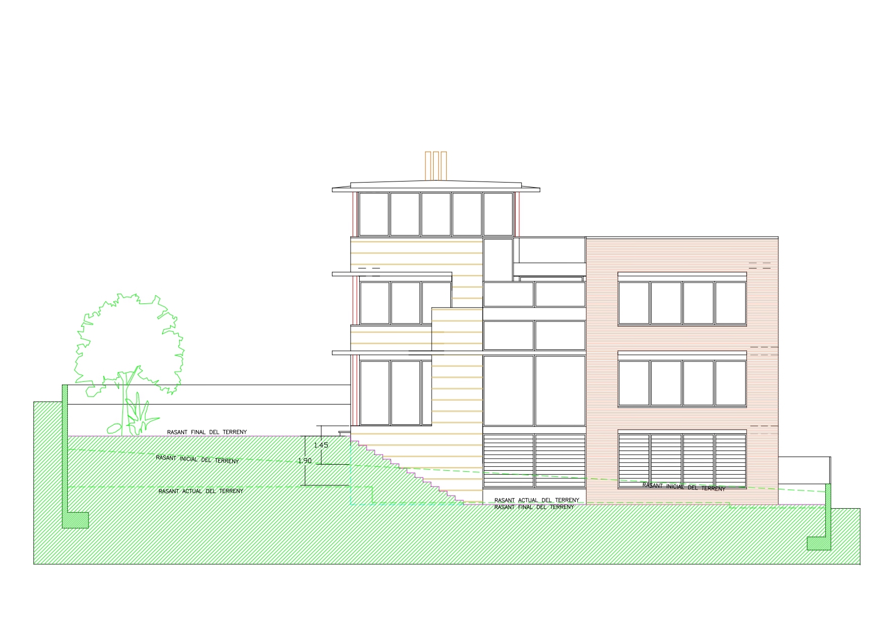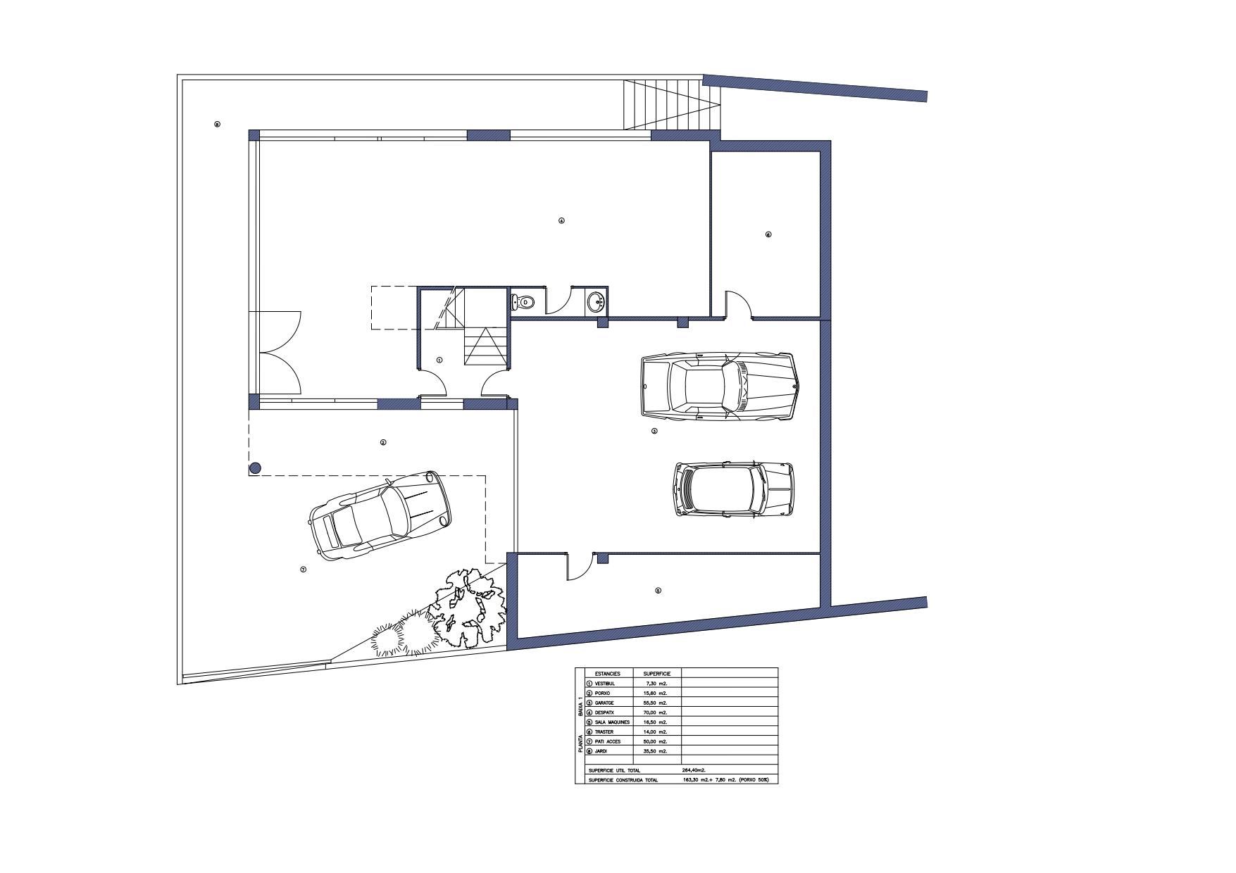Another area, also on the ground floor, has 163 sqm + 15 sqm porch, garden and patio. It’s composed of a 70 sqm independent studio, perfect to establish a consulting room or office, or to create an independent apartment with 2 bedrooms, with its direct and private access and communication with the car park. Here we also find the garage with capacity for 3 cars, the machine room and a storage room.