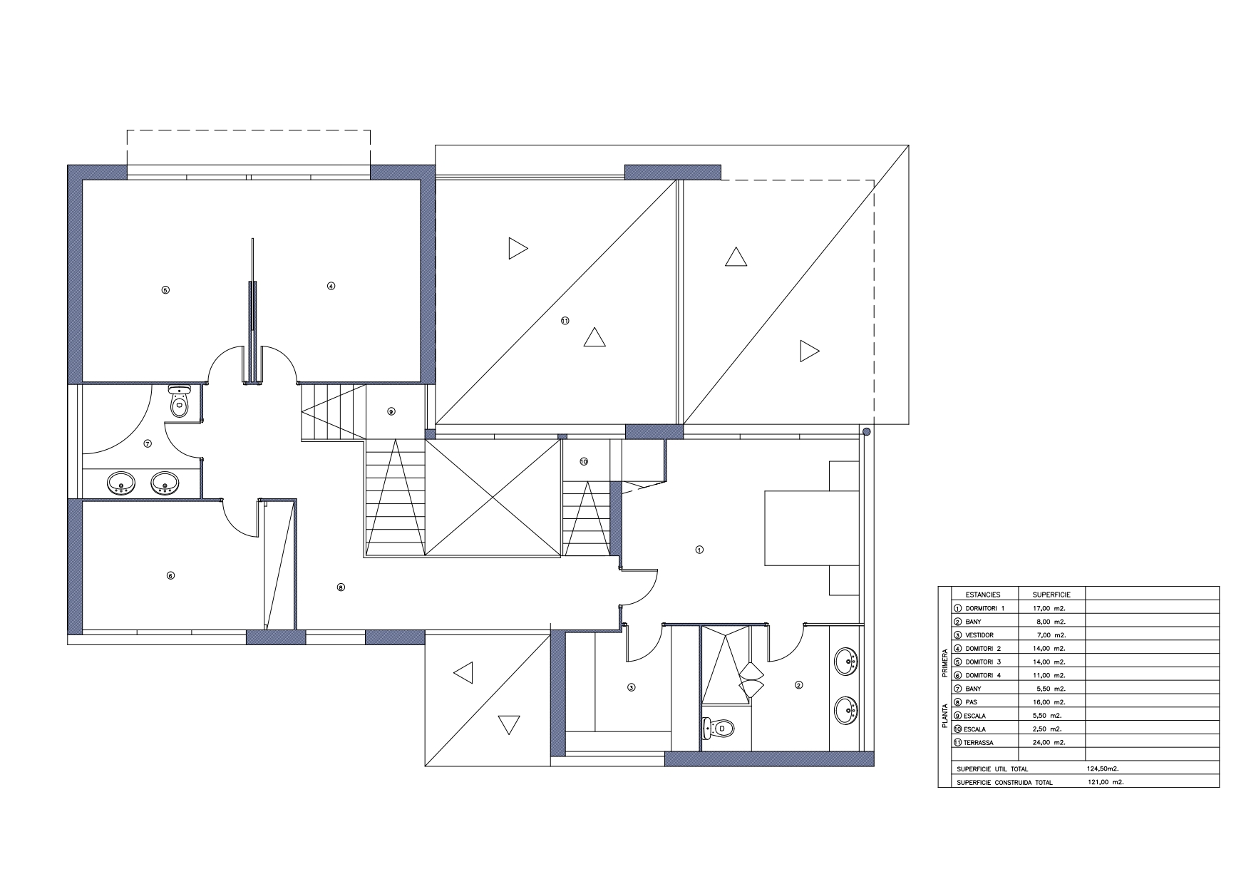 Through the central staircase we access the first floor, dedicated to the night area. It comprises the master bedroom en suite with dressing room and en-suite bathroom and 3 double bedrooms sharing a separate bathroom. Between this floor and the next one, we find a fantastic 25 sqm terrace with amazing views.