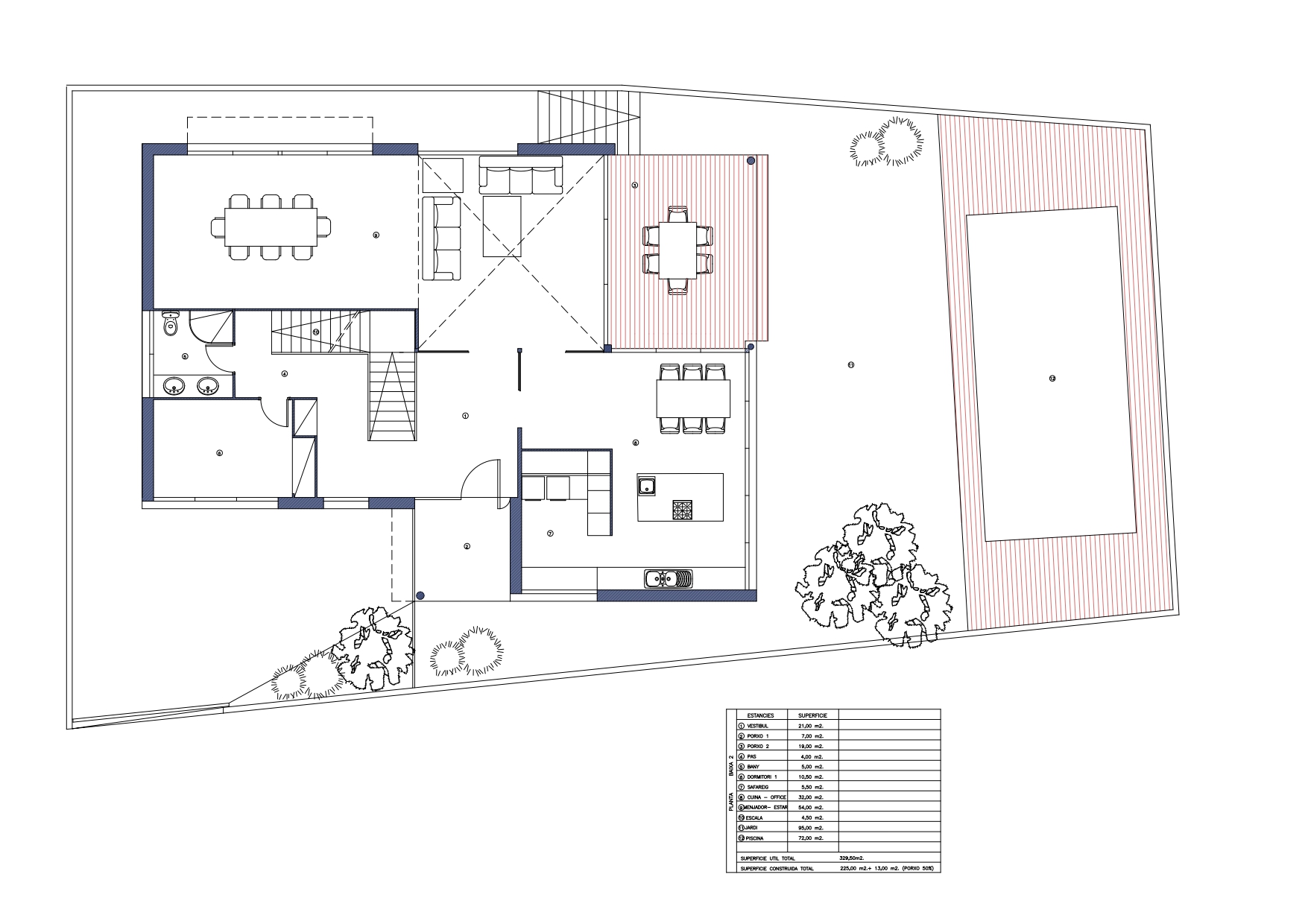 The house has a very functional layout. The main floor has an entrance hall, a large 54 sqm living-dining room with double height and a very spacious 32 sqm kitchen with separate laundry room. Both rooms have access to a porch that communicates with the garden and the swimming pool, where you can enjoy the spectacular views of the city. On the other hand, there’s also a double bedroom and a complete bathroom.