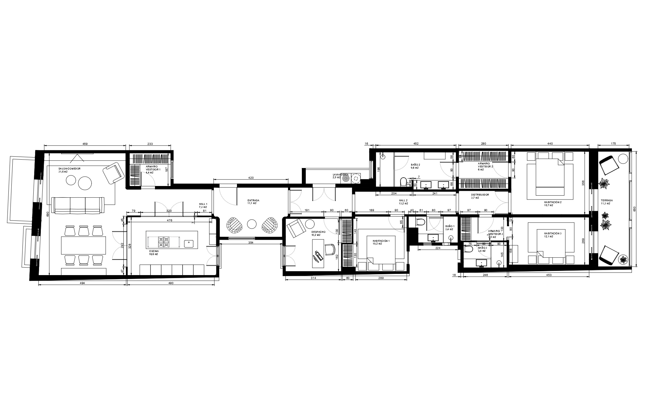 This penthouse is part of an integral rehabilitation project of a beautiful modernist building in Barcelona with more than 100 years of history. It's on the seafront, close to the Ramblas, the Born (where the gothic basilica of Santa Maria del Mar is located) and Barceloneta, with its magnificent beaches and restaurants. This penthouse of 213 built interior sqm and a 58 sqm terrace is on the 5th real floor and enjoys wonderful views of the Port Vell marina from its living room. The day area is very spacious and each room has its own differentiated space. The living room is bright and spacious. The kitchen is semi-open to the corridor that leads to it and, in front of it, there is a dining room. The night area has 3 bedrooms. The master bedroom en suite has access to the magnificent terrace. In addition, there is a double bedroom en suite, another double bedroom and a separate bathroom. The building has an impressive communal terrace with solarium area and swimming pool. It is located in a neuralgic point of Barcelona. On the one hand, it is very close to Las Ramblas, one of the city's most popular thoroughfares, and the Gran Teatre del Liceu. Easy access is guaranteed with the nearby Estació de França and the maritime terminals, numerous bus and metro lines, a large public car park and access to the Ronda Litoral which connects to the airport. The property conserves the beautiful original hydraulic floors and has all the comforts of the 21st century in a magnificent modernist building. Beautiful ironwork, stained glass windows, unique hydraulic floors, carved woodwork, all original, combined with the most modern building technologies and the most up to date equipment.