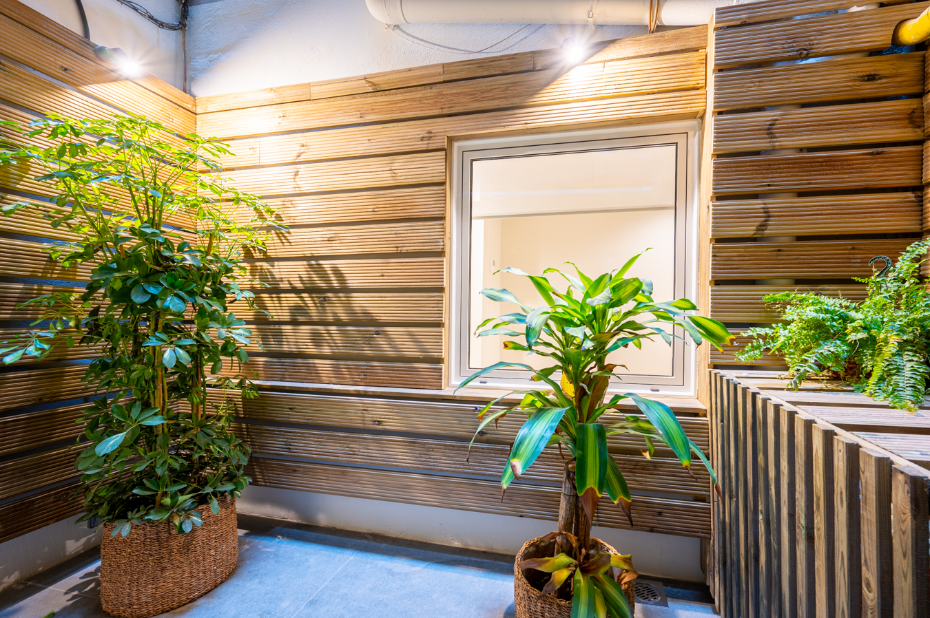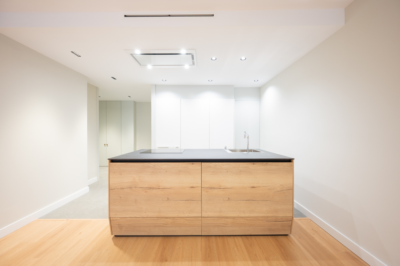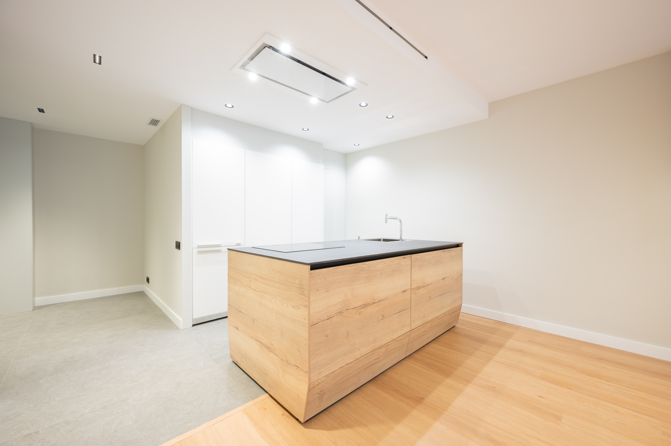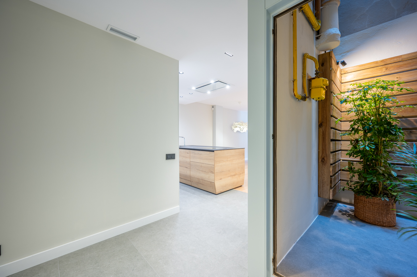 The property is on the first floor of a building with a lift and overlooks a very quiet pedestrian street. Upon entering, a hall leads directly to the fantastic day area, which is a living-dining room with an open-plan kitchen and central island. Natural light is abundant thanks to a large window and the feeling of well-being is very welcoming. Next to the kitchen area there is a hidden utility room. Returning to the entrance, we access the patio, an ideal place to relax outdoors and have your own little escape in the middle of the big city.