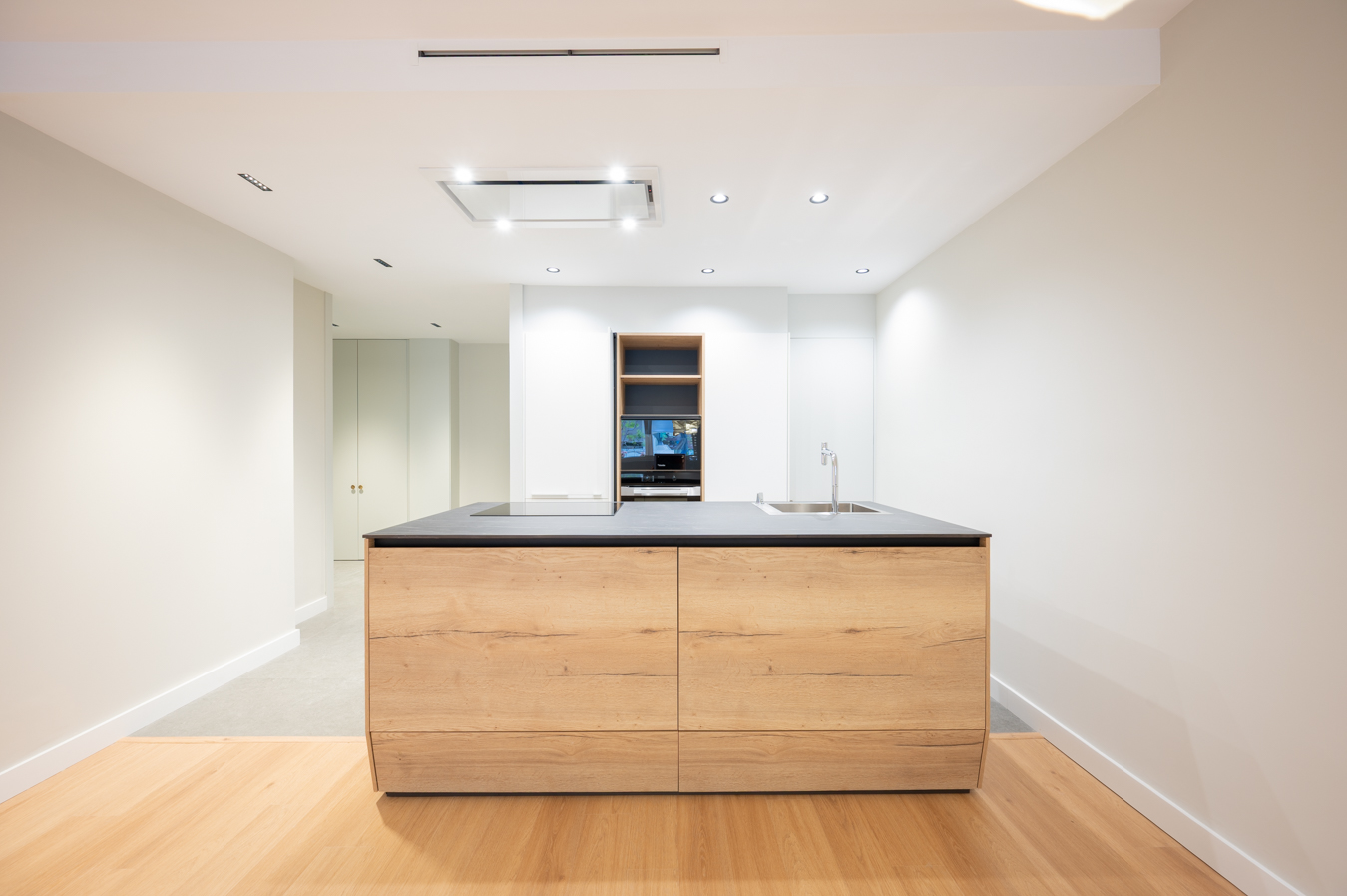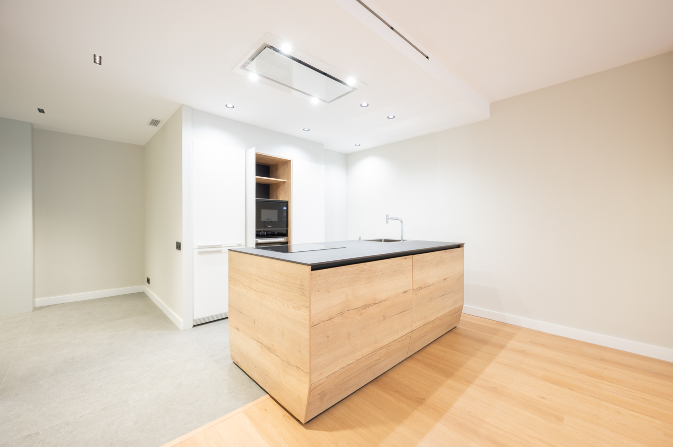 The flat is equipped with high end Pergo laminate flooring and porcelain flooring in the kitchen, Santos kitchen, integrated Miele household appliances, ducted hot/cold air conditioning with 2 machines in the day area and in the night area, aerothermal system for hot water, electric blinds and ambient lights. The building has parking.