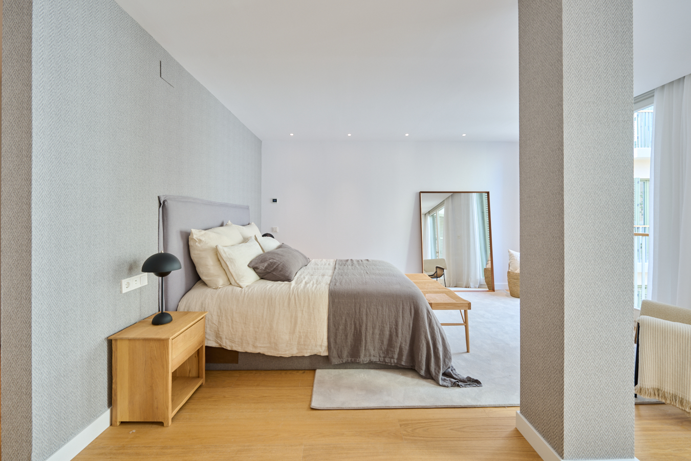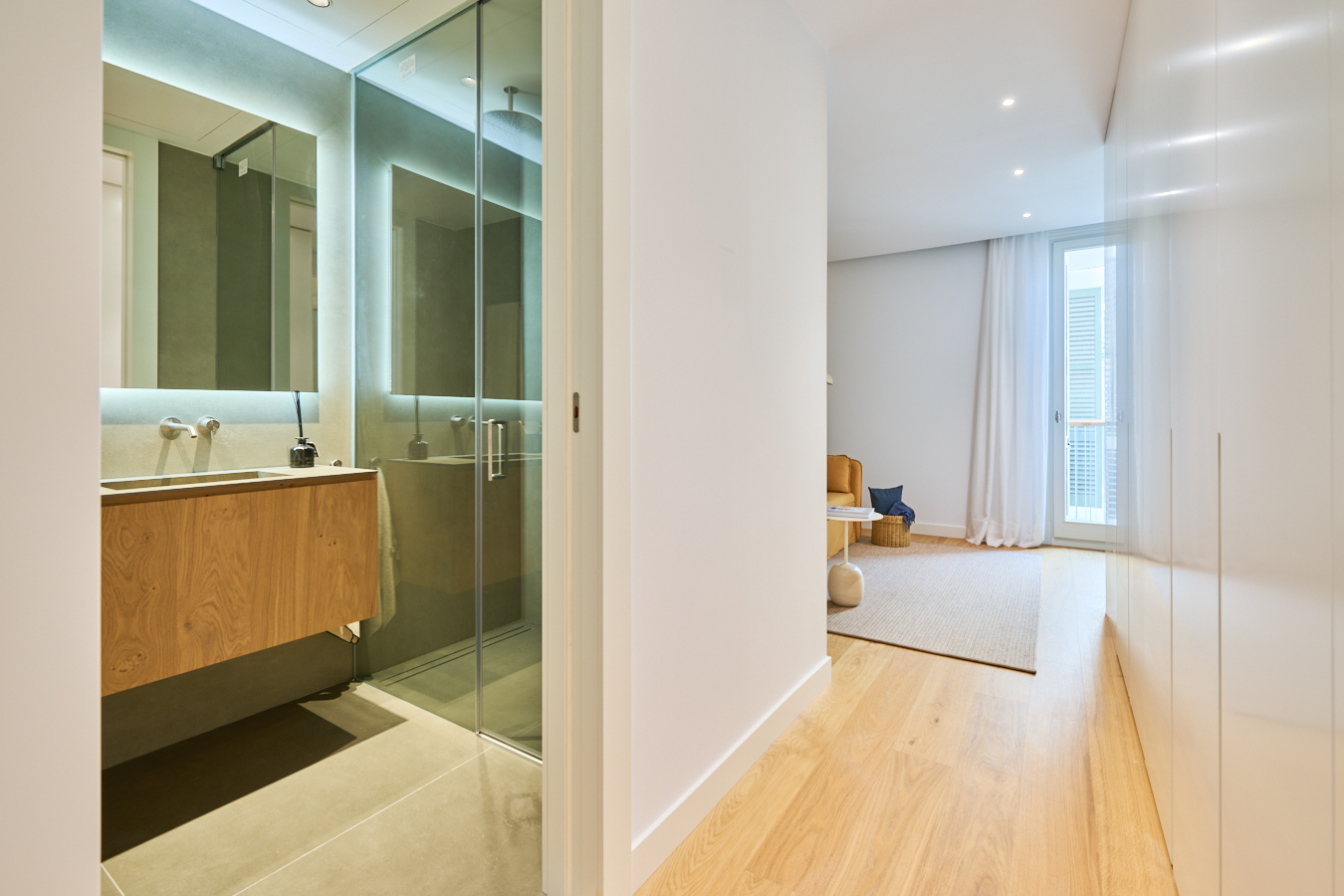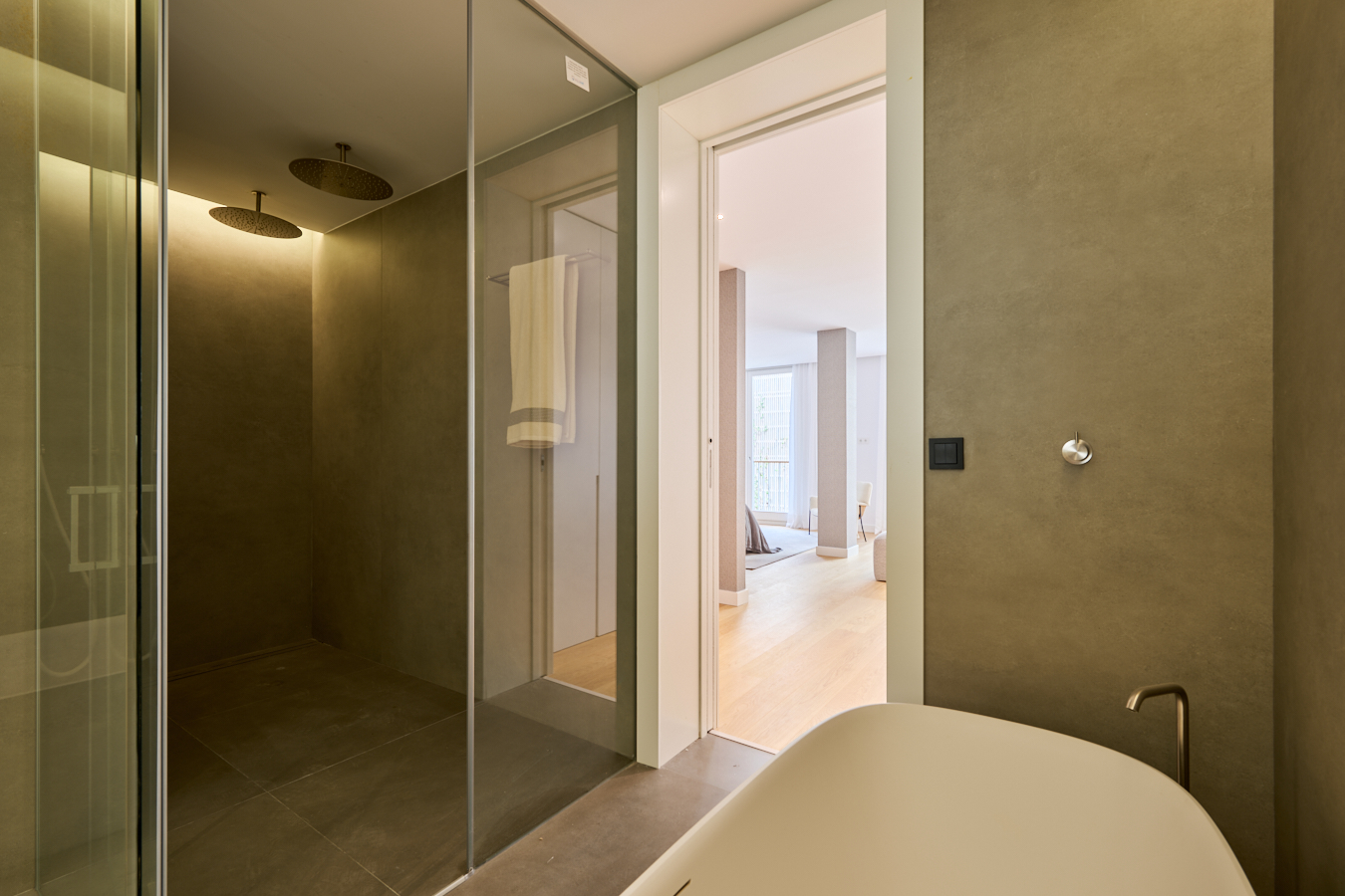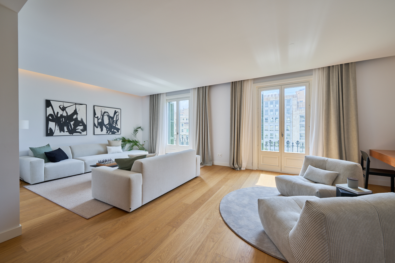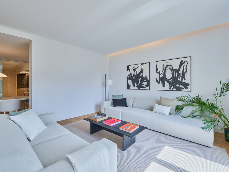 This newly built flat is located in a historic building totally refurbished with luxury properties, in Paseo de Gracia in Barcelona, the most valued avenue in the city and one of the most important in Europe. This is a unique opportunity to live in the centre of the city with the highest comfort and the best quality of materials and finishings, in a building with terrace and swimming pool. This property is located on the fourth floor and has 217 sqm of interior built area. The entrance hall distributes the day and night areas at both ends. The day area has a large continuous space but in which each area occupies its own well differentiated place. The 34 sqm living room has access to two balconies facing Paseo de Gracia, with its fantastic urban and architectural views. This communicates with a dining room that leads to the semi-open kitchen, fully equipped with top brand appliances, which has an adjoining laundry room. A hallway from the entrance hall leads to the night area. The master suite has its own bathroom with bathtub. There's also another en-suite bedroom and one double bedroom. All bedrooms have a balcony facing the beautiful inner courtyard and fitted wardrobes. Finally, there is a separate bathroom with bathtub and a guest toilet. The communal rooftop terrace of the building is a haven above the comings and goings of the big city, filled with plants, tables, sofas and sun loungers. It is the ideal location for the most distinguished gatherings with great views of the city centre and Gaudí's Casa Batlló, to relax or to enjoy the swimming pool. The building has a lift, concierge and 24-hour security. The high-level refurbishment of the property has been carried out using the best materials, meticulous finishing touches and premium design. The highest quality standards combine the elegance of history with the functionality of the present.The property provides the buyer with an interior designer to assist with any changes to the furniture and/or building work to create an alternative layout (examples with 2 and 4 bedrooms are proposed). The location of this flat in Paseo de Gracia is simply unbeatable.You will be able to enjoy the neuralgic and financial centre of the city, its wide range of restaurants and top brand boutiques, its cultural and architectural attractions, and excellent communication by public transport. Do not hesitate to contact Bcn Advisors to find out more about this property and the rest of the flats that are still available in the building.