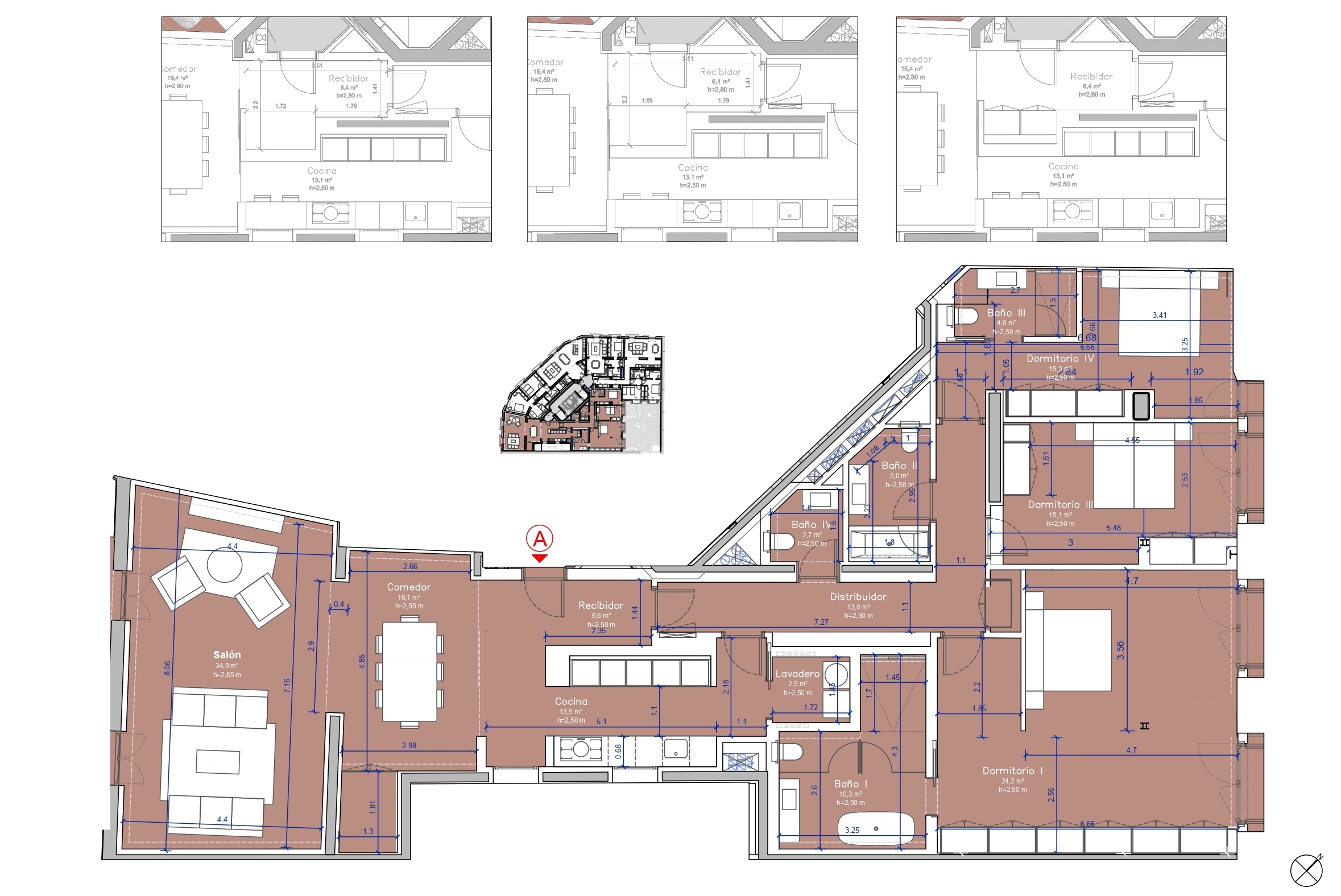 The high-level refurbishment of the property has been carried out using the best materials, meticulous finishing touches and premium design. The highest quality standards combine the elegance of tradition with the comfort of the present. The property provides the buyer with an interior designer to help with any changes of furniture and/or building work to create an alternative layout (examples with 4 and 3 bedrooms are proposed).