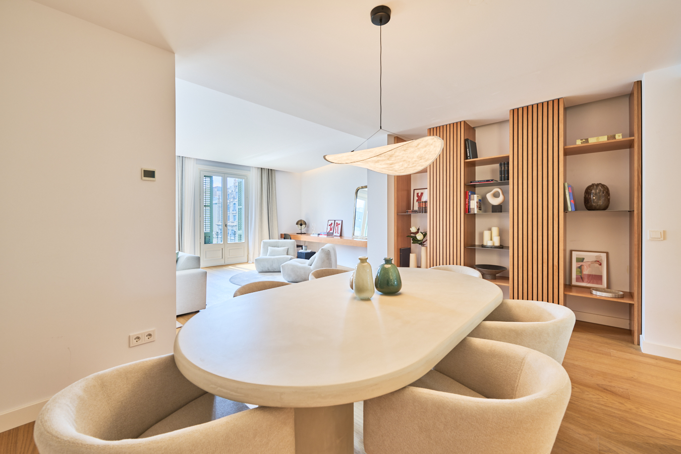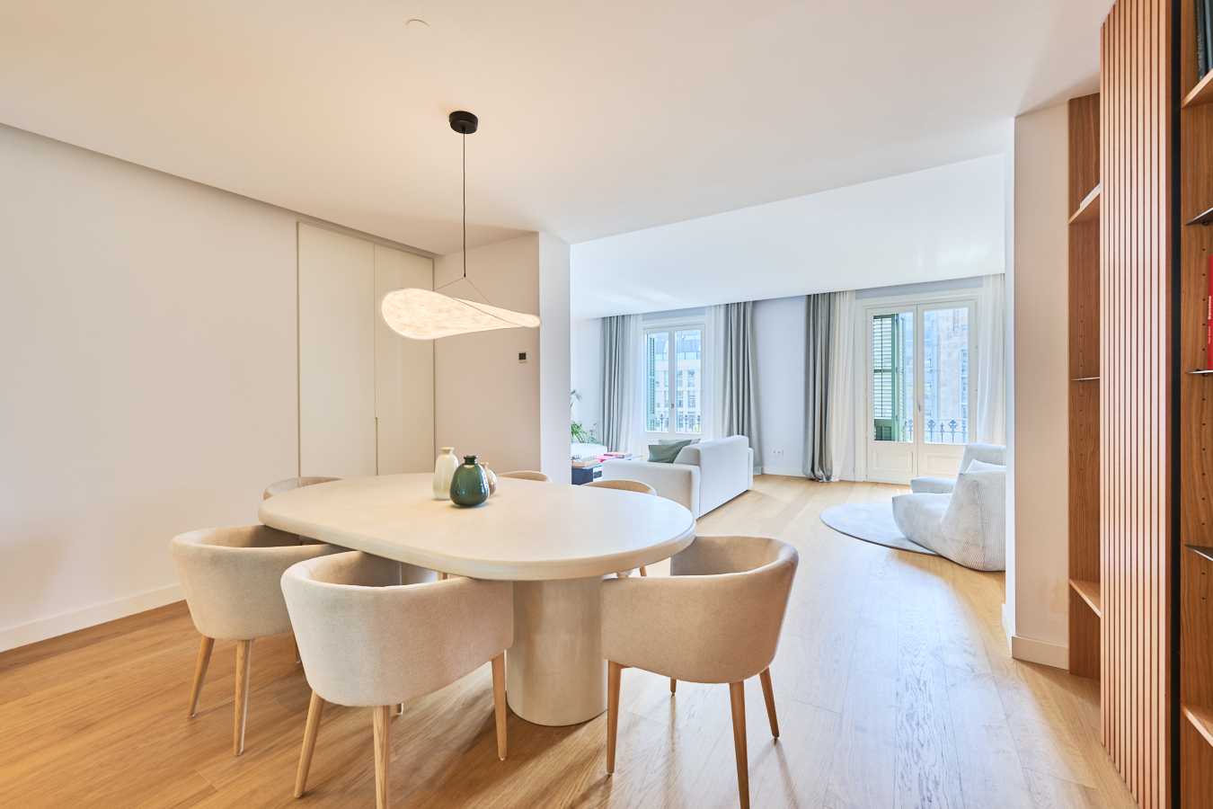 This stunning residence is situated on the 5th and top floor of a classic 20th-century building in the prestigious "Quadrat d’Or" ("Golden Square") area, right next to the iconic Passeig de Gràcia. The building features one apartment per floor with a modern lift, ensuring the utmost privacy and exclusivity. Being on the top floor, the property is completely exterior, filled with natural light throughout the day, and enjoys absolute tranquillity with no neighbours above. This beautiful property offers a 198 sqm layout. The 68 sqm open-plan living area with an integrated kitchen has been masterfully redesigned to offer a spacious, flowing environment that maximizes light and openness. It has three large windows with access to a balcony offering views of Passeig de Gràcia and the Hotel Majestic. The kitchen, by Italian firm Novacucina, includes Smeg appliances such as two refrigerators, two freezers, kitchen accessories and a wine cooler. The night area comprises 3 spacious double bedrooms, two of which are en suite and overlook a quiet block courtyard filled with natural light. The third bedroom is independent and versatile — ideal as a guest room or home office — and also enjoys great brightness. In addition, there's a third separate bathroom. The interior design has been beautifully crafted with exceptional attention to detail, featuring custom-made textiles and bespoke furniture from leading European luxury brands. The handcrafted plaster cornices, together with the selection of premium materials, reflect the refined design work of the architects and designers who have transformed this residence into a truly bespoke creation. It's handed over fully furnished, with each detail carefully selected to achieve perfect harmony and comfort. Ceilings with a height of 3.2 metres enhance the sense of space and elegance, while indirect lighting highlights the handcrafted mouldings and plasterwork, showcasing the apartment’s exquisite detailing. The property is equipped with an advanced integrated climate system, combining heating and cooling using aerothermal energy, a highly energy-efficient solution to ensure year-round comfort and sustainability. It also features underfloor marble heating, providing outstanding comfort all year round, along with a gas installation and an integrated sound system throughout the apartment. Located just steps away from Barcelona’s most prestigious boutiques and restaurants — including Chanel, Hermès, and other renowned fine-dining venues — this one-of-a-kind penthouse offers an exceptional lifestyle in the very heart of Passeig de Gràcia.