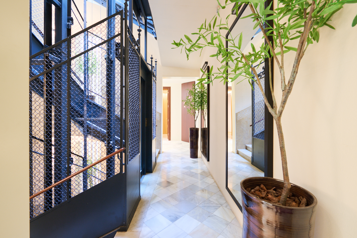 A hallway from the entrance hall leads to the night area. The master suite has its own bathroom with bathtub. There is also another en-suite bedroom. All bedrooms have a balcony facing the beautiful inner courtyard and fitted wardrobes. Finally, there is a separate bathroom with bathtub and a guest toilet.