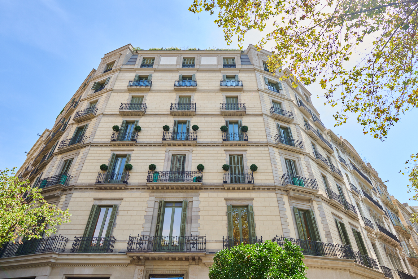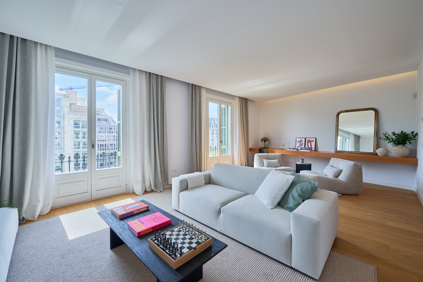 This new-build property is part of an exclusive project in a completely refurbished historic building on Paseo de Gracia in Barcelona, the most sought-after avenue in the city and one of the most emblematic in Europe. This is a unique opportunity to live in the centre of the city with maximum comfort and the highest quality materials and finishes, in a building with a terrace and swimming pool. This flat is located on the 2nd floor and has 217 built interior sqm. The entrance hall distributes the day and night areas on both sides. The day area is a large continuous space but in which each area occupies its own differentiated space. The 34 sqm living room has access to 2 balconies facing Paseo de Gracia, with its fantastic urban and architectural views. This communicates with a dining room that leads to the semi-open-plan kitchen, fully equipped with top-of-the-range appliances, which has an adjoining laundry room. A hallway from the entrance hall leads to the night area. The master suite has its own bathroom with bathtub and balconies. There is also another bedroom en suite. All the bedrooms have built-in wardrobes. Finally, there is a separate bathroom with bathtub and a toilet. The communal rooftop terrace of the building is an idyllic spot above the hustle and bustle of the big city, full of plants, tables, sofas and sun loungers. It is the ideal spot for the most distinguished gatherings with breathtaking views of the city centre and Gaudí's Casa Batlló, to relax or to enjoy the swimming pool. The building has a lift, concierge and 24-hour security. The luxury refurbishment of the property has been carried out using the best materials, meticulous finishing touches and premium design. In short, the highest quality standards to combine the elegance of history and the functionality of the present. The property provides the buyer with an interior designer to help with any changes of furniture and/or works for an alternative distribution (examples with 4 and 3 bedrooms are proposed) that the buyer may wish to carry out. The location of this property on Paseo de Gracia is simply unbeatable. You will be able to enjoy the neuralgic and financial centre of the city, its great variety of restaurants and top brand boutiques, its cultural and architectural attractions, and excellent communication by public transport. Do not hesitate to contact Bcn Advisors to find out more about this property and the rest of the flats that are still available in the building.