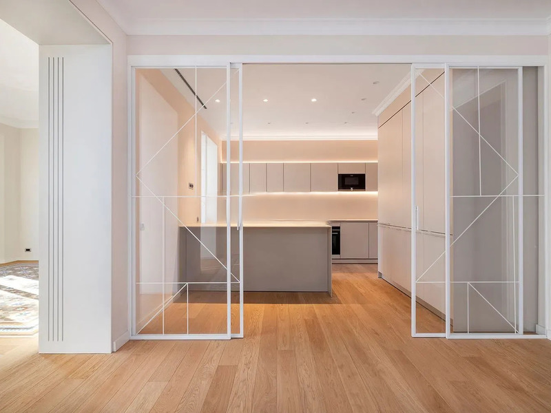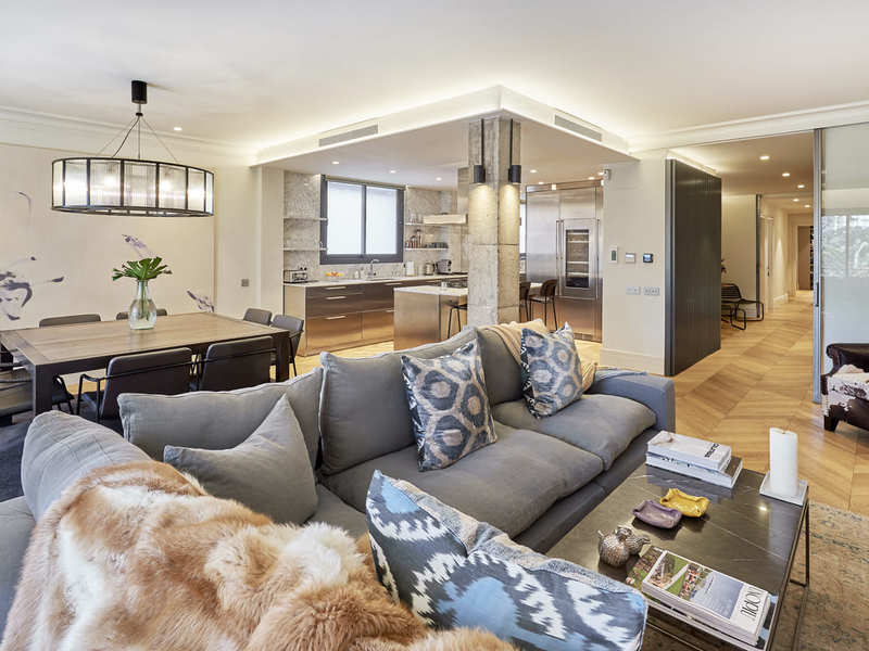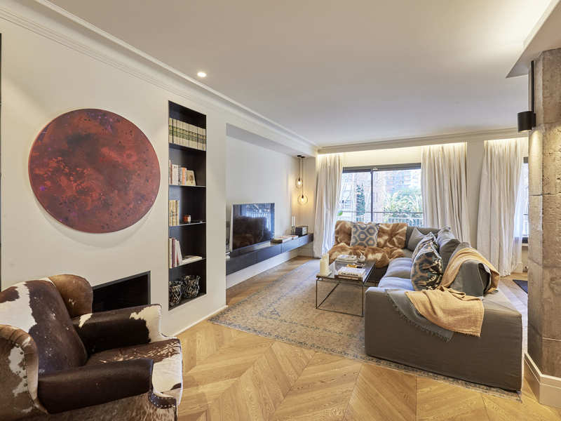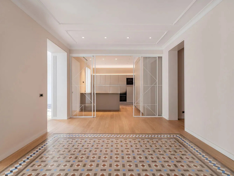 This immaculate flat is located between Paseo de Gracia and Rambla Catalunya, one of the most prestigious locations in Barcelona in the upper part of Eixample's right side. The luxury refurbishment has taken care of all the details in conception, materials and finishings, highlighting the floors and ceilings designed exclusively for this property and the excellent marquetry work on the floors and carpentry. The property has 170 built interior sqm and a 10 sqm balcony. It occupies the entire "Principal" floor (first one) of a regal estate building that was completely refurbished in 2017 with lift and only one flat per floor. Its double orientation makes it a very bright property. A large entrance hall distributes the day and night areas on both sides. The large living-dining room is wonderful and enjoys very high ceilings that provide a great feeling of spaciousness and brightness. It has access to the balcony, facing east towards the street. The Bulthaup top of the range kitchen is very spacious, equipped with Gaggenau appliances and has a separate laundry room. A guest toilet completes this area. The night area consists of 2 en-suite bedrooms. The impressive master bedroom, which overlooks the west-facing courtyard, has a huge dressing room and a bathroom located in a beautiful gallery. The second bedroom also has a walk in wardrobe, as well as a private bathroom, and is interior. The flat is equipped with unique hand decorated floors and ceilings, restored original carpentry with double glazing, home automation system, ducted air conditioning and heating via wrought iron radiators. The surrounding area offers a wide variety of services and shops, top brand boutiques on Paseo de Gracia, Rambla Catalunya and Avenida Diagonal, prestigious institutions, restaurants and excellent public transport. Do not hesitate to contact Bcn Advisors to visit this apartment.