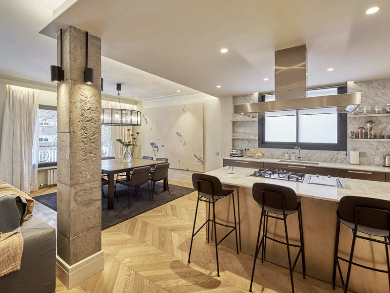 This wonderful flat is located in one of the most privileged areas of the city: the Dreta del Eixample. The building, which dates back to the end of the 19th century, has a wonderful façade and a mix of contemporary and timeless interiors. Here you can enjoy luxury urban living at its finest. This flat is located on the real third floor of the building and has 145 m2 built interior. With high ceilings, exposed brick walls and luxurious finishes, this flat is truly a dream home. It conveys the cultural and aesthetic appeal of Barcelona, providing an ideal setting in which to enjoy all that the city has to offer. The apartment has a spacious and tranquil living-dining room with an open-plan kitchen and central island, with access to a traditional Eixample gallery, facing the interior courtyard. It is an ideal place to create a more relaxed space for relaxation. The night area is made up of 2 double en-suite bedrooms: one with dressing room and access to a gallery, also facing the interior courtyard, and another interior bedroom. There is also a guest toilet at the entrance of the flat. The property features natural oak parquet flooring, top of the range appliances and air conditioning by aerothermal heating. The light-filled interior offers comfort and a tranquil atmosphere to relax in. Impeccable finishes and a tasteful, neutral colour palette allow new owners to effortlessly personalise their living space and make it their own. The building has a lift and concierge. This is an exceptional opportunity to create an urban home in a lively environment, with numerous amenities, excellent shopping, a variety of restaurants and many public transport options. In addition, it is next to the sought-after Paseo de Gracia and very close to the city centre. Please contact Bcn Advisors to visit this property.