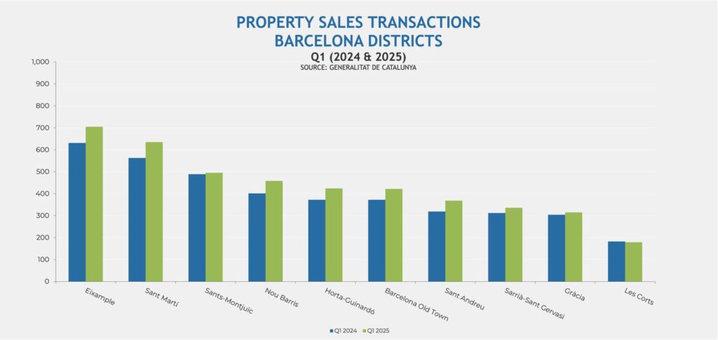 According to figures published by the Generalitat de Catalunya, where the latest data available is for the first quarter of 2025, the number of property transactions in the first quarter of 2025 within the city of Barcelona itself grew by 9.7% when compared to the same quarter in 2024, with 4,360 sales being registered from January to March 2025. The district of Sant Andreu, that combines a charming village atmosphere with modern urban renewal, registered the highest increase, where sales in the first quarter of 2025 rose by 15.4% when compared to the first quarter of 2024. Of the city’s ten districts, all but Les Corts registered an increase.