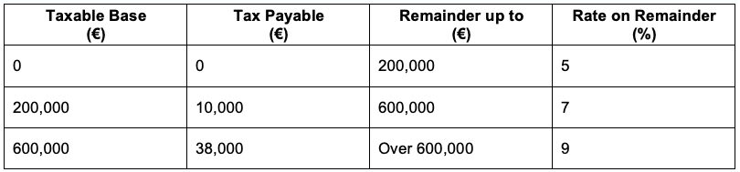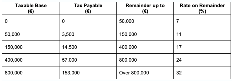 In certain cases, it might prove beneficial for a person to donate their assets to their descendants during their lifetime. Whilst the gift tax rates are similar to the inheritance tax rates, it is important to take into consideration that there is a reduced rate when the beneficiary belongs to either Group I or Group II. In order for this reduced rate to be applied the gift must be registered as a public deed before a Notary. The tax rates applicable are then as follows: