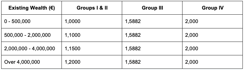 Once the relevant tax has been calculated the result is then multiplied by a coefficient determined by the existing wealth of the beneficiary, as well as the group to which they belong: