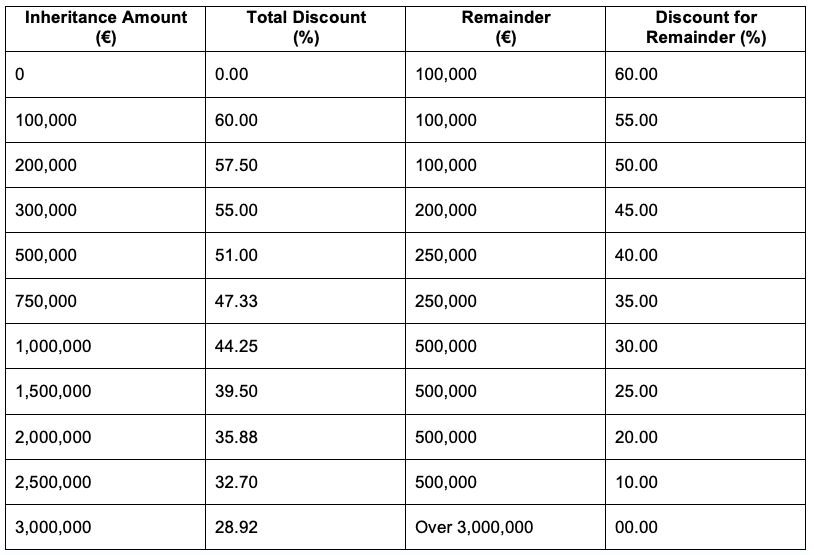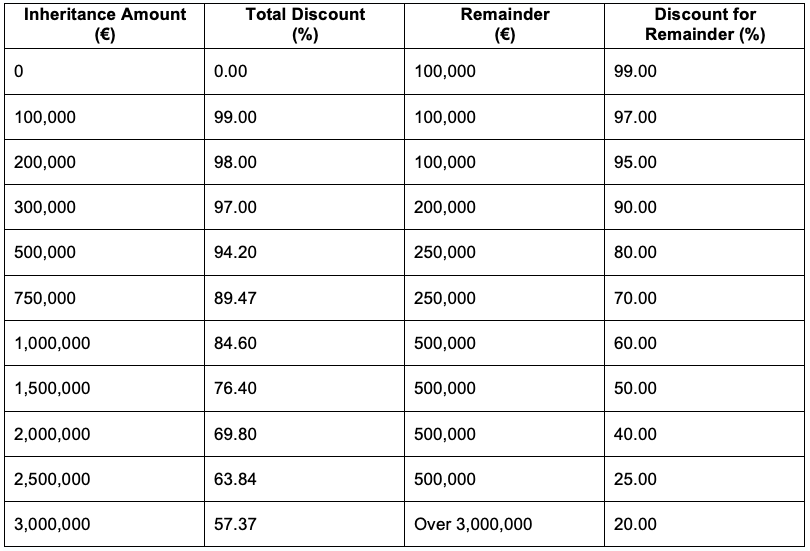 If a property inherited is the main residence, then a reduction of 95% of the value of the property (up to €500,000) may be applied when the beneficiary is the spouse, child or parent of the deceased, as well as a collateral relative, older than 65, who lived with the deceased during the two years prior to their death. If this reduction is applied then the property may not be sold for a period of five years.