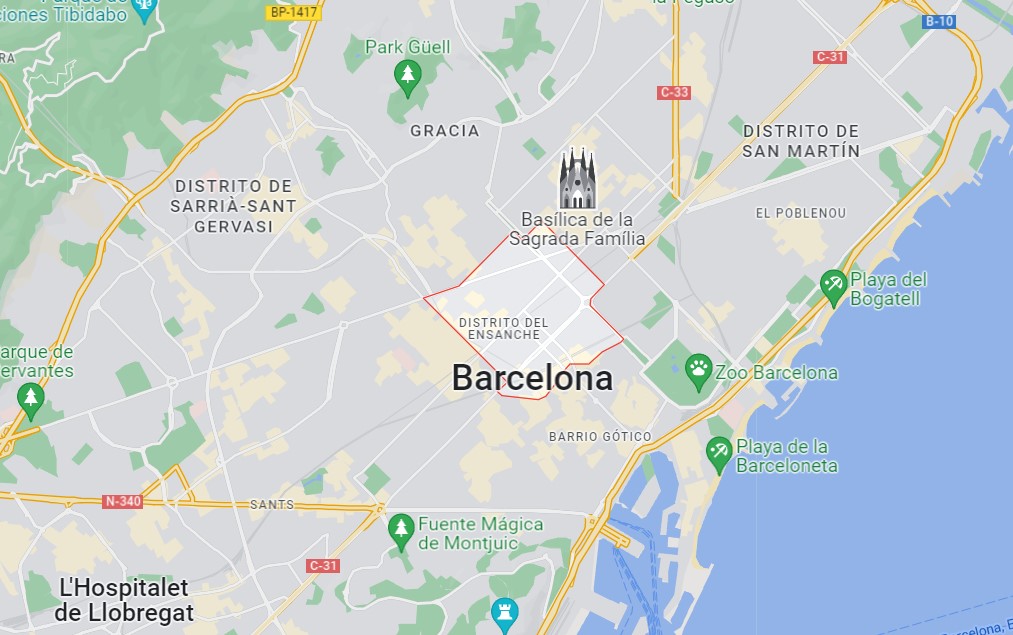 Sur le côté droit, vous verrez une carte avec la zone de L’Eixample Dreta surlignée en rouge afin que vous puissiez la localiser facilement. C’est l’un des six quartiers qui composent le quartier de L’Eixample, couvrant la zone la plus centrale de la ville.