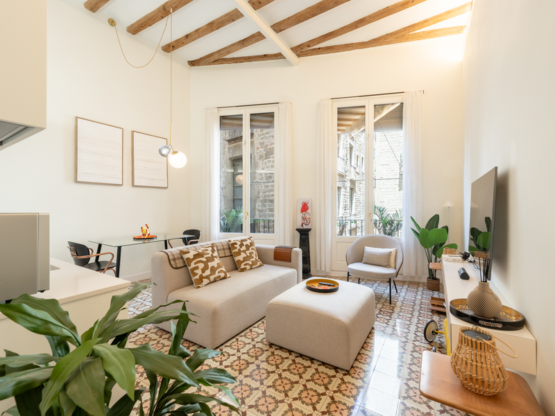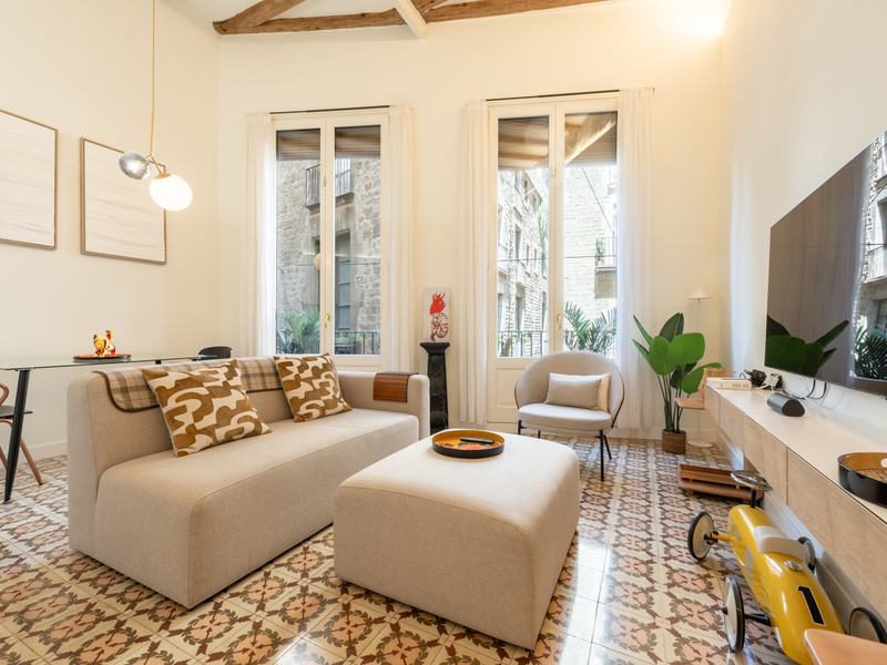 Ce superbe appartement, entièrement rénové en 2023 avec un goût exquis, se situe dans le quartier gothique de Barcelone, à proximité du Port Vell, du Soho House et de la mer. Il allie le charme historique et culturel du quartier à une excellente proximité avec le centre-ville, El Born et le Parc de la Ciutadella. Le bien se trouve au premier étage d’un immeuble historique sans ascenseur. Il offre 73 m² construits intérieurs, une terrasse intérieure de 12 m² et un balcon de 2 m2. Le salon-salle à manger avec cuisine ouverte et entièrement équipée est lumineux et donne accès à un balcon orienté vers une rue piétonne, avec espace pour une petite table et deux chaises. La chambre principale est une suite avec dressing sur mesure et salle de bain privative. À côté, on trouve un espace bureau ouvert menant à une seconde chambre double entourée par la terrasse intérieure, un endroit idéal pour se détendre en toute tranquillité et profiter de repas en plein air. La terrasse dispose d’un sol en bois ainsi que de points d’eau et d’éclairage. En complément, il y a une salle de bain indépendante et une buanderie. La rénovation a mis en valeur les éléments d’origine tels que les sols hydrauliques, les poutres en bois restaurées, la voûte catalane avec des plafonds de plus de 4 mètres de hauteur et un mur en briques apparentes dans la suite. Le salon et l’une des chambres sont équipés de fenêtres à triple vitrage, garantissant une excellente isolation. L’appartement est vendu entièrement meublé et dispose de la climatisation réversible par conduits. Le quartier offre tous les commerces, services, restaurants ainsi que de nombreuses options de transport public. N’hésitez pas à contacter Bcn Advisors pour organiser une visite.