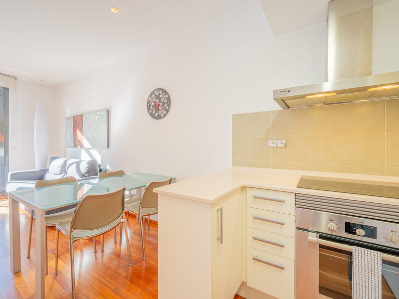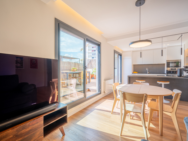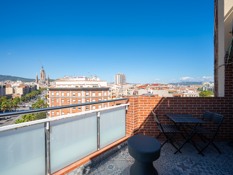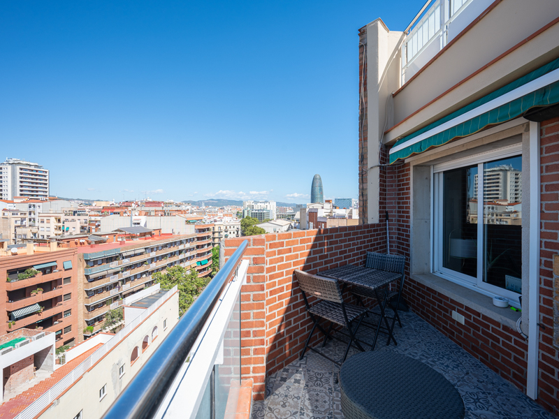 e penthouse avec 110 m2 d'intérieur construit et 28 m2 de terrasse est situé très près de la Plaça Glòries, La Sagrada Familia, Arc de Triomf et Gran Via. Le quartier dispose de tous les commerces et services nécessaires à la vie quotidienne, d'espaces verts dans les environs et d'un large éventail de transports publics. Le penthouse dispose d'un grand hall d'entrée et, à travers un couloir, on accède au salon-salle à manger. Il s'agit d'une pièce spacieuse, lumineuse et calme qui donne accès à une terrasse sensationnelle, un endroit idéal pour profiter des réunions en plein air avec des vues sur la Sagrada Familia, la ville et les montagnes. Son orientation sud est idéale pour profiter de la lumière naturelle presque toute la journée. La cuisine est ouverte sur le couloir. Quant aux chambres, il y a une chambre en suite à côté du salon, avec sa propre salle de bains et un accès à la terrasse ; une grande chambre double avec armoire encastrée à côté du hall et une salle de bains complète qui la dessert. Il y a également une buanderie et une pièce de rangement. Il est à noter qu'il serait possible de convertir la deuxième chambre en deux chambres simples. Le penthouse, situé au 9ème étage, est en parfait état grâce à sa rénovation moderne et est équipé d'un système d'air conditionné chaud/froid. Il est possible d'acheter le mobilier séparément en option. N'hésitez pas à contacter Bcn Advisors pour visiter ce penthouse.