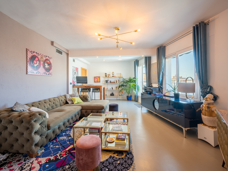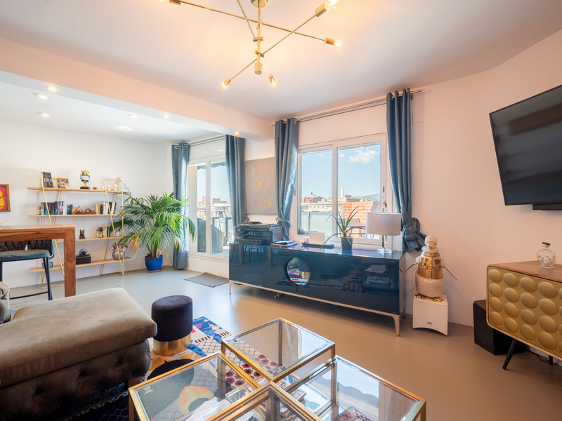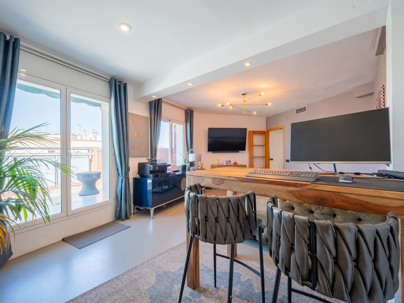 La lumière naturelle et la vue qu'offre ce penthouse sont pratiquement inégalées dans le quartier. Situé à proximité du Mercat de Sant Antoni, un marché historique, il occupe le sixième et dernier étage d'un immeuble moderne construit en 2000. De plus, le logement a fait l'objet d'une rénovation spectaculaire de haut standing en 2018, ce qui lui confère un excellent état et un confort optimal. Le penthouse a une superficie construite de 96 m². Un hall d'entrée avec des placards nous accueille et nous mène, sur la droite, au salon-salle à manger. C'est un espace extrêmement lumineux grâce à ses baies vitrées allant du sol au plafond, à son excellente orientation sud et au fait que l'immeuble est situé à l'angle. Les vues sont magnifiques et dégagées sur le Mercat de Sant Antoni, la ville et les montagnes. Dans le salon, il y a un coin séparé, actuellement utilisé comme bureau, qui pourrait devenir une autre pièce. La cuisine est ouverte, mais peut également être fermée par une porte coulissante en verre. La partie nuit comprend 3 chambres (dont deux donnant sur l'extérieur) et 2 salles de bains. La chambre principale dispose d'une salle de bains attenante et offre les mêmes vues fabuleuses que le salon-salle à manger. Il y a une autre chambre double donnant sur l'extérieur et une chambre simple donnant sur l'intérieur. Enfin, on trouve une salle de bains indépendante. L'appartement est équipé de sols en microciment et d'une climatisation réversible par conduits. L'immeuble dispose d'une terrasse commune offrant de très belles vues sur tout Barcelone, de deux ascenseurs, d'un concierge et d'un parking, où il est possible d'acheter une place en option pour 25 000 €. Vivre dans le quartier de Sant Antoni offre un mélange idéal entre tradition et modernité. Il se distingue par son ambiance paisible, son emplacement central et son excellente desserte vers le reste de la ville. Le marché emblématique, récemment rénové, sert de point de rencontre pour les habitants du quartier. De plus, il offre une offre gastronomique variée, des commerces de proximité et des zones piétonnes. C'est un quartier parfait tant pour les familles que pour les jeunes professionnels à la recherche d'une qualité de vie à Barcelone. N'hésitez pas à contacter Bcn Advisors pour visiter cette propriété.