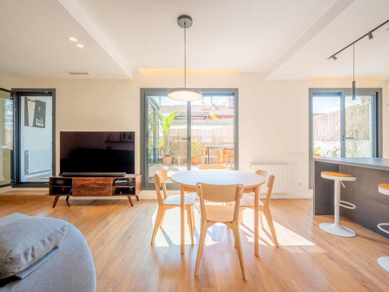 Ce magnifique appartement rénové en 2023 est situé dans le meilleur quartier de Vila de Gracia. La rénovation, du plus haut niveau et de l'efficacité énergétique, a maintenu et amélioré les éléments originaux tels que les plafonds voûtés catalans, les planchers hydrauliques, les murs en briques apparentes et la menuiserie. Il s'agit d'une propriété spectaculaire qui vous offre également une grande terrasse de 70 m2 pour profiter de l'extérieur comme vous le souhaitez. Cet appartement dispose de 140 m2 d'espace intérieur construit. La partie jour est un grand espace qui intègre le salon, la salle à manger, la cuisine ouverte (avec un garde-manger séparé devant) et une belle galerie qui a accès à la magnifique terrasse de 70 m2, qui incorpore une salle de stockage et une buanderie. Il est très ensoleillé grâce à sa parfaite orientation sud-est et au fait que les bâtiments environnants sont bas. Il est également calme car il donne sur la cour intérieure. Vous voudrez certainement y être pour rencontrer vos amis et votre famille, manger en plein air ou simplement vous détendre dans l'agréable climat méditerranéen de Barcelone. L'espace nuit est polyvalent et peut accueillir jusqu'à 5 chambres. Actuellement, il y a 3 chambres doubles (2 donnant sur la rue et une intérieure) ; une pièce ouverte actuellement utilisée comme aire de jeu qui pourrait être convertie en une quatrième chambre ou un deuxième salon ; et une pièce sur la galerie avec accès direct à la terrasse, idéale pour un bureau ou un espace de travail. Enfin, il y a deux salles de bains avec ventilation naturelle et sol hydraulique d'origine préservé, l'une avec douche et l'autre avec baignoire, et avec douche hygiénique dans les toilettes. La rénovation a été effectuée selon les normes les plus strictes en matière de qualité et d'économie d'énergie (efficacité C et B, car toute la climatisation est aérothermique, ce qui signifie que la propriété n'utilise pas de gaz), en incorporant le confort moderne au charme traditionnel de l'appartement. Les menuiseries d'origine, le mur en briques apparentes et les sols hydrauliques ont été restaurés. Les hauts plafonds de 3,3 mètres avec une combinaison de moulures et de voûtes catalanes ont également été conservés. L'appartement est équipé d'un chauffage et d'un refroidissement par le sol, d'une climatisation centralisée, de larges planches de parquet en chêne naturel combinées à des sols hydrauliques, de 6 ventilateurs Faro, de meubles de cuisine Rekker, d'appareils électroménagers haut de gamme Siemens et d'un système d'osmose. Cet appartement est situé au premier étage d'un immeuble royal avec ascenseur. De plus, l'immeuble dispose d'une terrasse commune sur le toit avec des vues spectaculaires sur Barcelone et la Sagrada Familia. La propriété est située dans un cadre idéal, loin de l'agitation des zones les plus commerciales du quartier de Gracia, mais avec tous les magasins locaux à proximité. Elle se trouve à quelques pas du Paseo de Gracia, de l'Avenida Diagonal et du Paseo Sant Joan, avec un large éventail de restaurants de qualité et la commodité d'un large éventail de transports publics, ainsi que tous les services dont vous avez besoin pour votre vie quotidienne. En outre, de nombreux parkings publics et privés se trouvent au coin de la rue. Cet appartement est une occasion extraordinaire d'acquérir une pièce unique avec des caractéristiques très recherchées et très difficiles à trouver dans le quartier de Gracia : une rénovation spectaculaire, des éléments originaux et une terrasse impressionnante. N'hésitez pas à contacter Bcn Advisors pour visiter cet appartement.