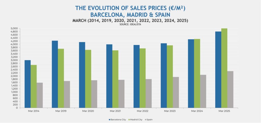 À Madrid, le prix moyen de l’immobilier a atteint 5 321 €/m² fin mars 2025, soit une hausse de 22,8 % en glissement annuel — nettement plus élevé que la moyenne barcelonaise.
