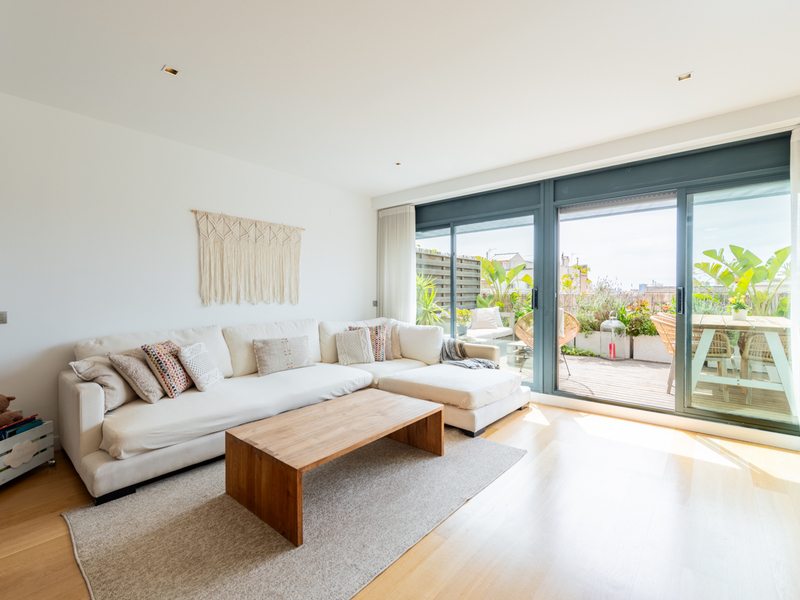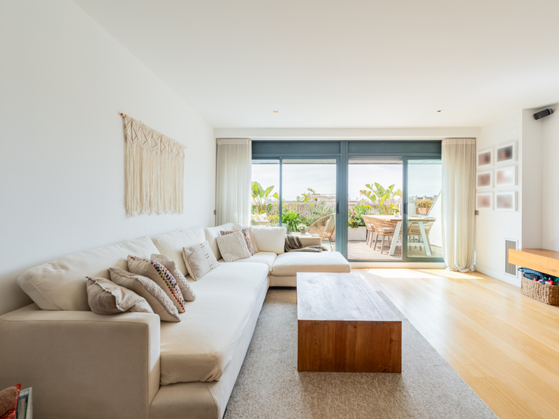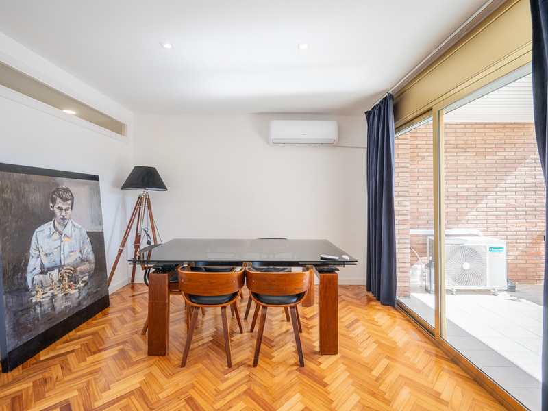 Ce magnifique appartement vous offre une magnifique et tranquille terrasse de 150 m2 pour profiter de l'extérieur pour des réunions animées, des repas, des jeux ou tout simplement pour se détendre. Il est situé dans l'Eixample, à côté du Paseo Sant Joan, entouré de nombreux magasins, services, restaurants et transports publics. La propriété, avec 86 m2 d'espace intérieur, est très calme, car elle donne sur une cour orientée à l'est. Il est situé au premier étage d'un immeuble avec 2 ascenseurs et concierge. La distribution de l'appartement est très carrée et permet de tirer le meilleur parti de l'espace. L'appartement nous accueille avec un grand hall ouvert avec une bibliothèque moderne encastrée. Le salon-salle à manger est grand et lumineux, avec un accès direct à la terrasse, qui dispose d'un gazon artificiel et d'un abri pour ranger les vélos et autres objets. La cuisine est équipée d'une plaque vitrocéramique à induction, d'un réfrigérateur Smeg et d'un lave-vaisselle Bosch, d'un plan de travail en Silestone gris et d'éléments laqués blancs. Il y a également une buanderie. L'espace nuit comprend 3 chambres et 2 salles de bains. La chambre principale dispose d'une salle de bains privative avec baignoire et donne sur le patio du bâtiment. La deuxième chambre est une chambre double avec des armoires encastrées et a accès à la terrasse. La troisième chambre est simple et dispose également de placards. L'appartement est équipé de sols en grès cérame gris foncé, d'un chauffage au gaz naturel et de portes laquées blanches. N'hésitez pas à contacter Bcn Advisors pour visiter cet appartement.