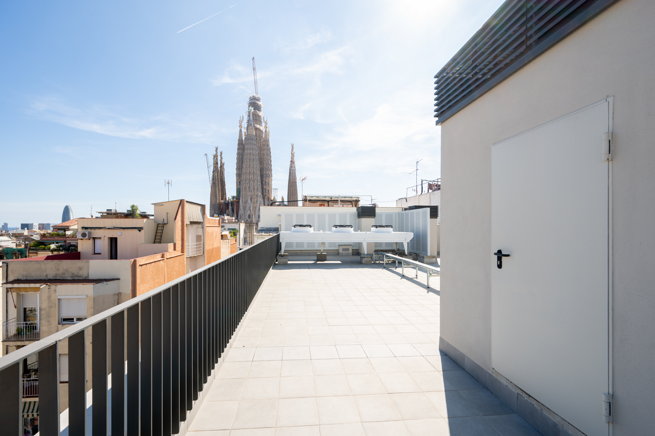 Situé au 5e étage et orienté vers l’extérieur, l’appartement offre une superficie totale de 130,9 m², répartis en 109,2 m² d’espace intérieur, une terrasse privée de 5,2 m² et 16,5 m² d’espaces communs. L’immeuble dispose également d’une impressionnante terrasse commune d’où vous pourrez contempler la ville dans toute sa splendeur : la Sagrada Familia au premier plan et les montagnes à l’horizon.