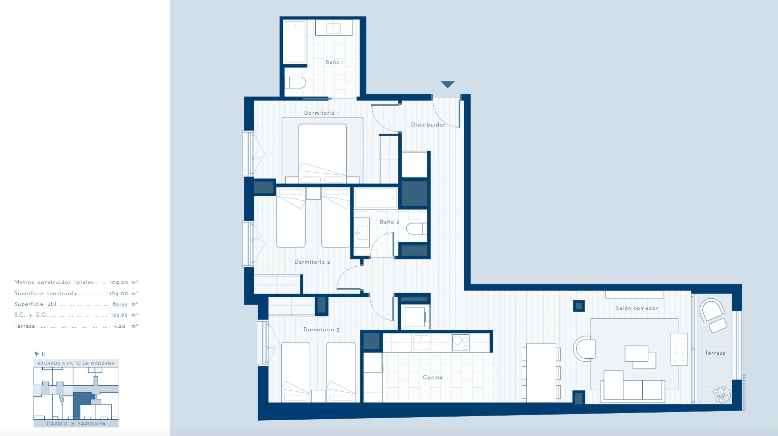 Cette propriété sensationnelle jouit d'un emplacement imbattable à Barcelone et fait partie d'un vaste projet de rénovation d'un bâtiment royal datant de 1910 et comprenant des appartements de luxe exclusifs. L'édifice se trouve à l'angle de la Carrer Girona, qui est déjà transformée en rue piétonne et dont les travaux sont pratiquement terminés, et de l'Avinguda Diagonal, qui est en train d'être transformée en une avenue de type boulevard avec une grande zone piétonne, des zones vertes et des pistes cyclables, ce qui réduit considérablement le trafic automobile. Vous pourrez profiter du meilleur de Barcelone dans un cadre incomparable : au cœur de l'Eixample, à proximité immédiate du Paseo de Gracia, du centre-ville et de tous les commerces et services. Cet appartement du premier étage dispose de 128,4 m2 d'espace intérieur et de 2 balcons d'une superficie totale de 4,7 m2. Comme il s'agit d'un bâtiment d'angle, il bénéficie d'une grande lumière naturelle, atypique dans le quartier, et de vues uniques avec beaucoup de profondeur. Un hall d'entrée donne sur le couloir, qui nous mène au spacieux salon-salle à manger de 29 m2, très lumineux et doté d'un balcon donnant sur la rue. La cuisine est indépendante et une buanderie se trouve à côté. Le coin nuit comprend 3 chambres. La sensationnelle suite parentale dispose d'un dressing à l'entrée, qui distribue la salle de bains privée et la chambre. Elle dispose d'un balcon donnant sur la rue. En outre, il y a deux chambres doubles intérieures et une salle de bains séparée. L'appartement, qui devrait être achevé au dernier trimestre 2024 et livré au premier trimestre 2025, sera doté de matériaux et de finitions de la plus haute qualité, ainsi que d'une décoration intérieure soignée dans les moindres détails, qui combinera les éléments classiques des édifices royaux avec les éléments les plus modernes. Les grands espaces et la luminosité seront importants, car ils permettront de trouver un équilibre entre les éléments traditionnels tels que les plafonds voûtés catalans restaurés et le confort et les équipements d'un nouveau bâtiment : chauffage par le sol et air conditionné chaud et froid canalisé alimenté par l'aérothermie (la dernière technologie en matière de systèmes de climatisation qui permet de réaliser des économies d'énergie de 60 à 70 % par rapport aux systèmes conventionnels), appareils électroménagers Siemens haut de gamme, parquet en bois naturel, porte d'entrée avec serrure de sécurité, armoires encastrées, carrelage en porcelaine sur les murs de la salle de bains, robinetterie italienne design, éclairage LED, connexion par fibre optique, prises de signal Internet et TV, etc. L'immeuble, qui sera entièrement rénové, disposera de 2 ascenseurs (l'original restauré en respectant sa cabine en bois avec un nouveau mécanisme et un autre entièrement neuf), d'un concierge, d'une zone de recharge pour les vélos électriques et d'un gymnase privé de style moderniste-vintage avec voûte catalane, sols hydrauliques et salle de bain complète. La vaste façade principale du bâtiment, ainsi que les nombreuses cours intérieures et la façade arrière, assurent au bâtiment un excellent éclairage et une bonne ventilation. La distance inhabituelle entre les bâtiments parallèles à la façade renforce encore la sensation et la perception d'espace. Comme il s'agit d'un bâtiment moderniste ayant une valeur historique importante, l'équipe chargée de l'aménagement intérieur a donné la priorité à la récupération de certains éléments d'origine. Par exemple, une restauration complète et une réhabilitation des stucs modernistes du cœur de l'escalier ont été effectuées ; et dans les vestibules indépendants, des carreaux de mosaïque hydraulique récupérés seront installés pour maintenir la valeur historique de la propriété. En outre, la menuiserie extérieure a été remplacée par des fenêtres et des balcons en bois avec rupture de pont thermique et verre isolant feuilleté. Ce projet comprend des appartements de 1, 2 et 3 chambres dont les prix commencent à 522 000 €, 603 480 € et 938 840 €, respectivement. Contactez Bcn Advisors pour plus d'informations. * Les plans et les mètres carrés présentés dans les annonces peuvent être modifiés. Ces images sont purement informatives et peuvent changer en fonction des besoins des clients ou des modifications qui peuvent être apportées au cours du processus d'exécution du projet de rénovation et/ou des travaux du projet. * Le plan et le contenu de les annonces n'est pas un document contractuel, il fait partie du projet exécutif et peut faire l'objet de modifications en raison d'exigences techniques, de l'administration ou d'organismes publics. Les surfaces seront provisoires. L'ameublement (y compris la cuisine), le jardinage et les éléments accessoires sont donnés à titre indicatif.