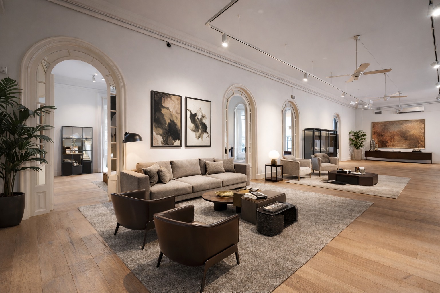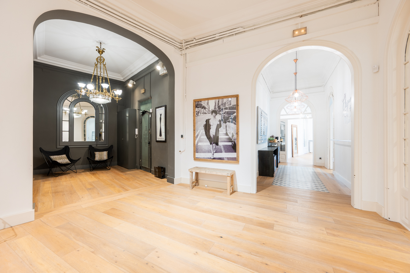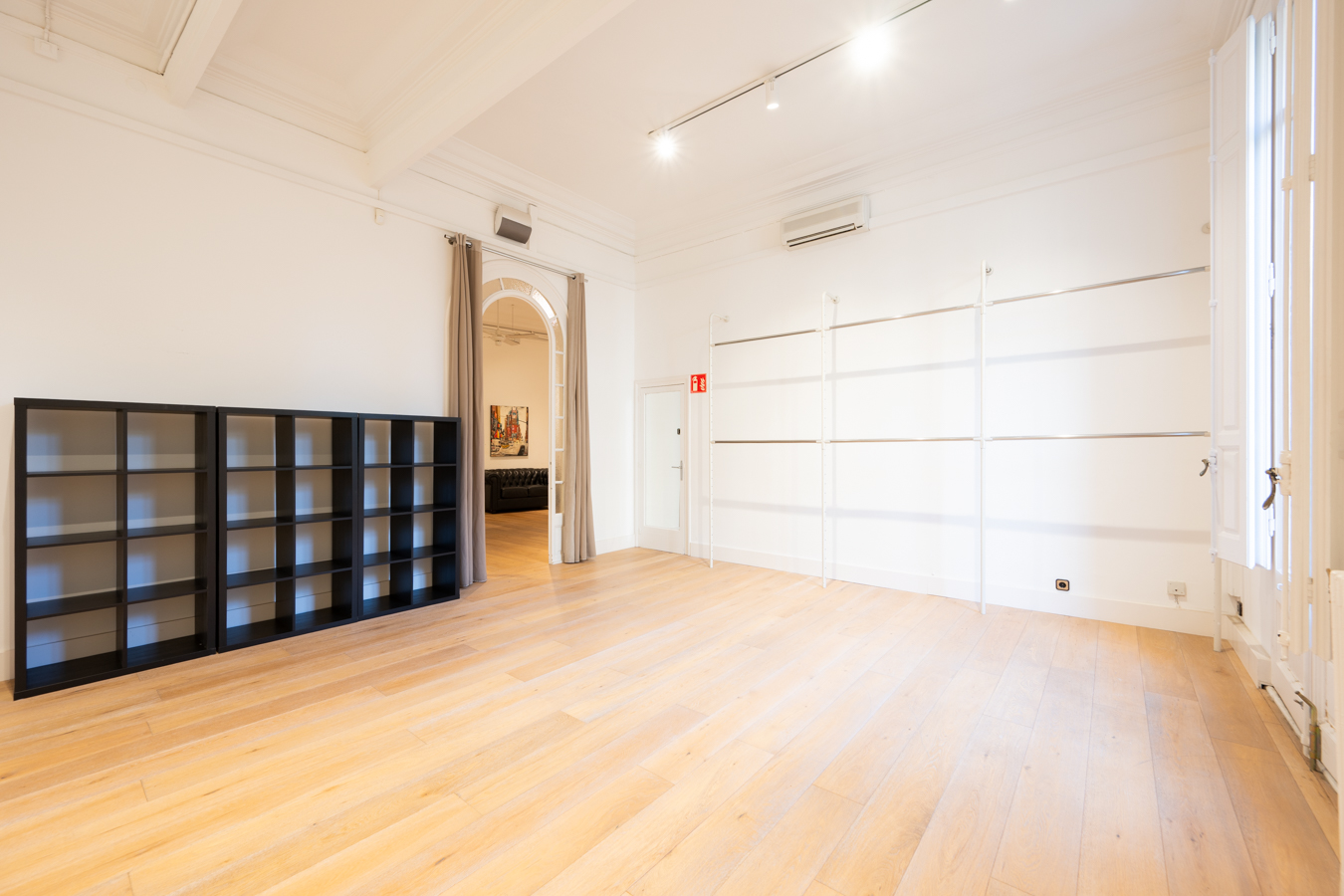 Conçue à l’origine comme logement résidentiel, elle a été utilisée ces dernières années comme showroom prestigieux, préservant la grandeur de ses espaces et l’harmonie parfaite de ses éléments d’origine : superbes parquets en bois (avec possibilité de carreaux hydrauliques d’origine en dessous), hauts plafonds ornés de moulures sophistiquées et les caractéristiques voûtes catalanes qui définissent l’architecture noble de l’immeuble. La climatisation est installée dans tout l’appartement via des unités split discrètes.