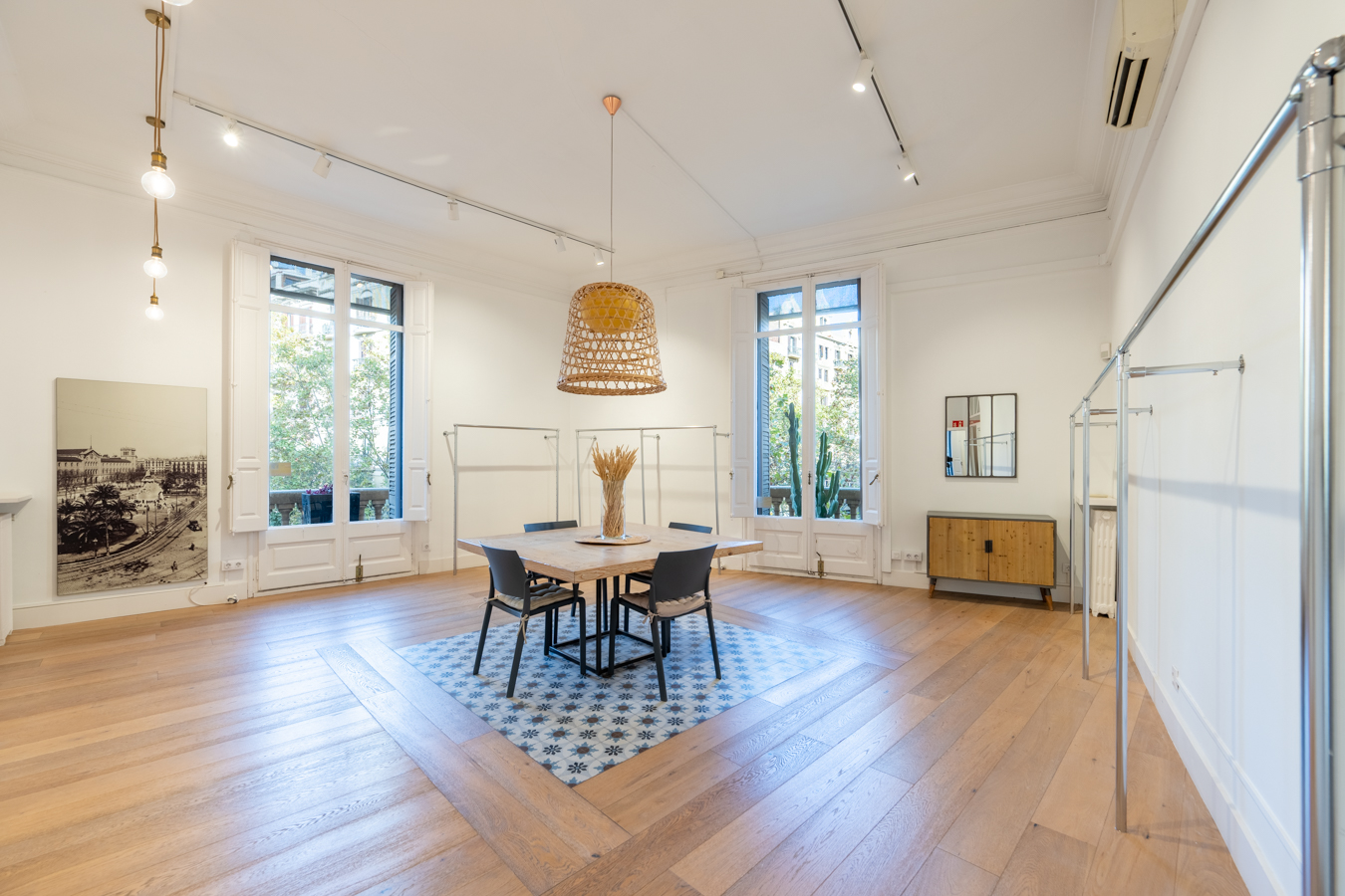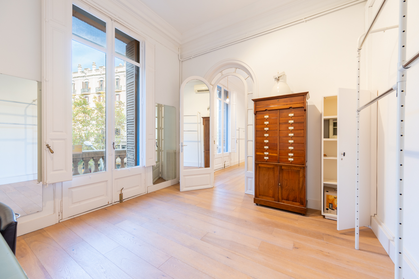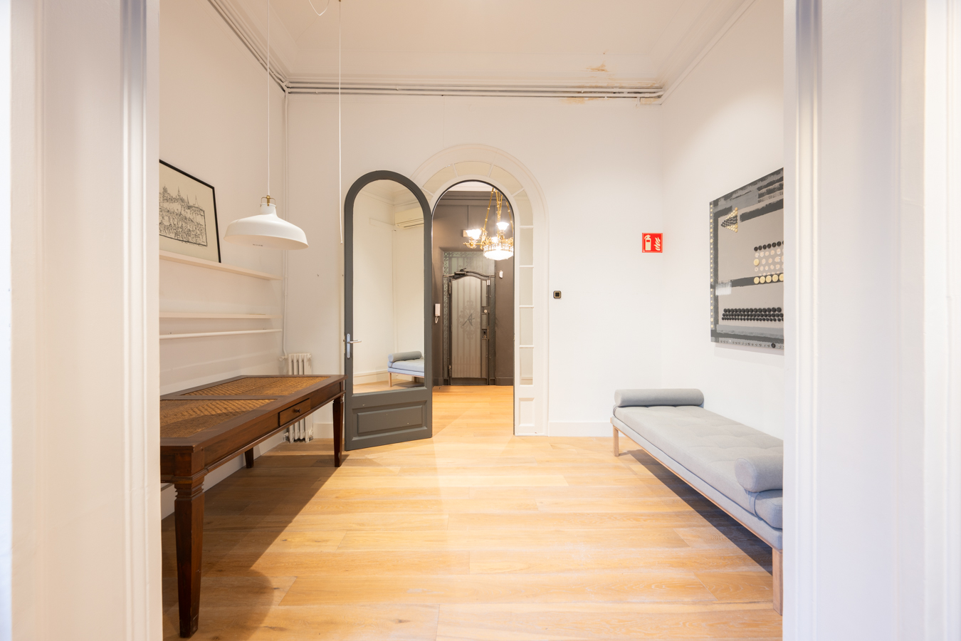 Conçue à l’origine comme logement résidentiel, elle a été utilisée ces dernières années comme showroom prestigieux, préservant la grandeur de ses espaces et l’harmonie parfaite de ses éléments d’origine : superbes parquets en bois (avec possibilité de carreaux hydrauliques d’origine en dessous), hauts plafonds ornés de moulures sophistiquées et les caractéristiques voûtes catalanes qui définissent l’architecture noble de l’immeuble. La climatisation est installée dans tout l’appartement via des unités split discrètes.