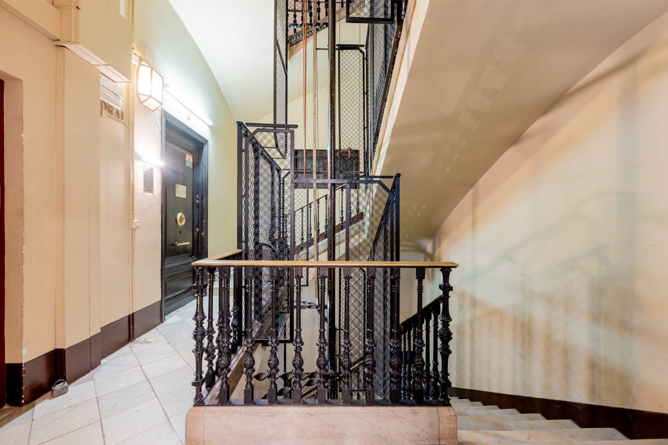 Dès l’entrée, un vaste hall de réception s’ouvre directement sur un impressionnant salon central – un espace véritablement spectaculaire baigné de lumière naturelle – qui constitue le cœur de la demeure et distribue l’accès à six grandes chambres extérieures. Ce magnifique hall central, avec ses proportions imposantes et son élégance intemporelle, mène également à une zone cuisine et à une terrasse intérieure centrale offrant des vues sereines sur la cour intérieure tranquille de l’immeuble.