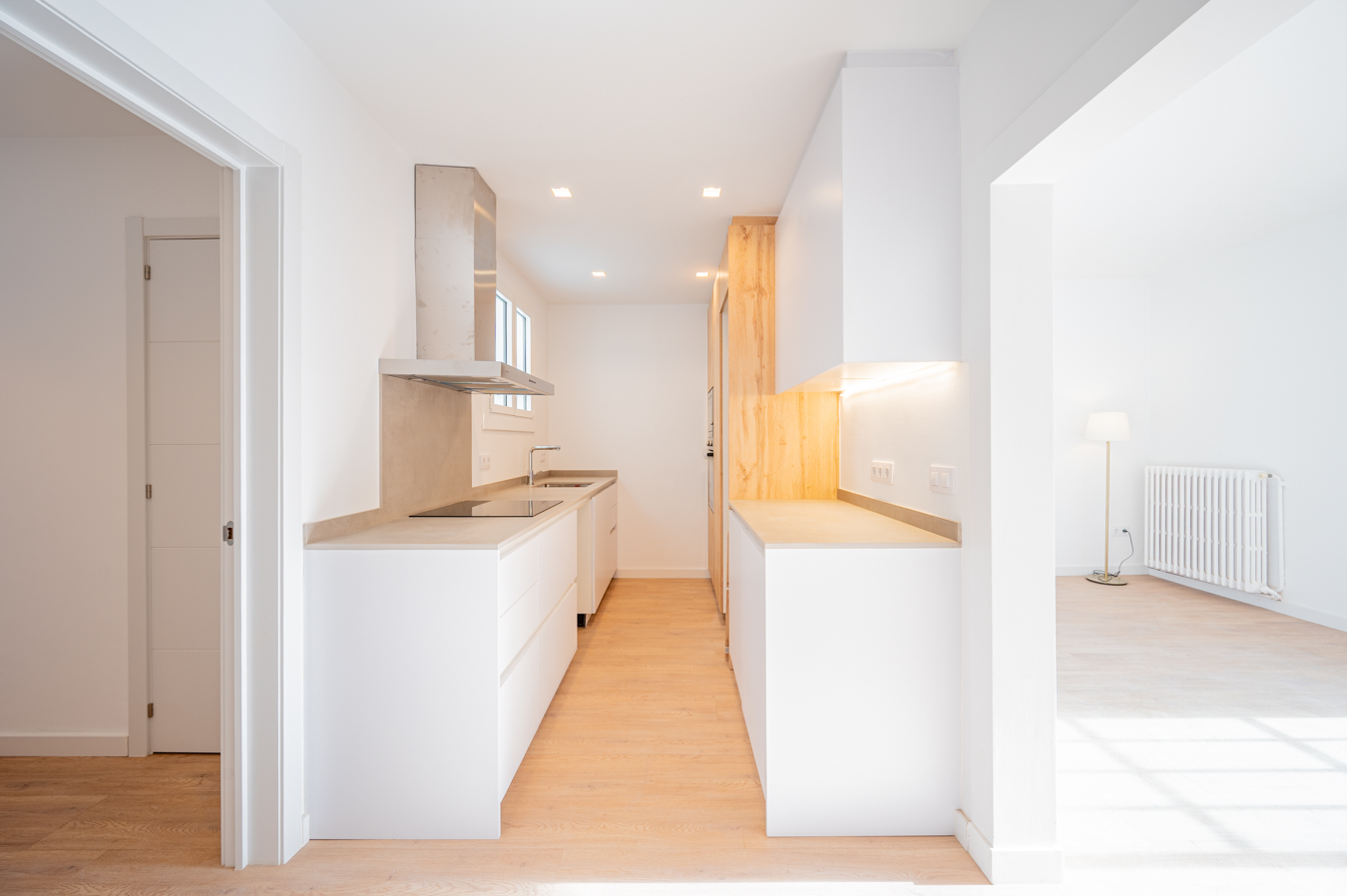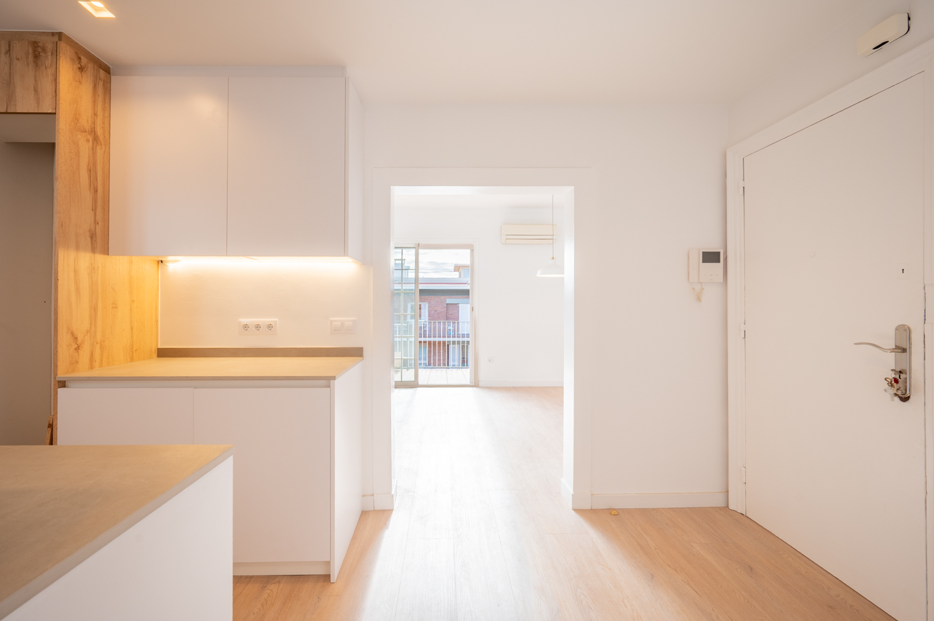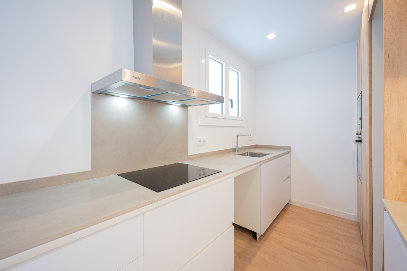 Le hall d’entrée nous conduit à la zone jour, formée par un salon-salle à manger accueillant et lumineux et une cuisine semi-ouverte qui occupe son propre espace séparé et est équipée d’une plaque de cuisson à induction, d’un four et d’un micro-ondes. Le salon a accès à une agréable terrasse donnant sur la rue.