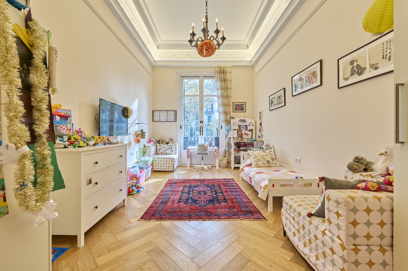 Cette spectaculaire propriété, bénéficiant d’une rénovation de luxe, dispose d’une très vaste surface intérieure construite de 290 m² et de deux terrasses totalisant 28 m². Elle est située dans la partie haute de la Dreta de l’Eixample, à quelques pas de l’Avinguda Diagonal et du Passeig de Sant Joan, et près du Passeig de Gràcia ainsi que des quartiers de Gràcia et de la Sagrada Família. L’appartement se trouve au cinquième étage d’un immeuble classique en angle. Il possède deux entrées. La zone de jour est un espace impressionnant qui intègre le salon-salle à manger, une cuisine ouverte avec îlot central, un espace office avec cave à vin et une pièce de rangement. L’ensemble bénéficie d’une lumière naturelle exceptionnelle grâce à son excellente orientation sud. Le salon-salle à manger donne accès à une agréable terrasse offrant de merveilleuses vues sur la ville, l’endroit parfait pour prendre un verre, petit-déjeuner, déjeuner, passer du temps avec vos proches ou simplement vous détendre. La zone de nuit comprend 4 chambres doubles et 3 salles de bains. La magnifique suite parentale dispose d’un accès à une deuxième terrasse donnant sur la rue, d’un dressing et d’une salle de bains privée. Parmi les autres chambres, deux sont également extérieures et lumineuses, et une est intérieure. L’appartement est équipé de matériaux de premier ordre : parquet, climatisation chaud/froid par conduits, placards intégrés et électroménagers haut de gamme. L’immeuble date de 1940, possède un escalier représentatif et dispose de 2 ascenseurs ainsi que d’un service de conciergerie. Le prix inclut un débarras de 9 m². Des places de parking en location sont disponibles dans le même immeuble. Les environs de cet appartement offrent une infinité de services et commerces, des boutiques de quartier aux marques les plus prestigieuses ; un large choix de restaurants ; les loisirs et bars du quartier de Gràcia ; ainsi qu’une excellente connexion en transports publics, avec la station de métro Verdaguer à quelques mètres. N’hésitez pas à contacter Bcn Advisors pour visiter cet appartement.