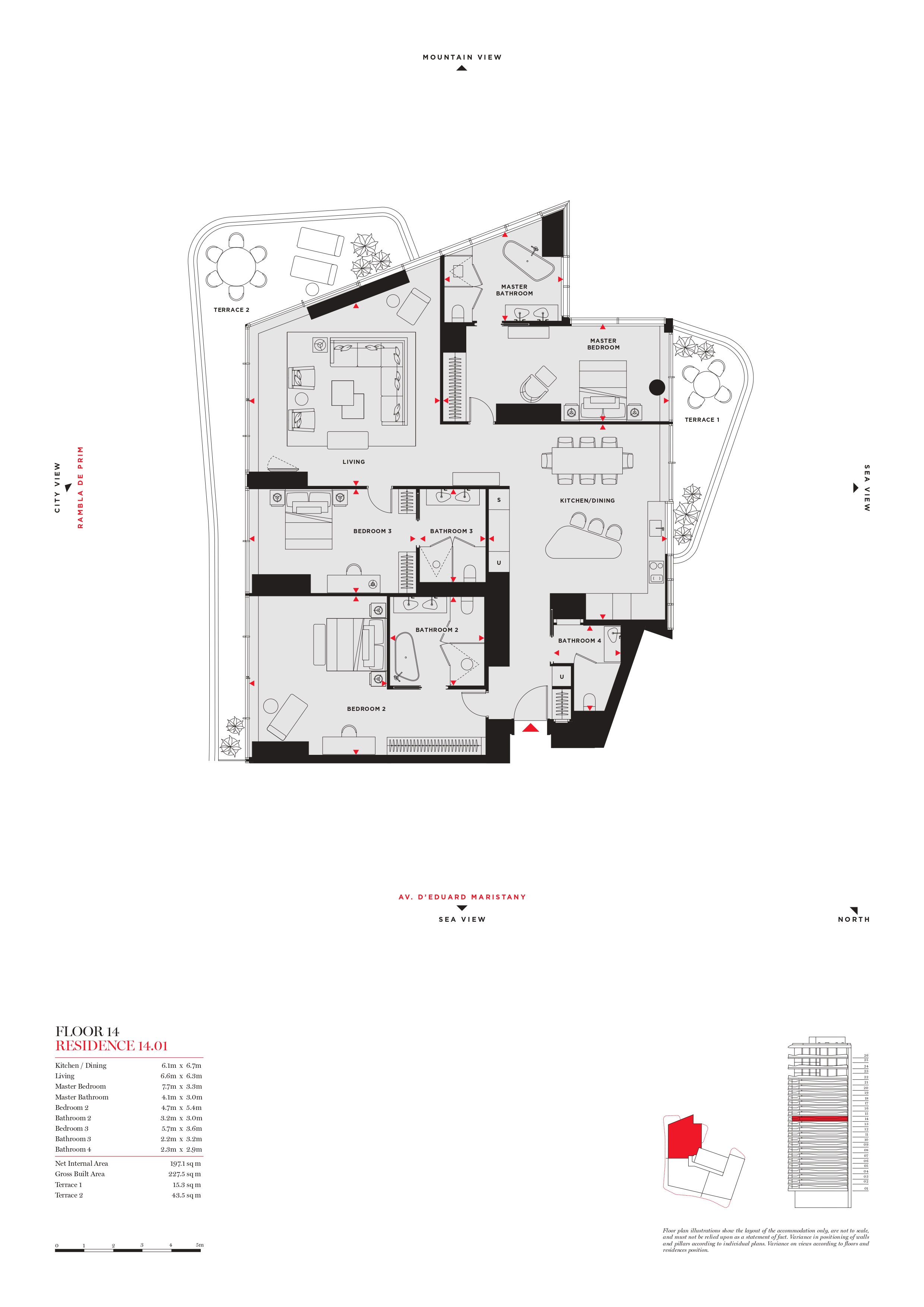 La zone jour est divisée en deux pièces reliées mais bien différenciées : le salon, qui a accès à la grande terrasse avec vue sur les montagnes et la ville, et la salle à manger avec cuisine ouverte, qui a accès à l’autre terrasse avec vue sur la mer. L’espace nuit est dominé par la suite principale avec un grand dressing et une salle de bain avec douche et baignoire. Il a accès à la terrasse orientée vers la mer et offrant une vue sur les montagnes. Les deux autres chambres en suite ont accès à la grande terrasse et il y a également une salle de bain séparée.