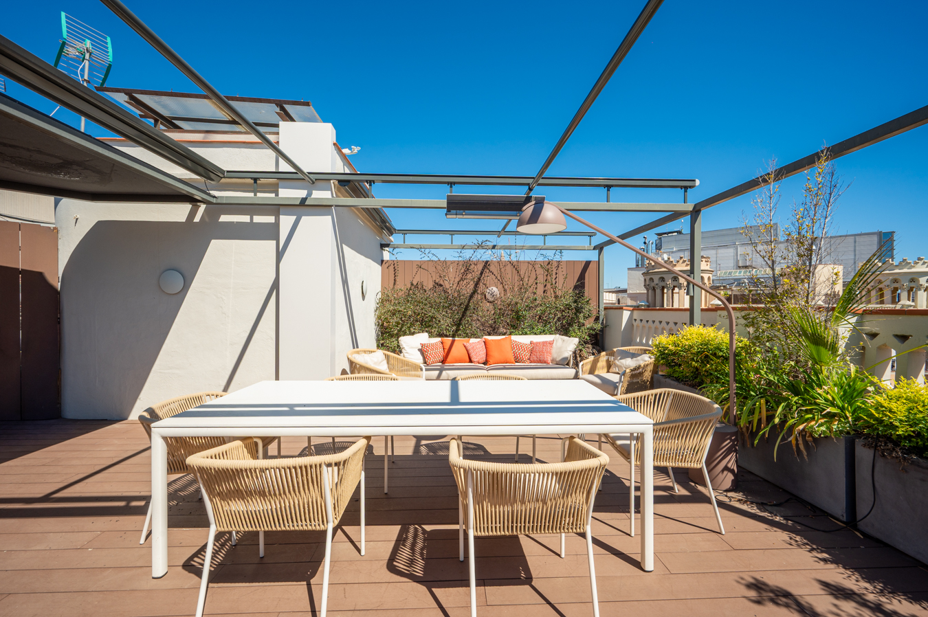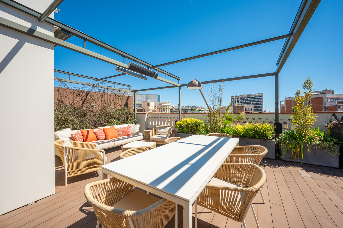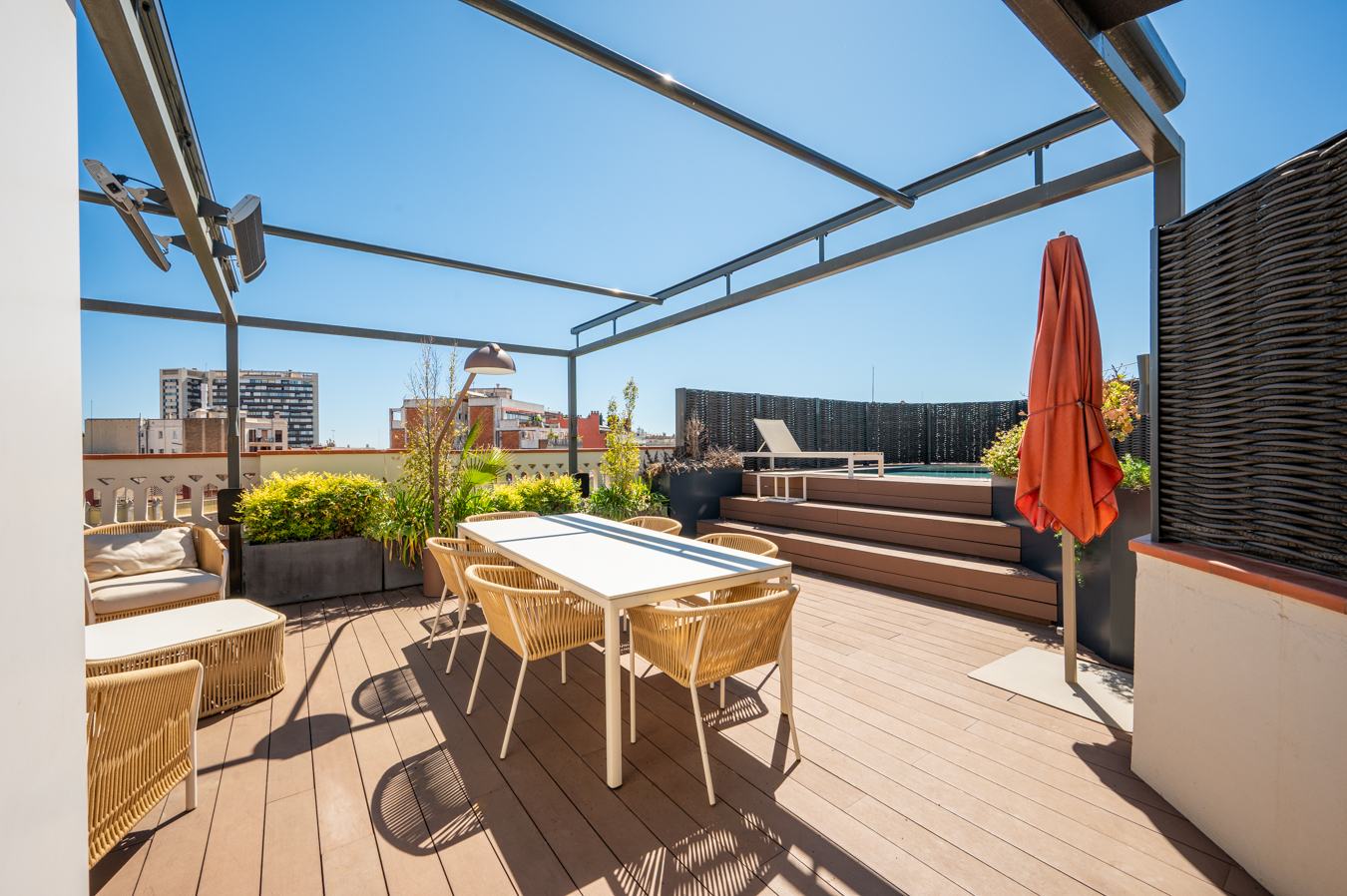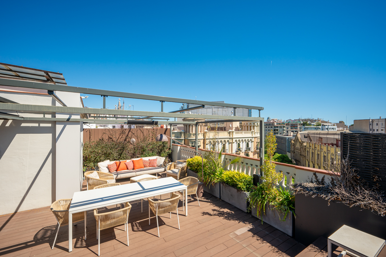 Depuis un escalier situé dans le bureau, on accède à la magnifique terrasse, véritable oasis en plein cœur de la ville et un privilège dans un quartier aussi prisé que l’Eixample Dreta. Son orientation est excellente, avec du soleil toute la journée et une vue sur tous les bâtiments historiques du quartier, et même jusqu’à la mer. Elle dispose d’une cuisine d’été, d’un coin repas chill-out, d’un barbecue et d’une piscine.