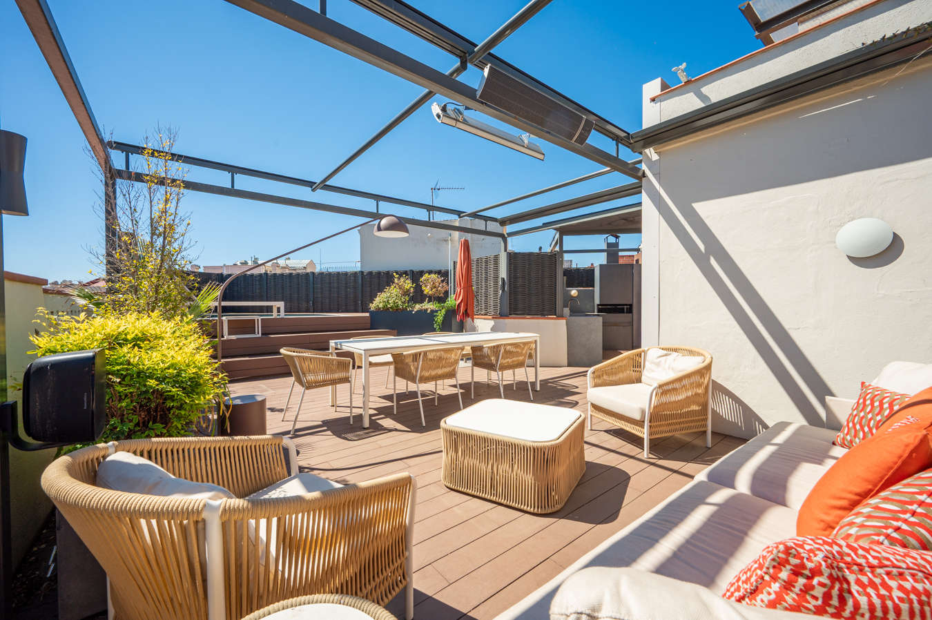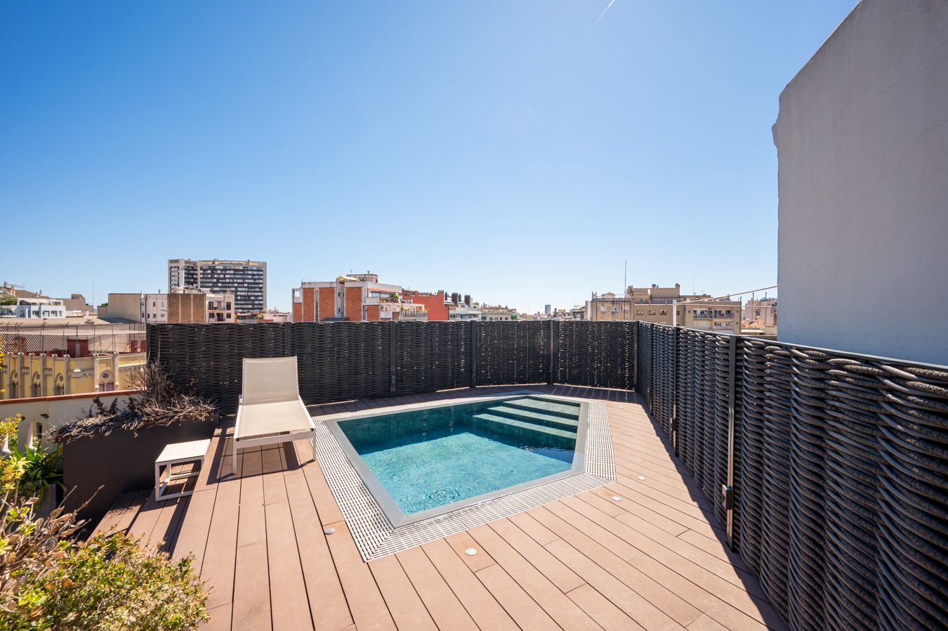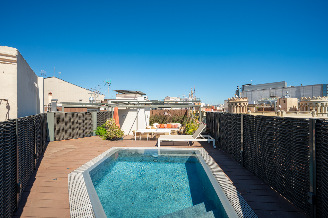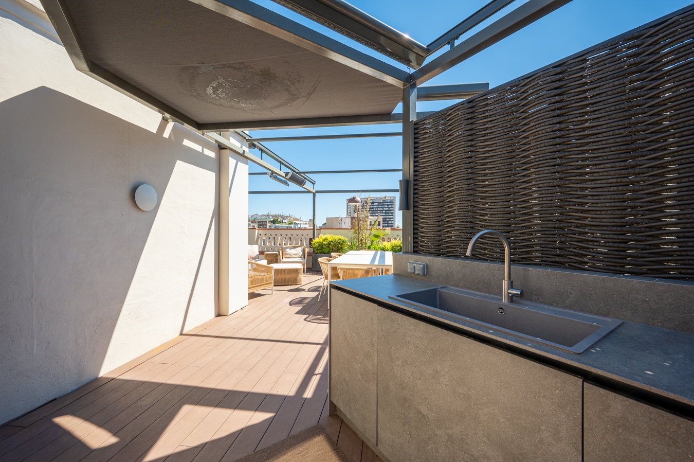 Depuis un escalier situé dans le bureau, on accède à la magnifique terrasse, véritable oasis en plein cœur de la ville et un privilège dans un quartier aussi prisé que l’Eixample Dreta. Son orientation est excellente, avec du soleil toute la journée et une vue sur tous les bâtiments historiques du quartier, et même jusqu’à la mer. Elle dispose d’une cuisine d’été, d’un coin repas chill-out, d’un barbecue et d’une piscine.