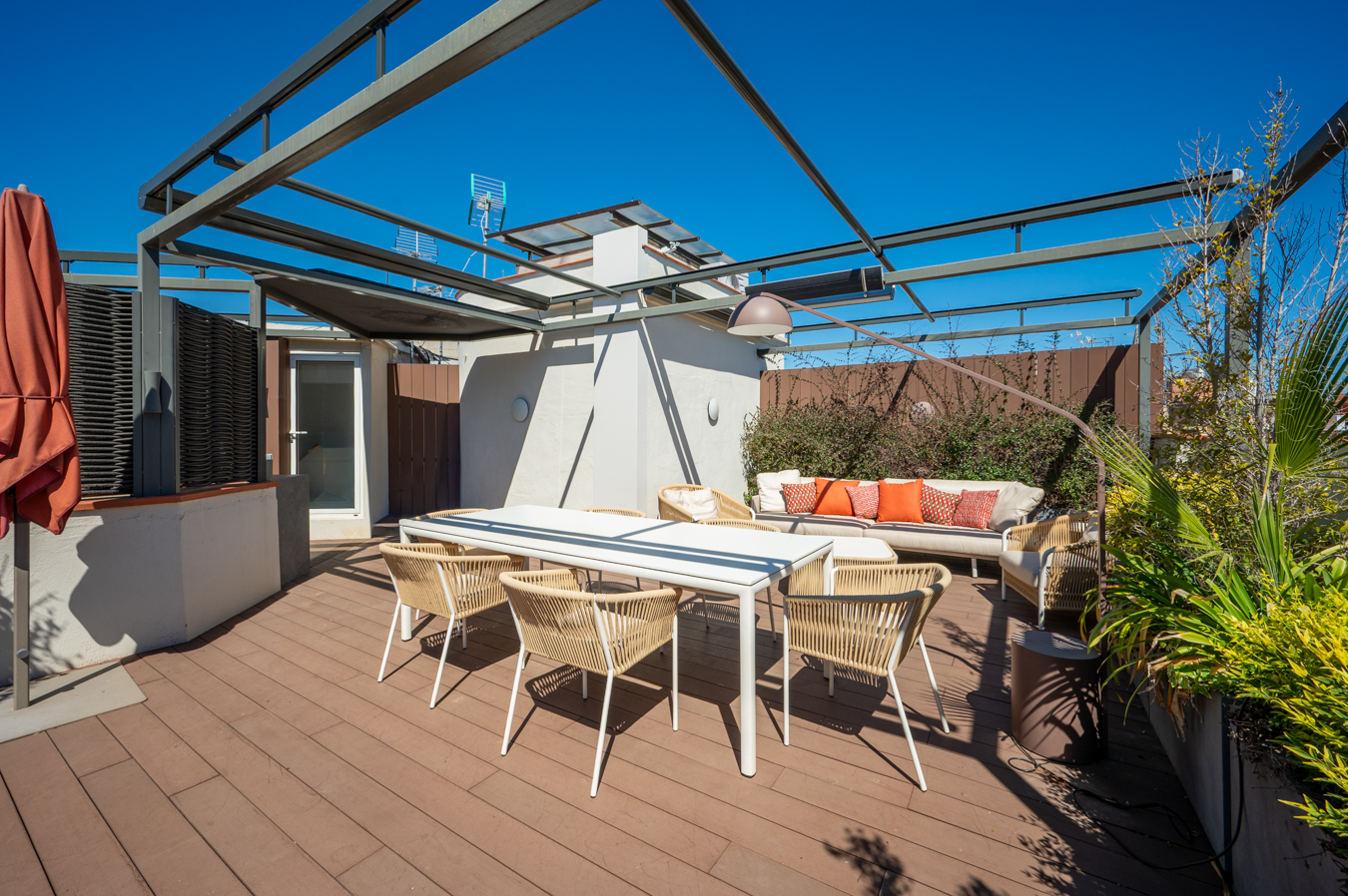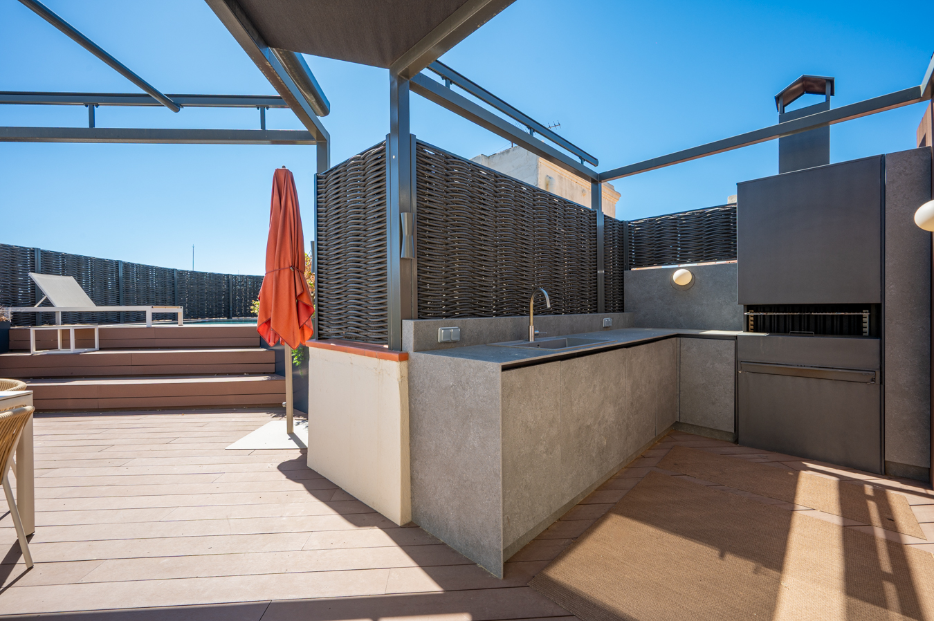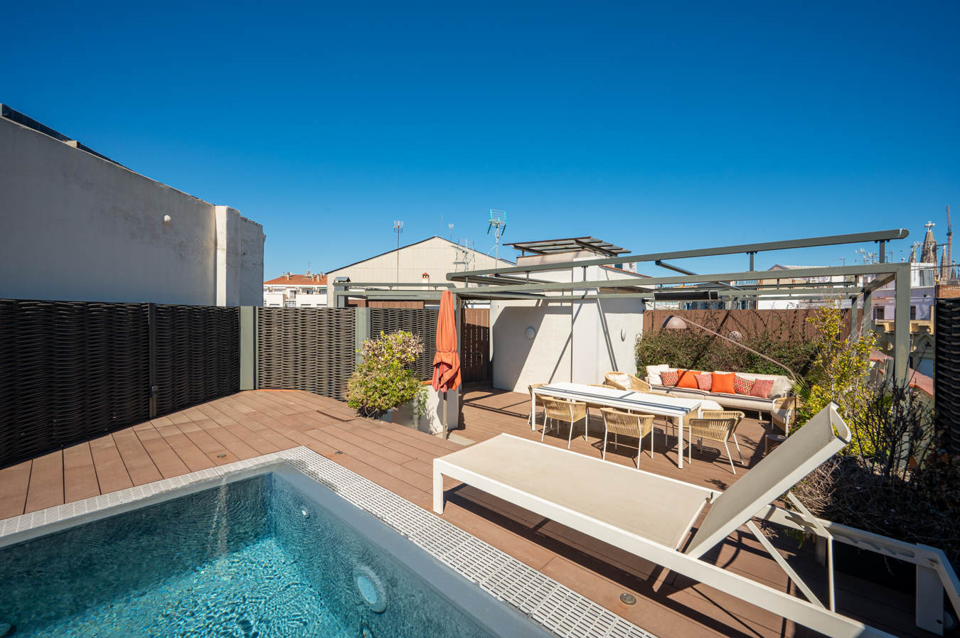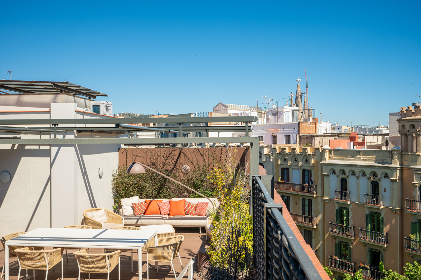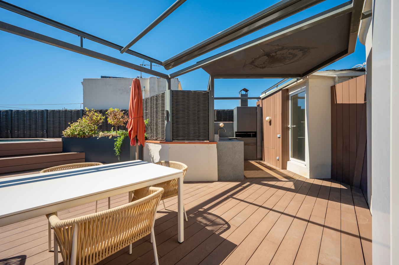 Depuis un escalier situé dans le bureau, on accède à la magnifique terrasse, véritable oasis en plein cœur de la ville et un privilège dans un quartier aussi prisé que l’Eixample Dreta. Son orientation est excellente, avec du soleil toute la journée et une vue sur tous les bâtiments historiques du quartier, et même jusqu’à la mer. Elle dispose d’une cuisine d’été, d’un coin repas chill-out, d’un barbecue et d’une piscine.
