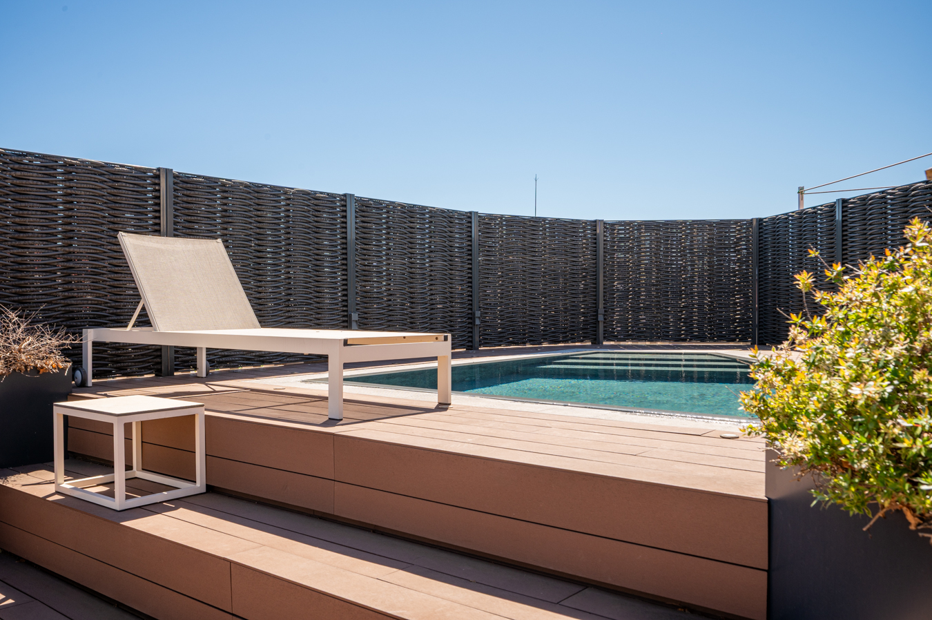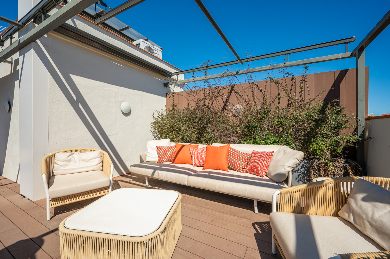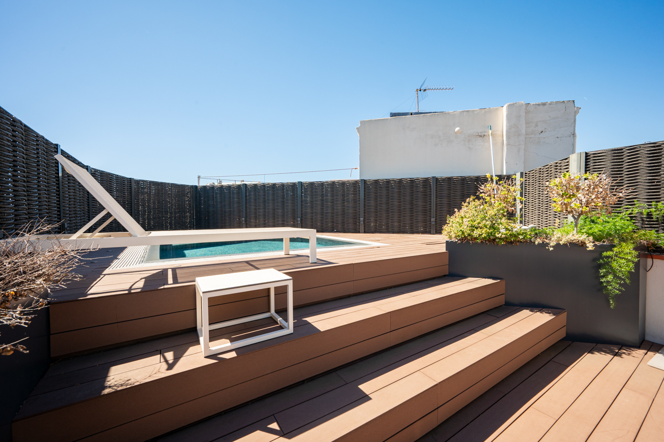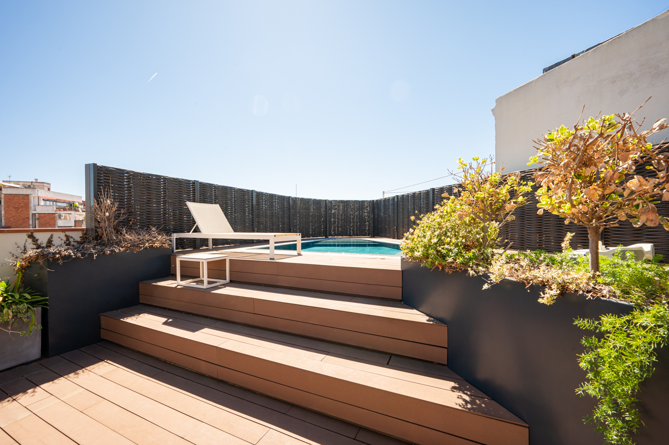 Depuis un escalier situé dans le bureau, on accède à la magnifique terrasse, véritable oasis en plein cœur de la ville et un privilège dans un quartier aussi prisé que l’Eixample Dreta. Son orientation est excellente, avec du soleil toute la journée et une vue sur tous les bâtiments historiques du quartier, et même jusqu’à la mer. Elle dispose d’une cuisine d’été, d’un coin repas chill-out, d’un barbecue et d’une piscine.