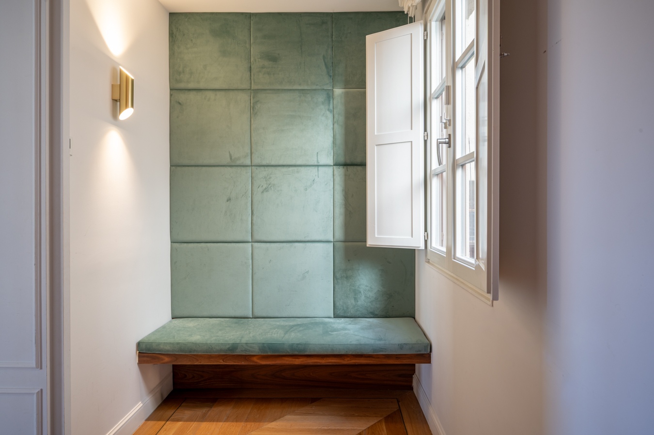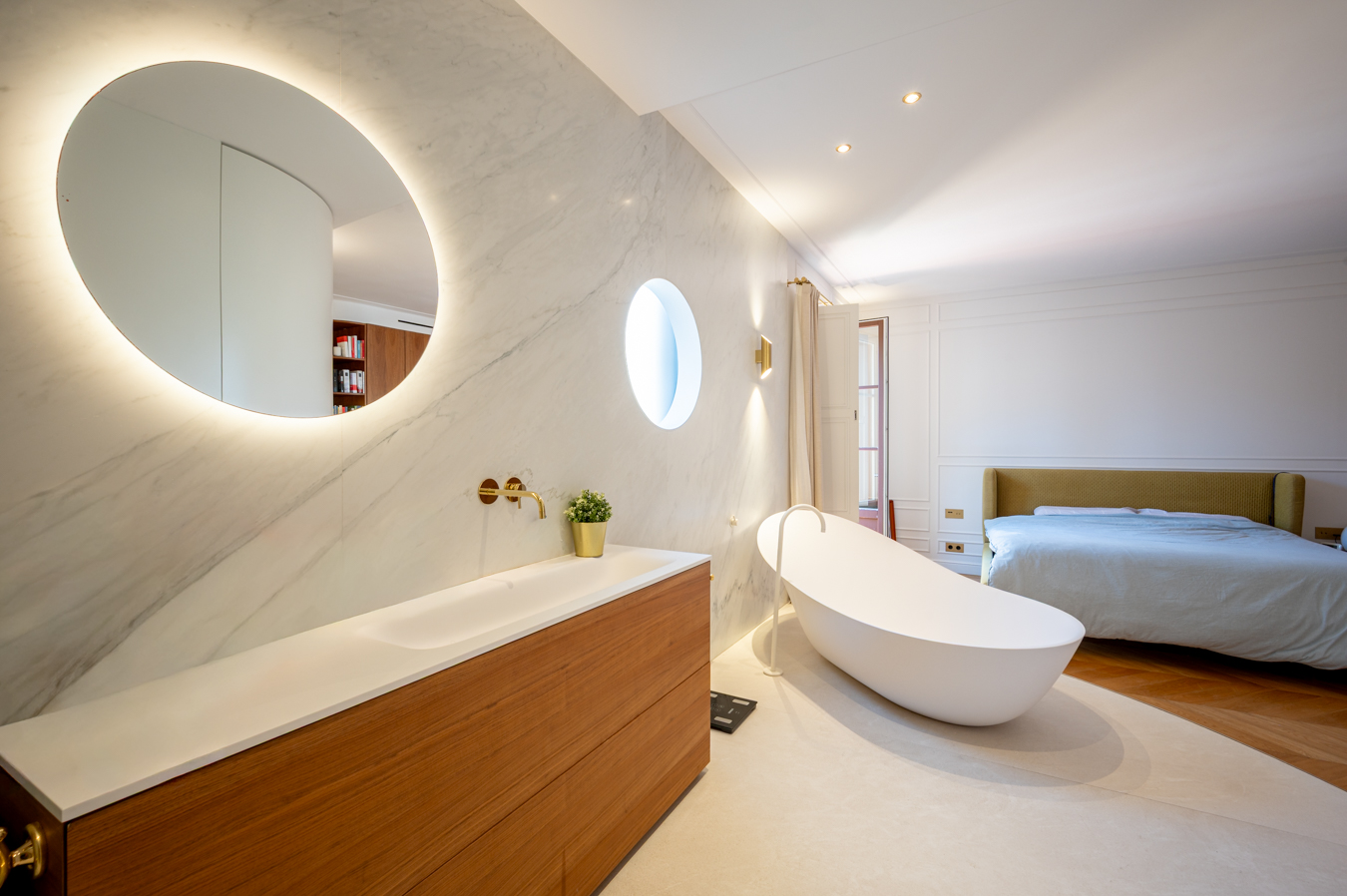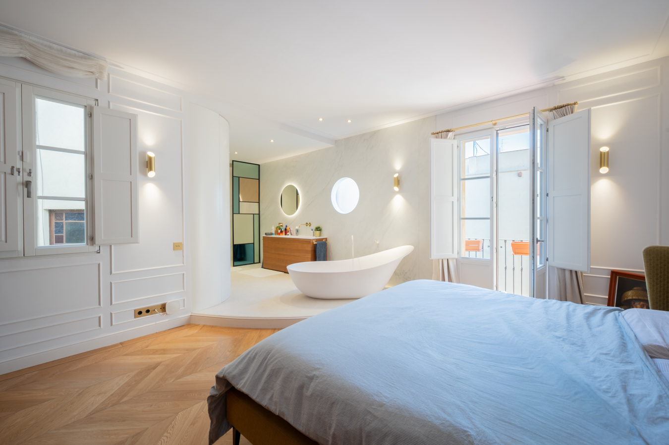 La partie nuit comprend 3 chambres doubles en suite (chacune avec sa salle de bains privée), un bureau et une salle de bains indépendante. Il serait possible d’ajouter une quatrième chambre en effectuant quelques travaux. La chambre principale est très calme. Elle dispose d’un grand dressing, d’une baignoire îlot, d’une douche et d’un accès à un balcon donnant sur une cour intérieure. Les deux autres chambres donnent sur la rue : l’une dispose d’un balcon et l’autre d’une grande baie vitrée.