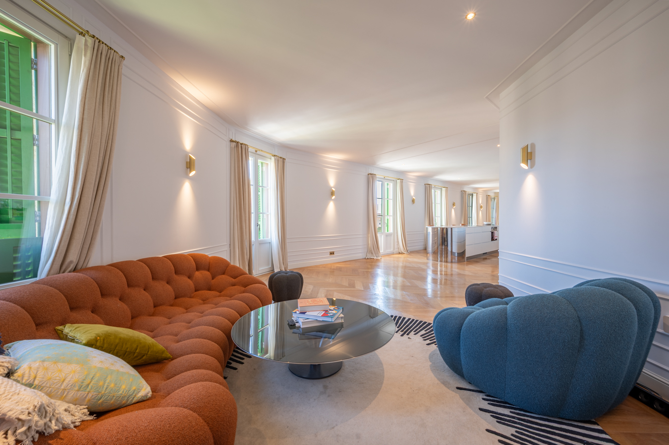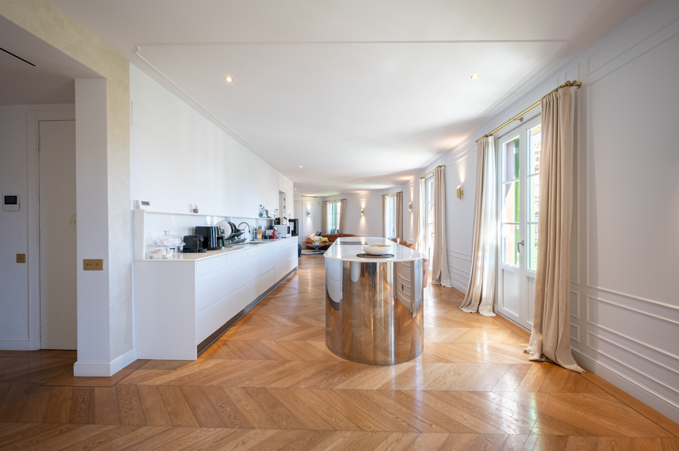L’espace de vie impressionne dès que l’on y met les pieds. Elle occupe tout l’angle et dispose de 5 balcons, ce qui lui confère une sensation unique d’espace et de lumière naturelle. Elle se compose de trois espaces : le salon, la cuisine ouverte avec îlot central et la salle à manger. Un cadre idéal pour profiter de votre quotidien dans un espace généreux et un confort maximal.